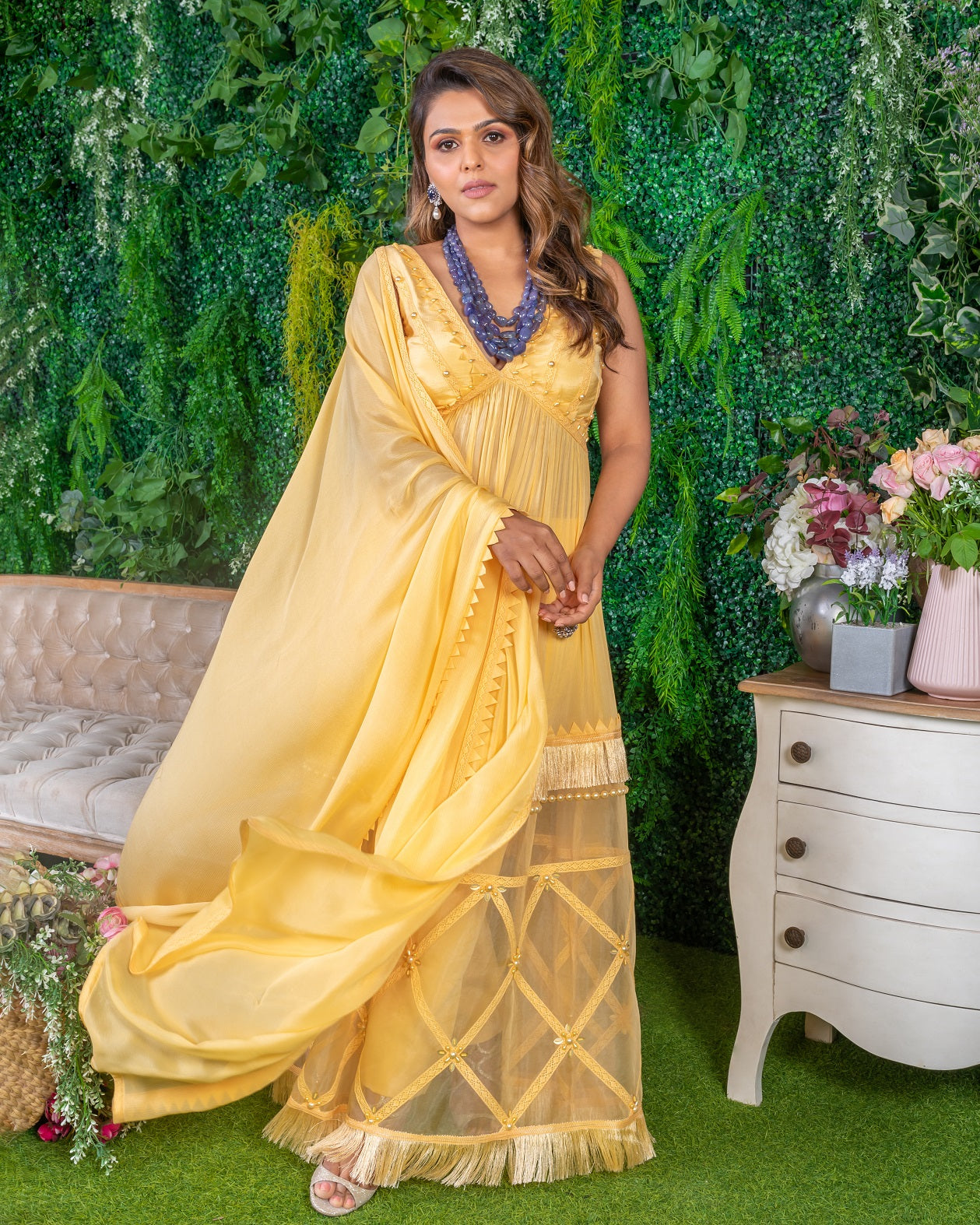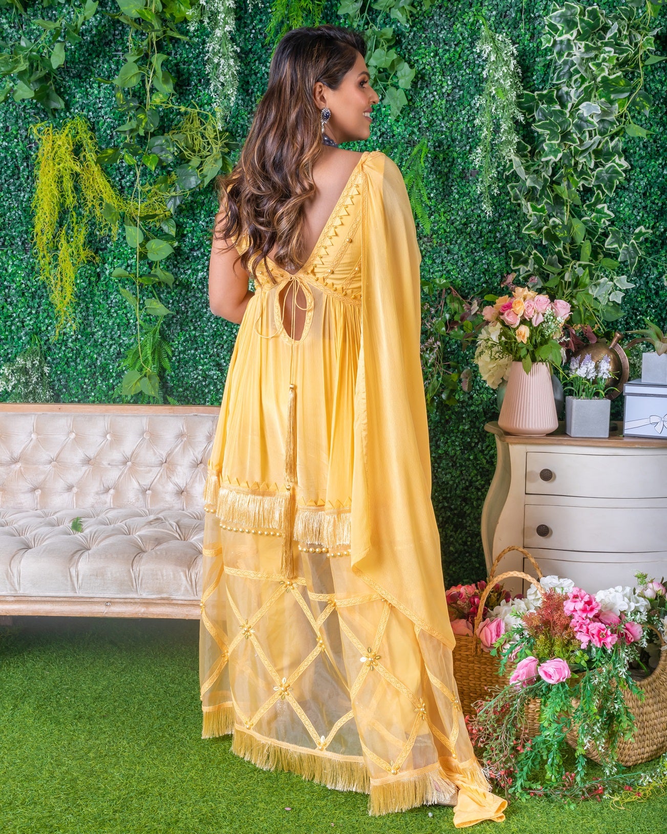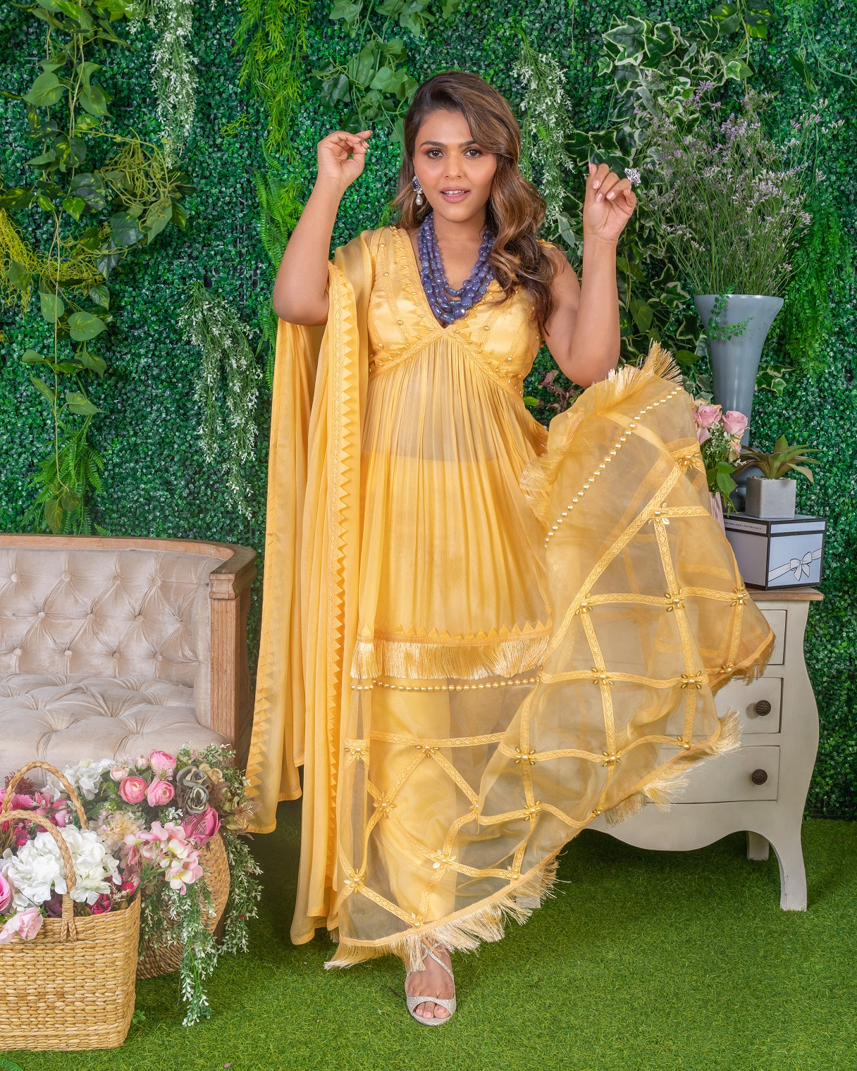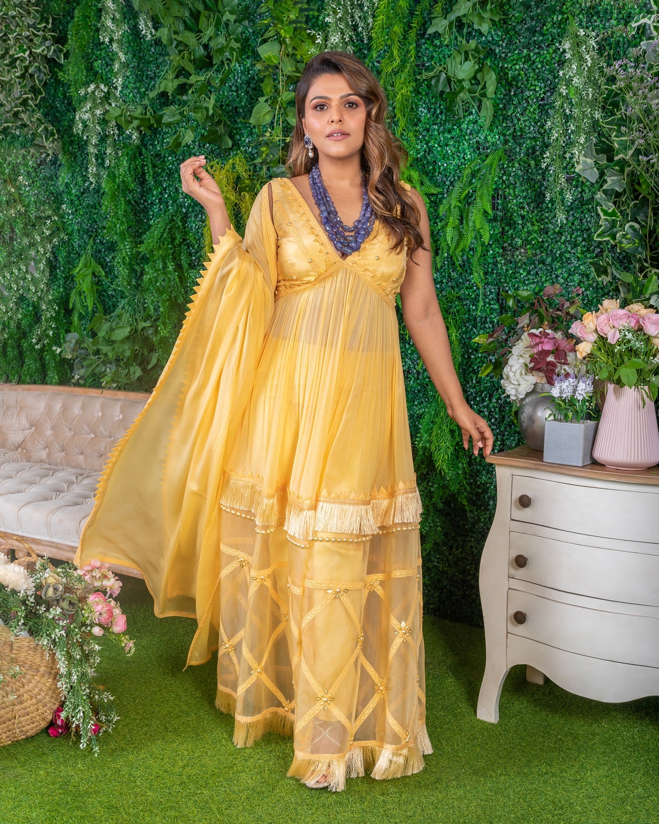 Featuring a Butterscotch Anarkali Set. It is a 3-piece set in chiffon and crepe fabric handmade with origami samoosa patti & pearl fringe work