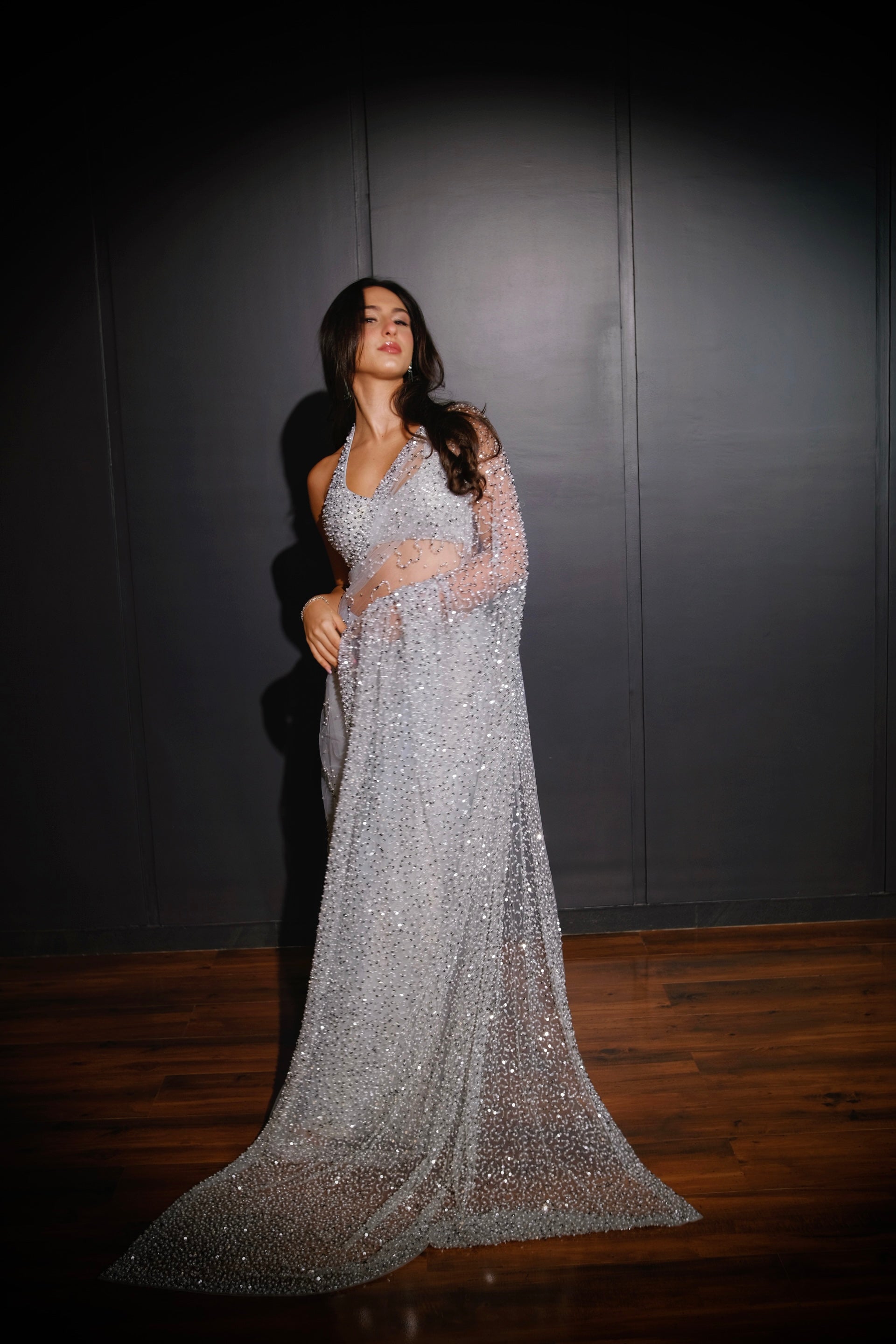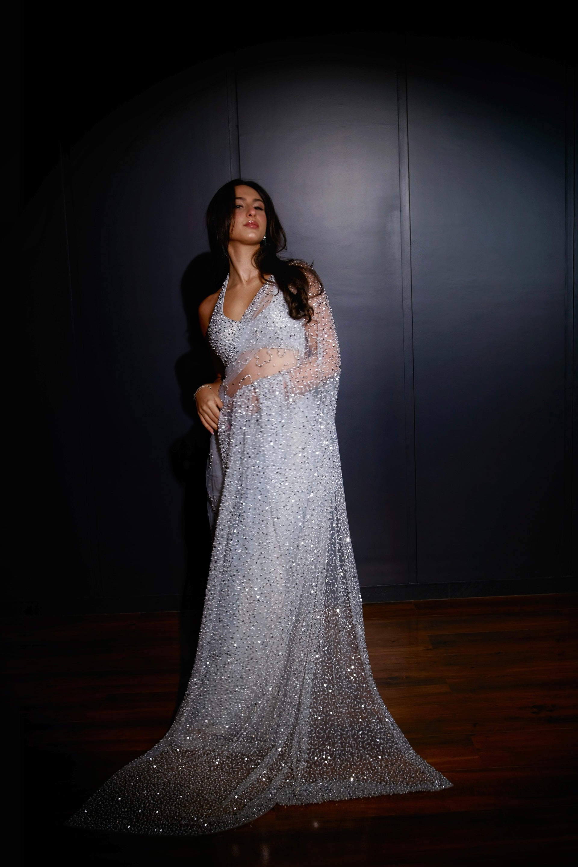 Featuring an ice blue saree in tulle base with pearl and sequins embroidery. It is paired with a blouse. Perfect wear for cocktail events