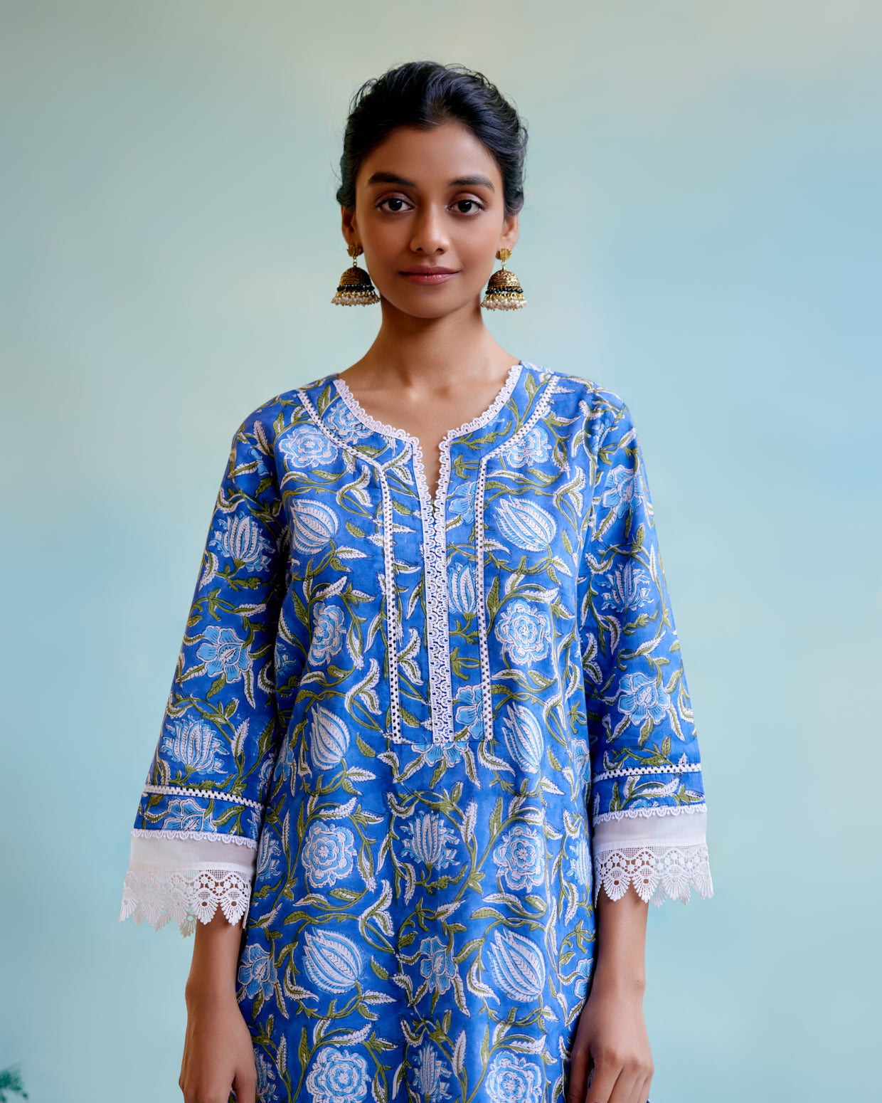 -Kurta in cotton fabric with Organza panel sleeves