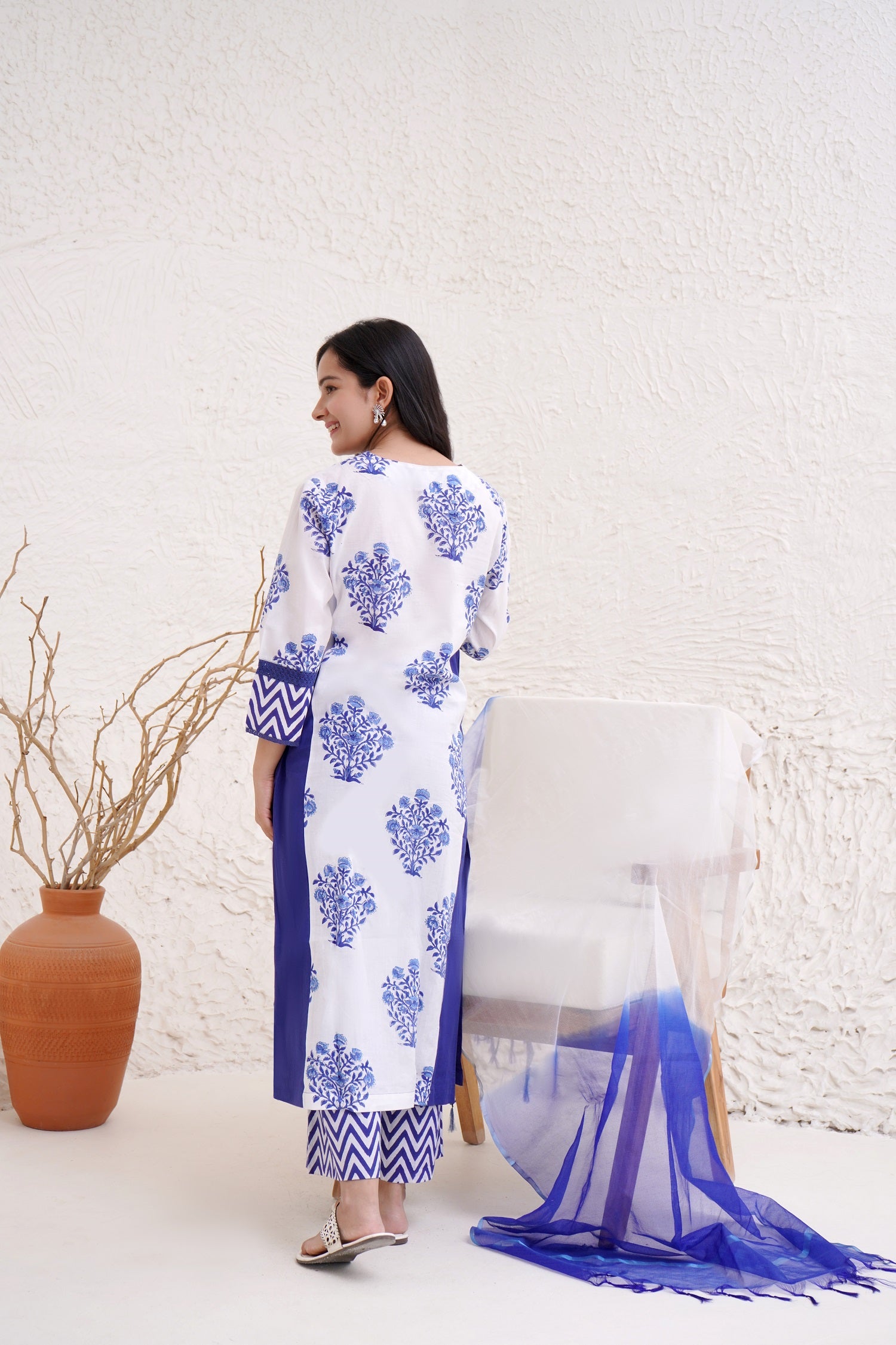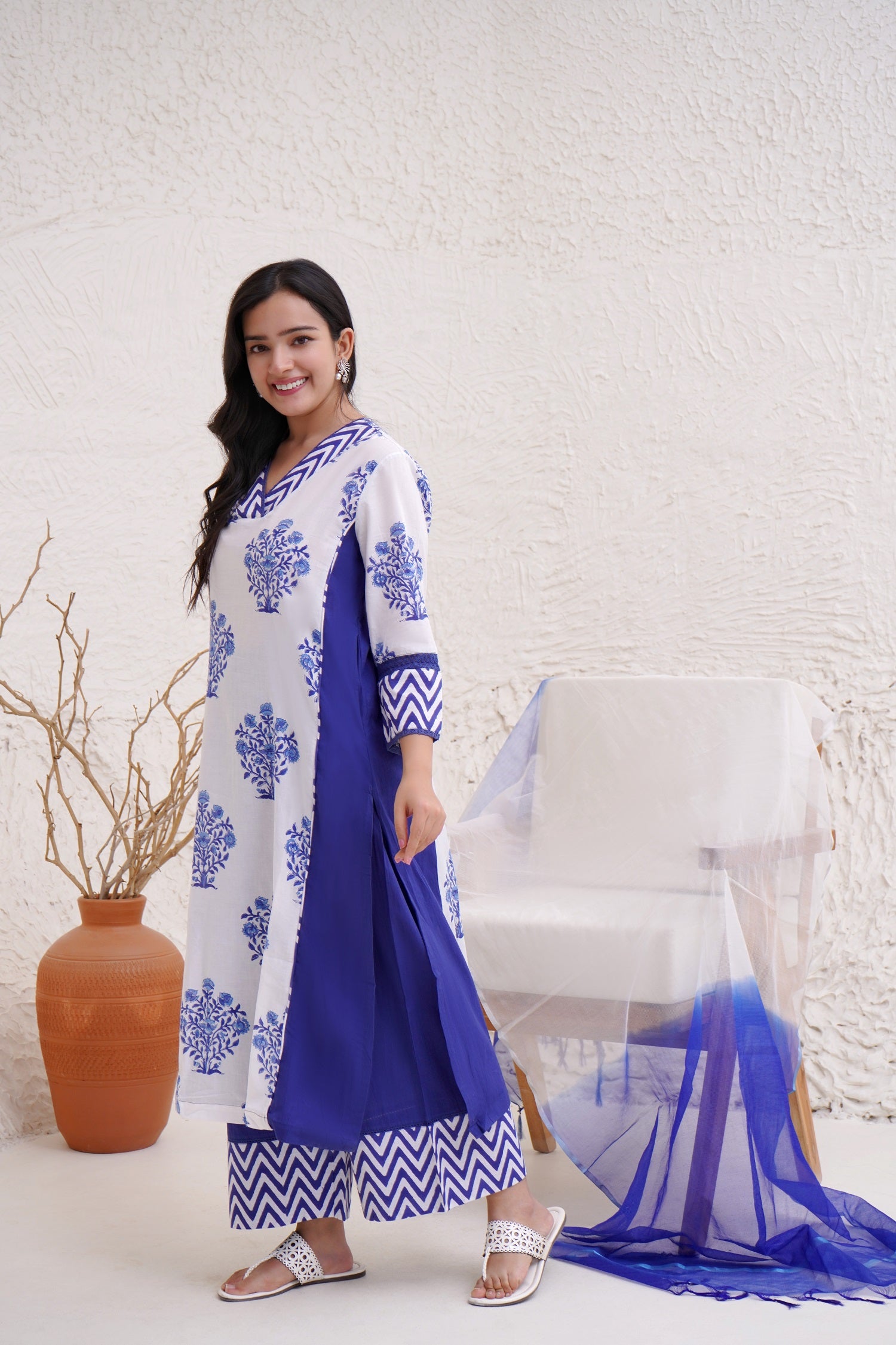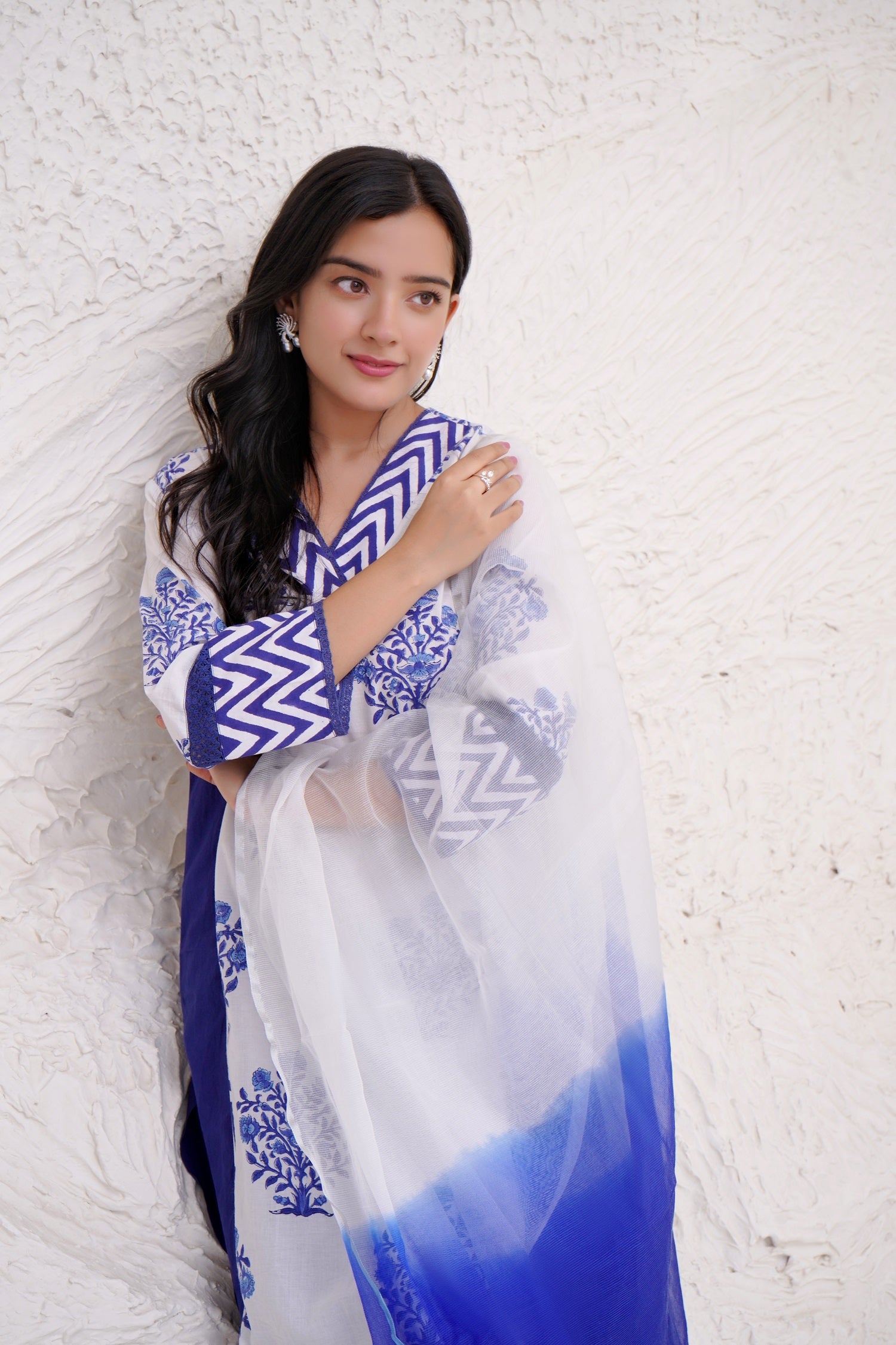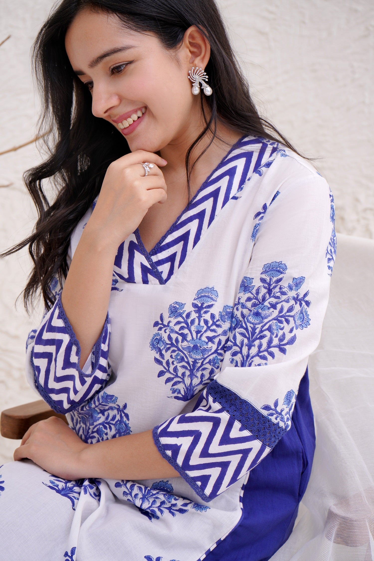 -Kurta in Indigo and White Hand Block Printed Cotton Fabric with side panels and slits adding movement.