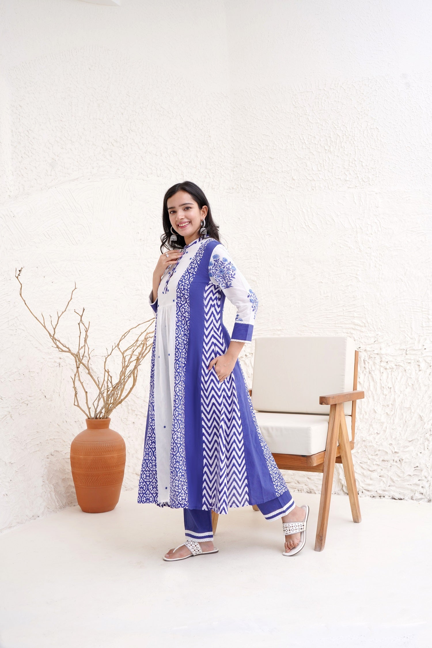 -Kurta in Indigo Blue and White Hand Block Printed Cotton Fabric with panels adding flare to the silhouette.