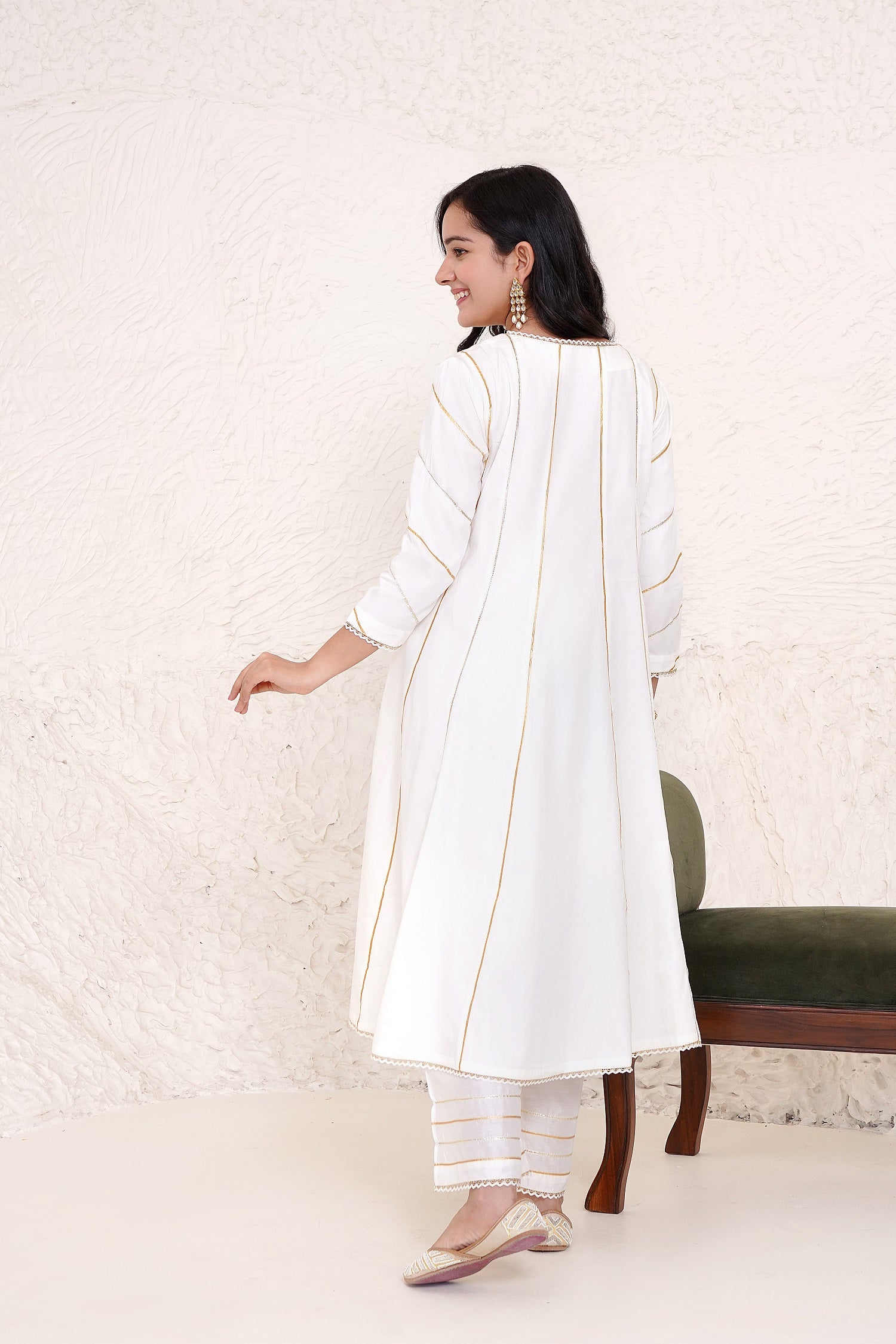 -Anarkali Kurta in Ivory Cotton Satin Fabric with multiple panels.