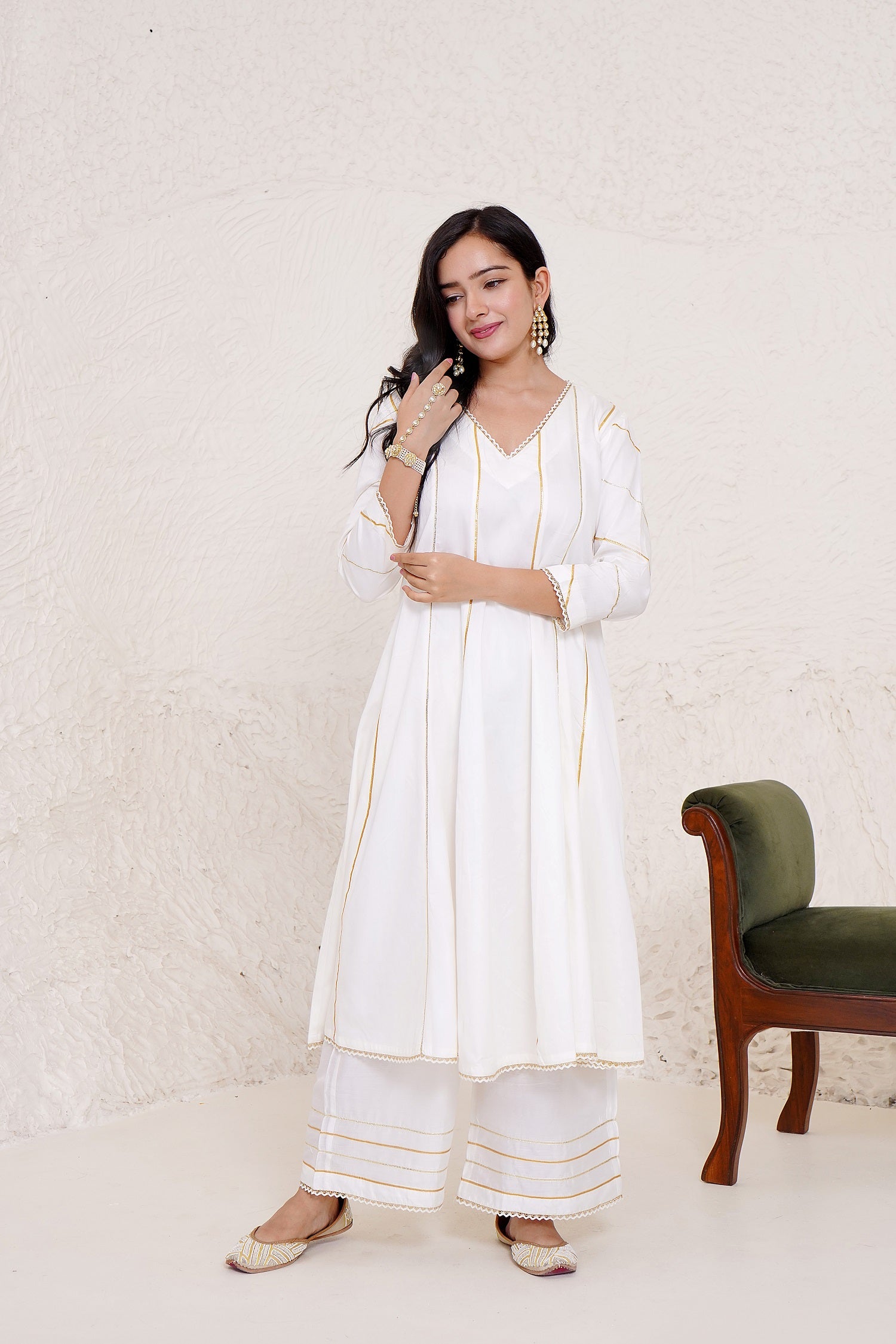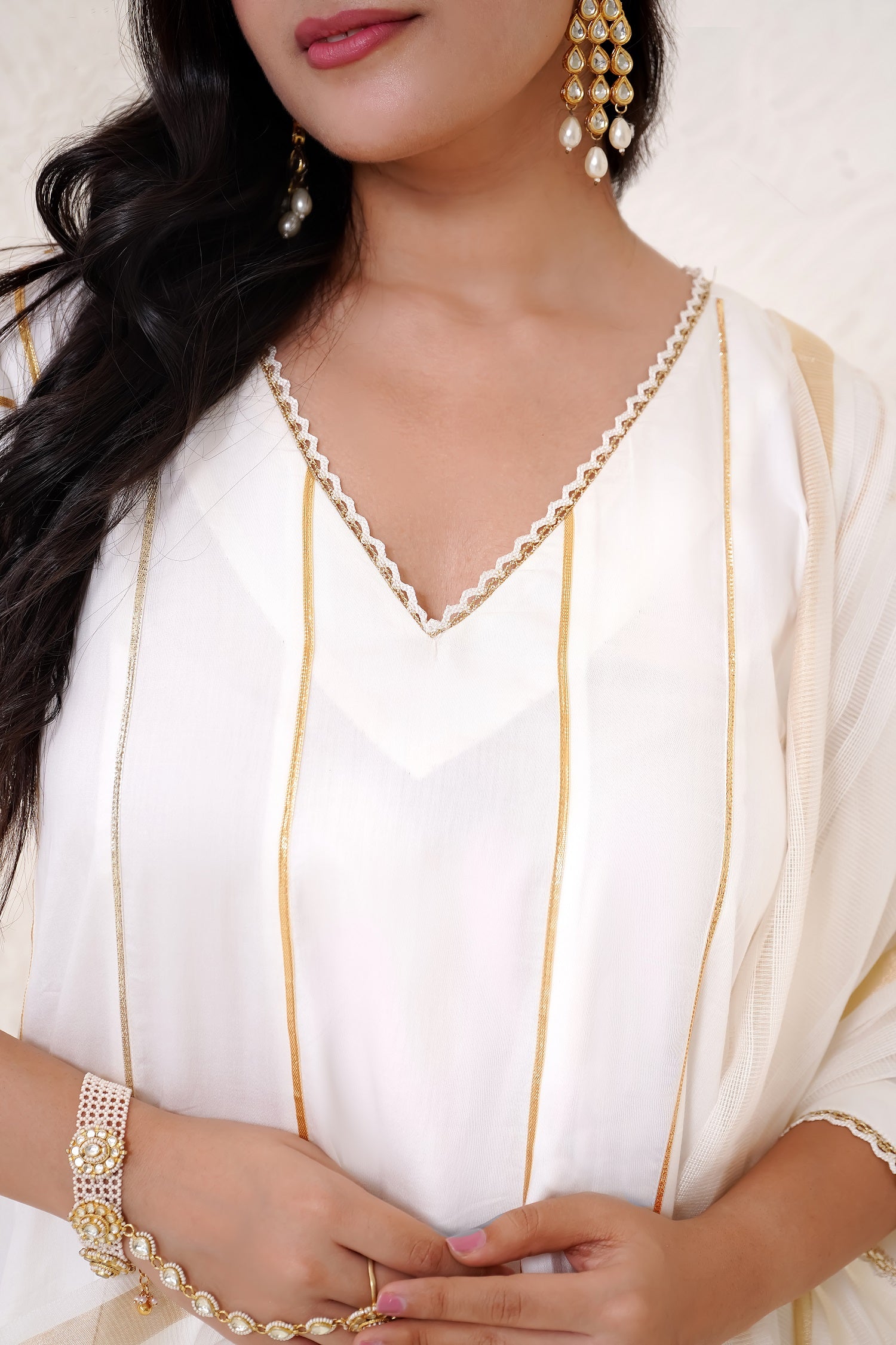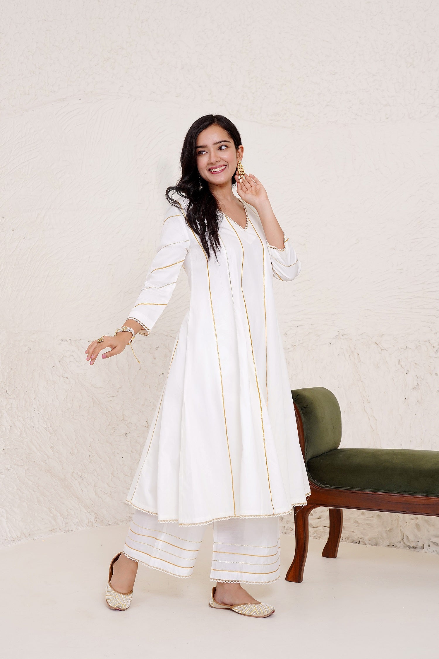 -Anarkali Kurta in Ivory Cotton Satin Fabric with multiple panels.