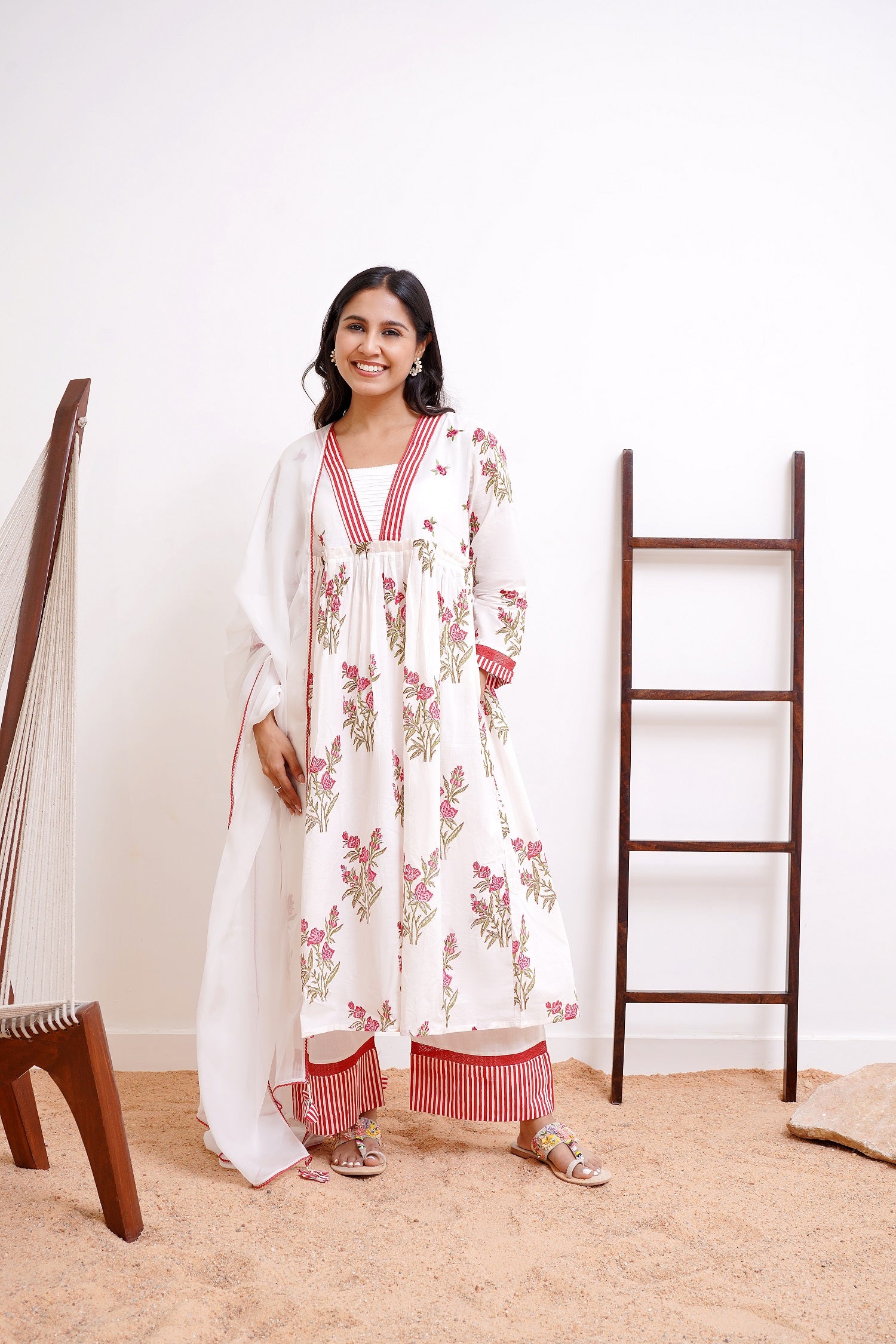 -Kurta in Ivory and Crimson Red Hand Block Printed Cotton Fabric with pleats adding flare to the silhouette.