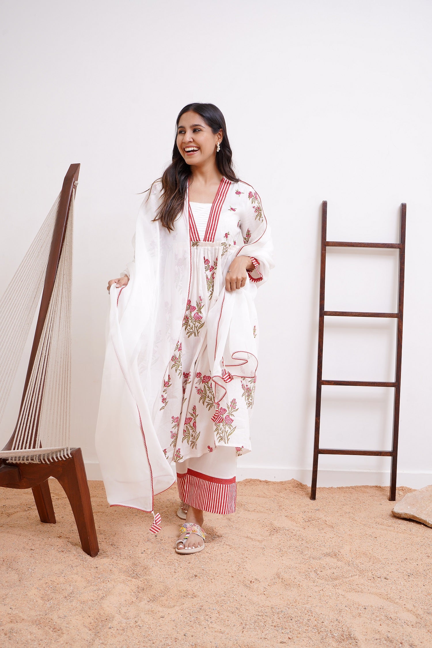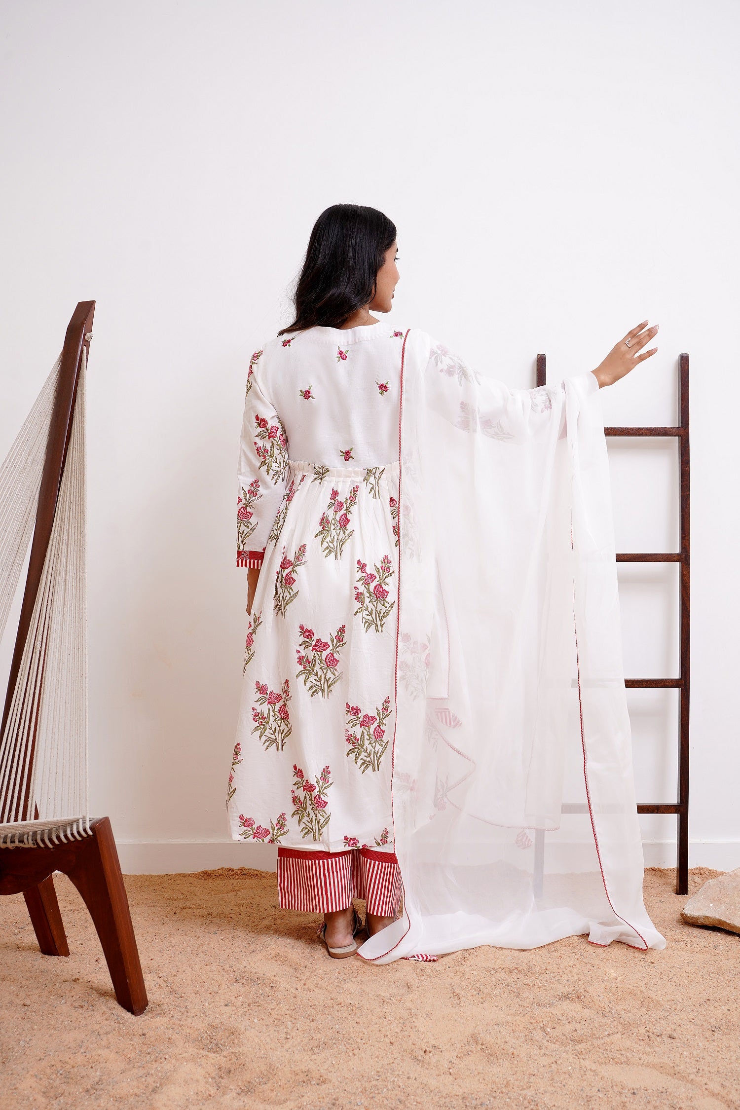 -Uniquely embellished with floral bunches machine embroidered and laces beautifying the look.