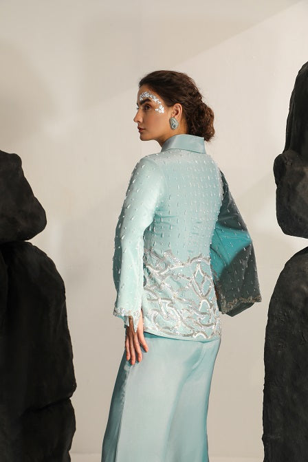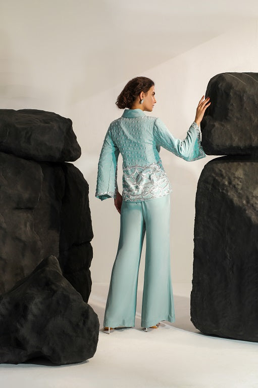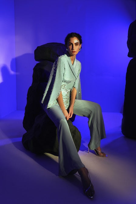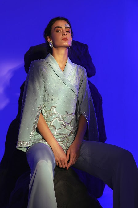 | The Kai co-ord set reflects a poetic balance of refined details and contemporary style. The Angrakha jacket and straight leg pants are a versatile pair to adorn for multiple occasions. The ensemble also features slit sleeves that incorporate a highlight to the garment - making it a statement outfit. |
