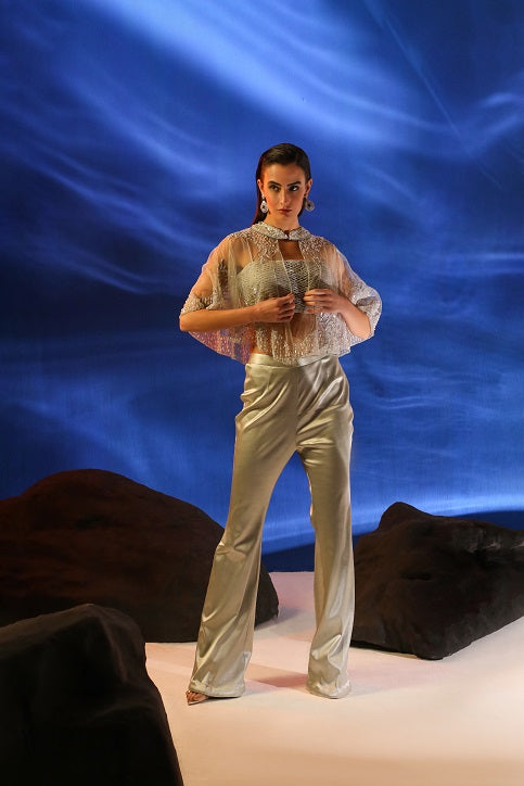 | Inspired by the captivating charm of the mysterious ocean, the Kelpie co-ord set is a three-piece ensemble that features honeycomb smocking on the bustier and wide leg lycra satin pants paired with a gorgeous hand embroidered cape with a statement neckline. It is the most appropriate ensemble for when you want to turn heads. |