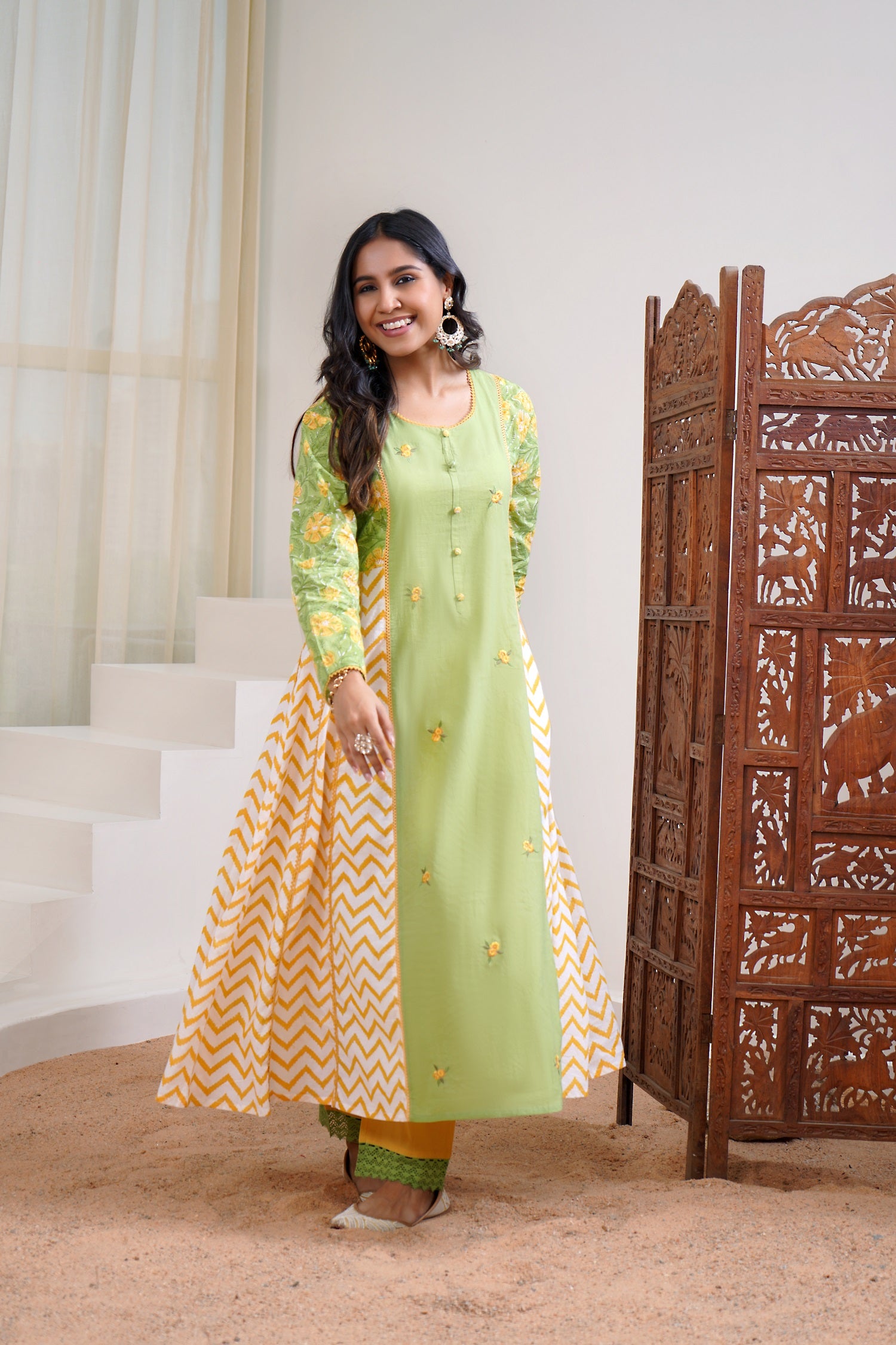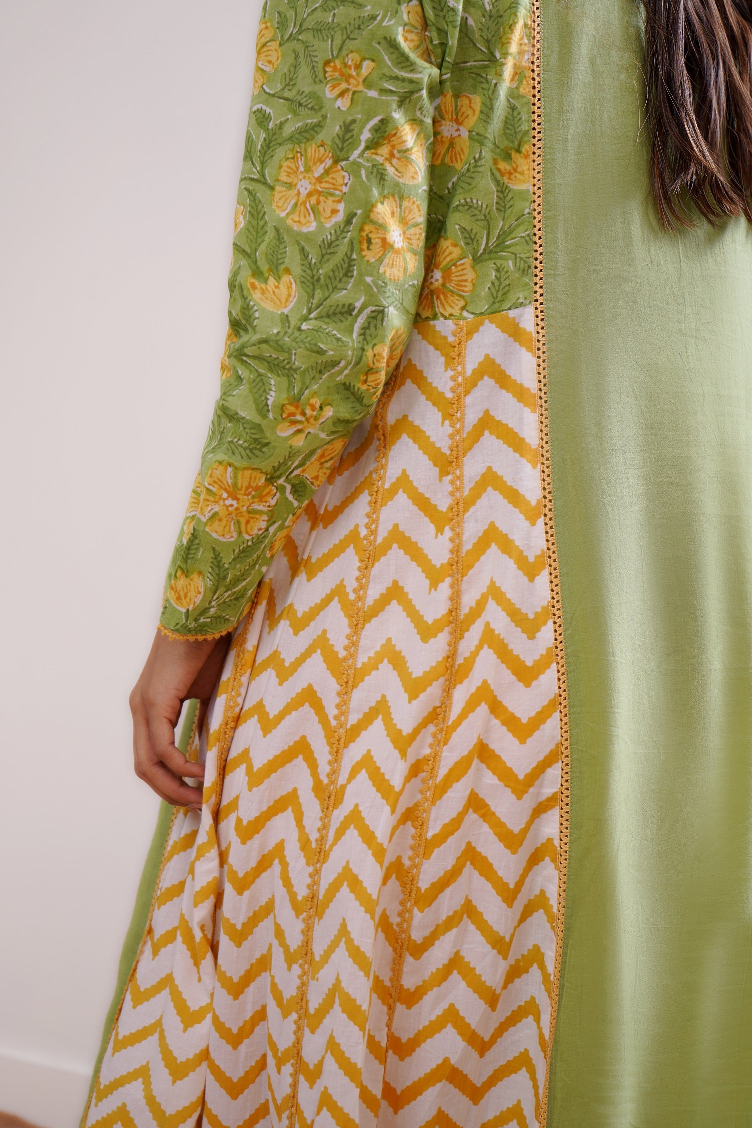 -Kurta in Lush Green and Mango Mustard Hand Block Printed Cotton Fabric with panels adding flare to the silhouette.