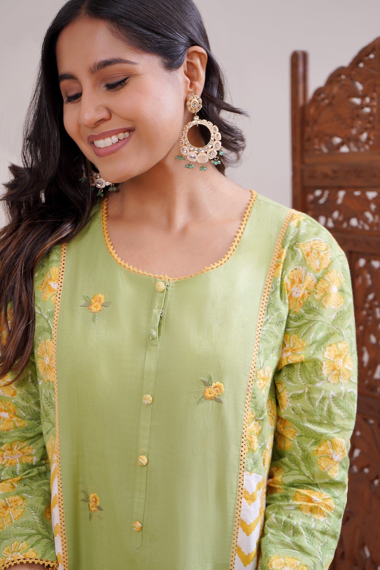 -Kurta in Lush Green and Mango Mustard Hand Block Printed Cotton Fabric with panels adding flare to the silhouette.