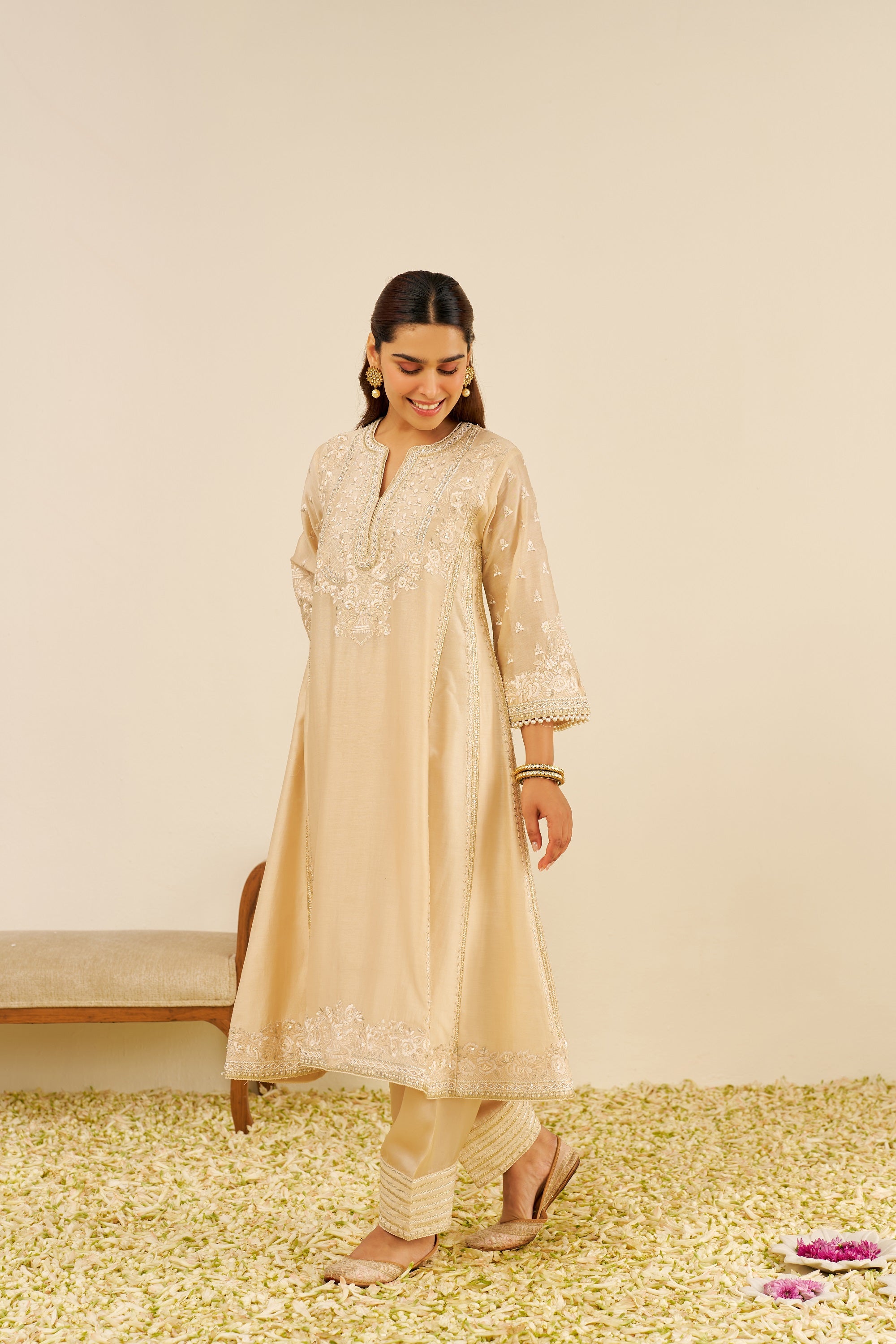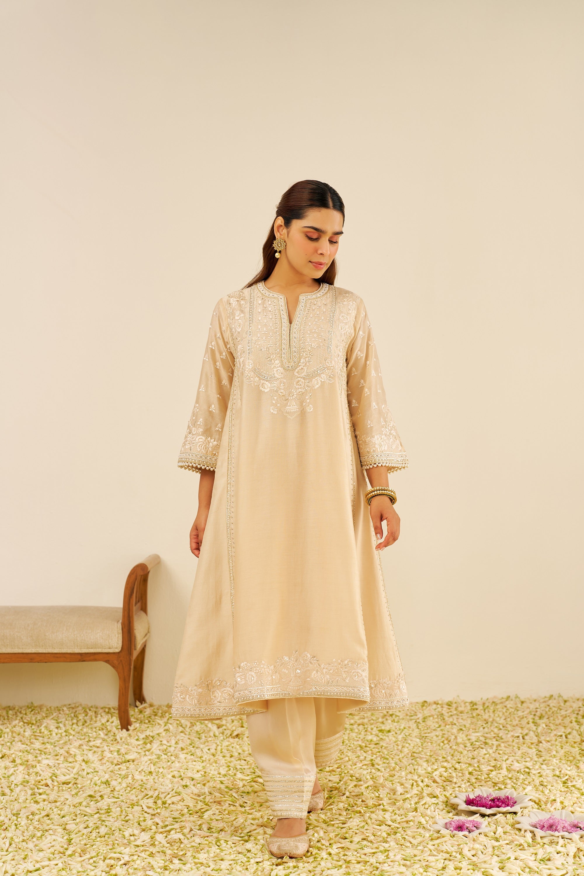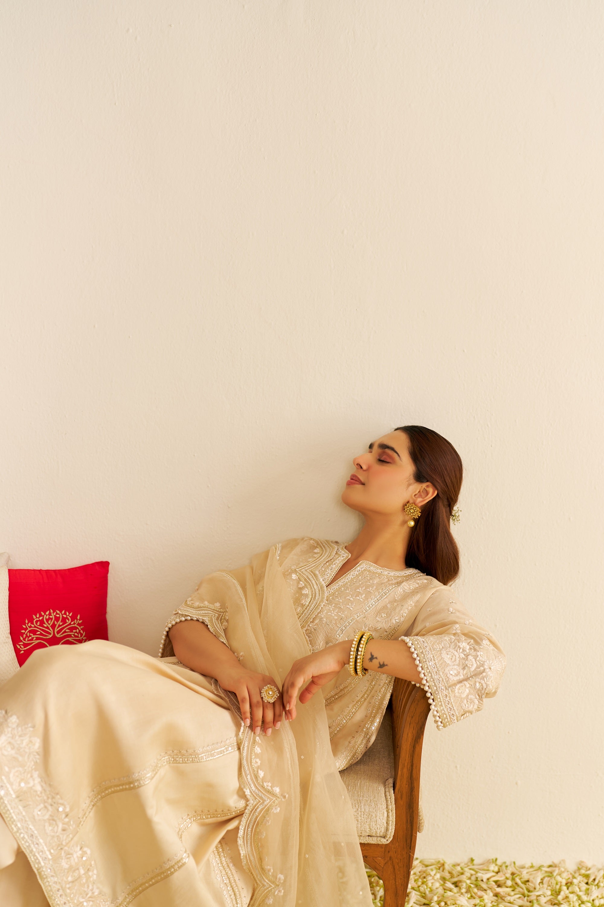 The Choga Is Fully Embroidered With Detailed Panels, Showcasing Exquisite Craftsmanship And Attention To Detail. Paired With An Embroidered Salwar, The Ensemble Radiates Timeless Beauty And Grace. To Complete The Look, The Entire Outfit Is Finished With Scallop Detailing, Providing A Refined And Polished Finish To This Stunning Creation.