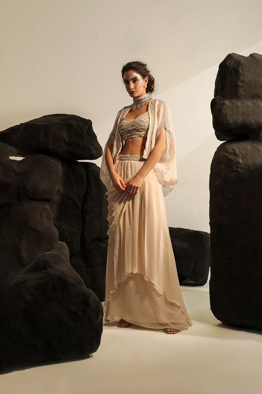 A draped skirt in muted peach hues efforlessly synchronises with intricate embroidery on a panelled blouse to form the Maribelle drape. As graceful as it is elegant, this ensemble is synonymous with opulence- making it one-of-a-kind. |