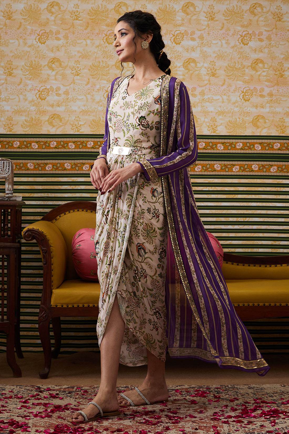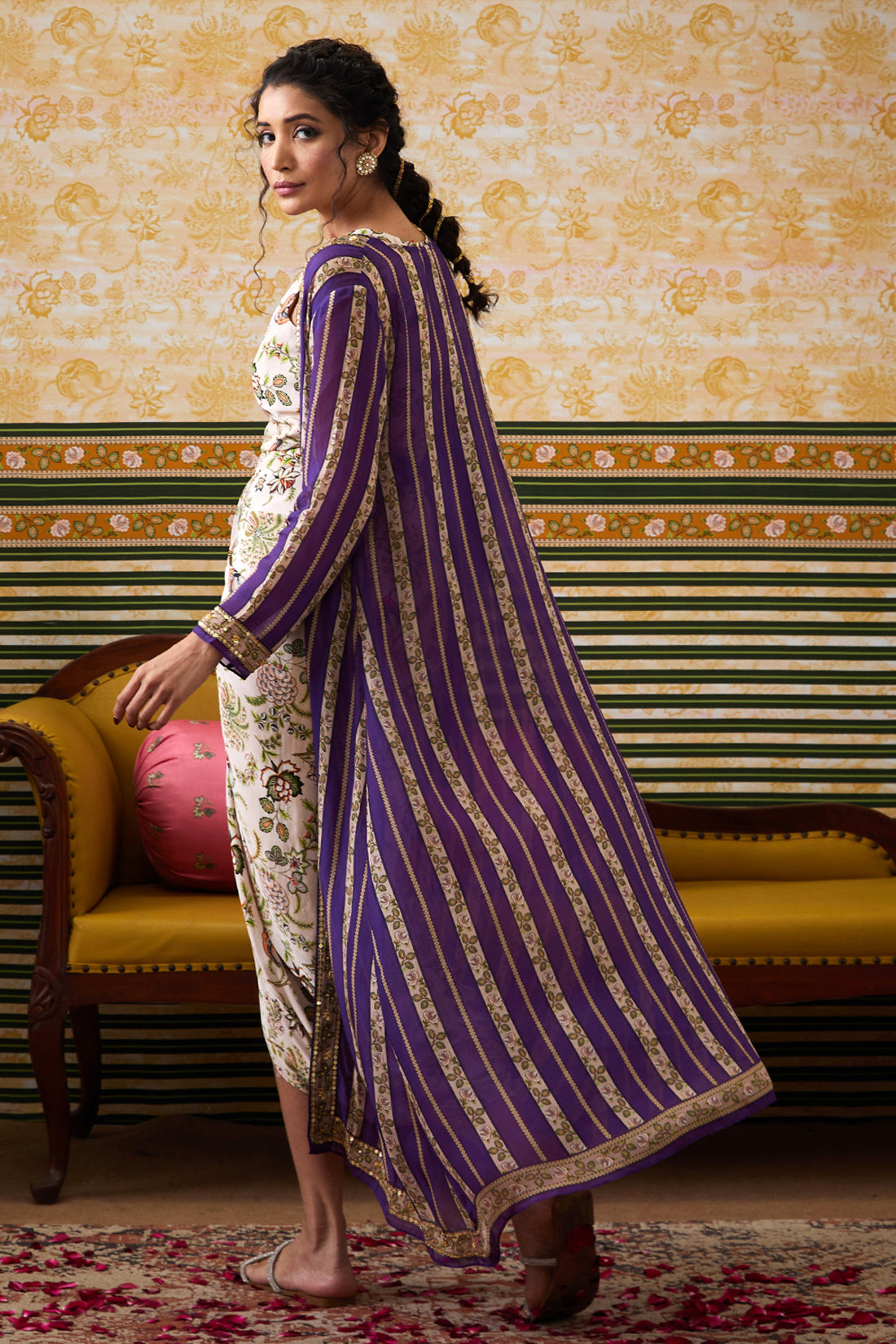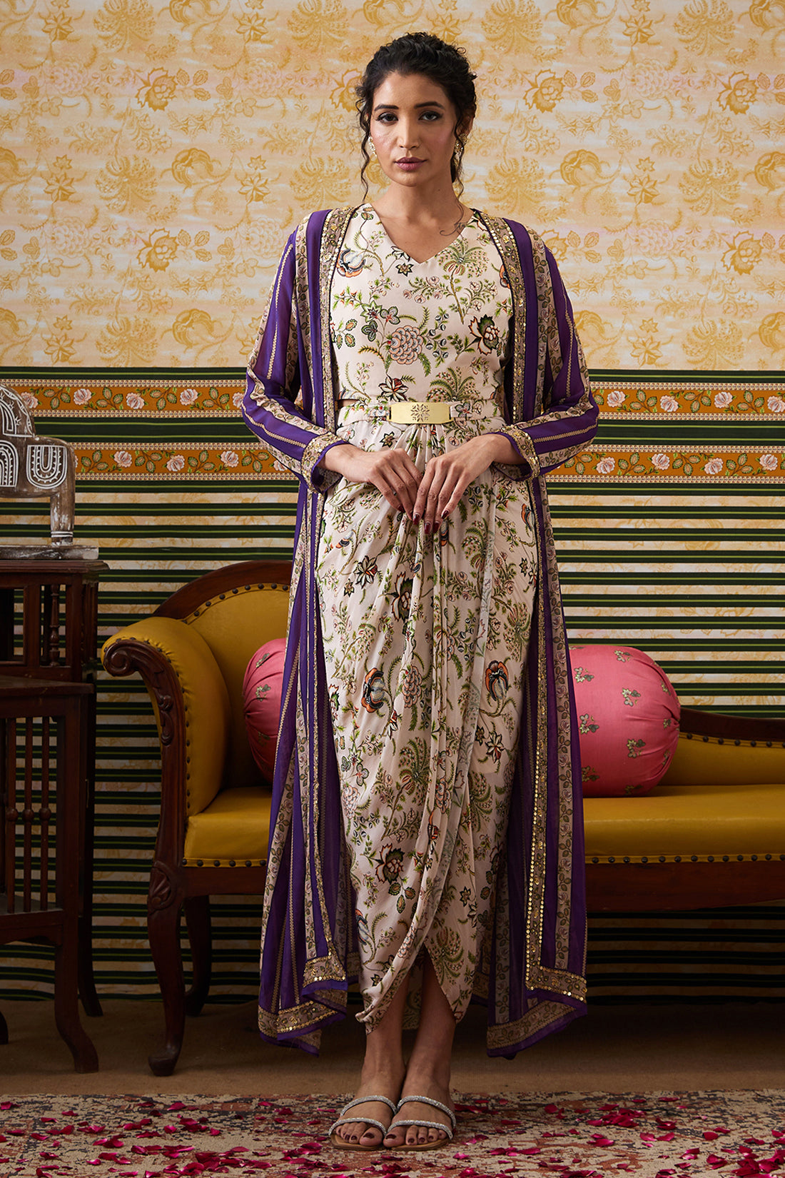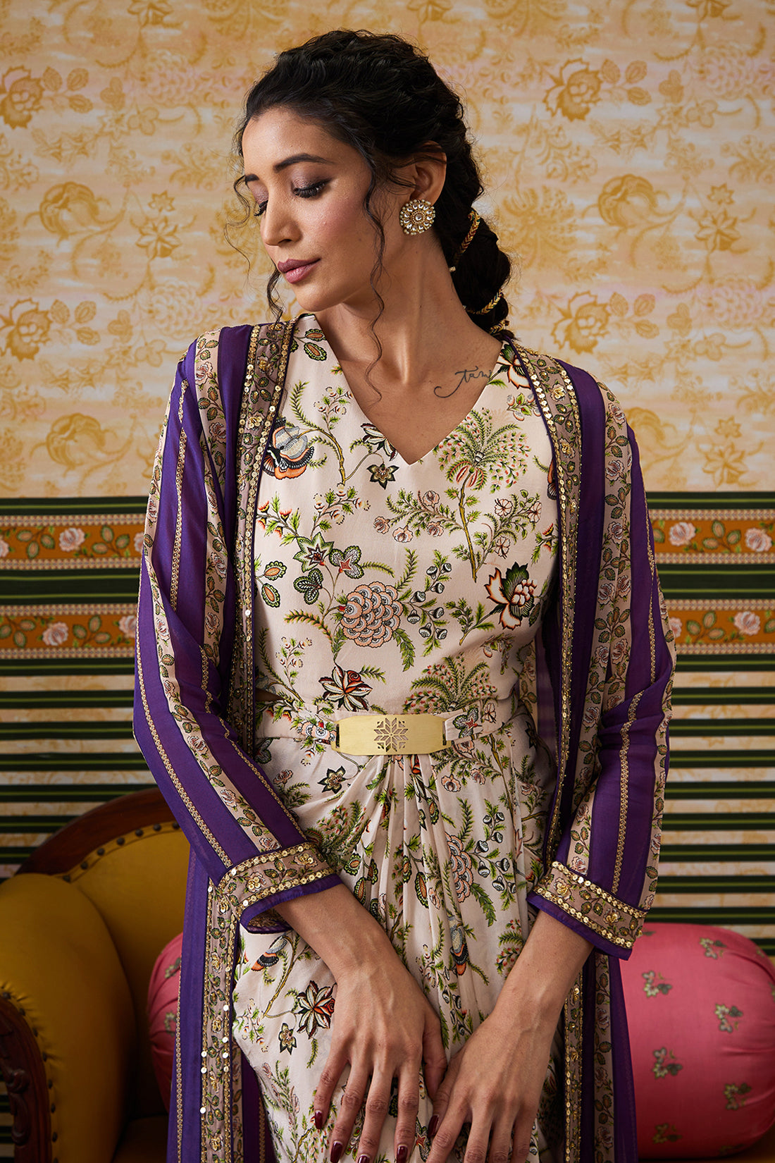 Featuring a beige & purple Drape dress in Malaysian silk fabric. It is paired with a printed organza jacket.