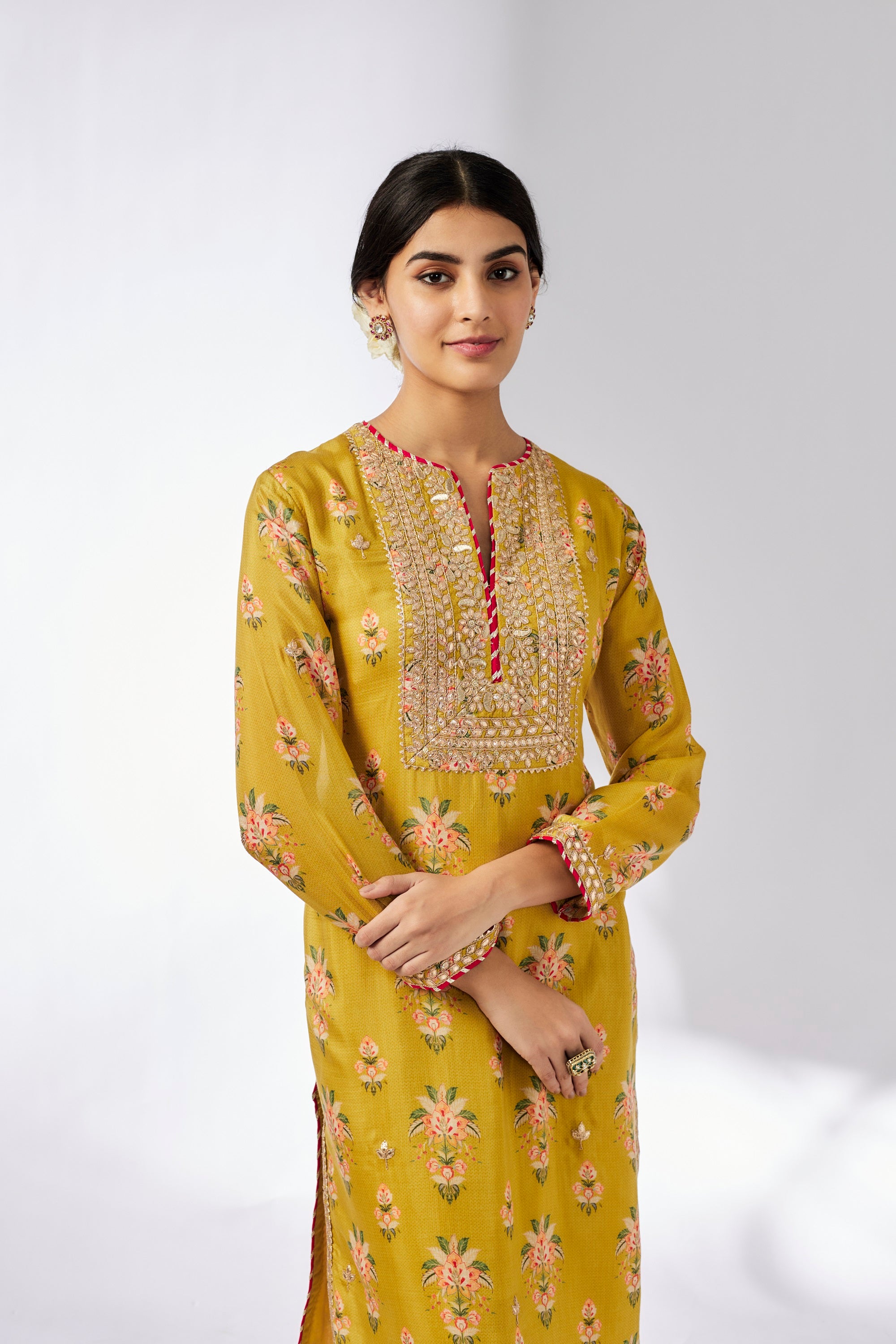 This Smart, Contemporary Collection Mixes A Strong Floral Print, All Delicately Enhanced Embroidery around the Neck . Add Shimmer And A Richness To This Pretty Ensemble. Long Sleeved Tunic Is Easy To Carry And Can Be Worn On Any Occasion.