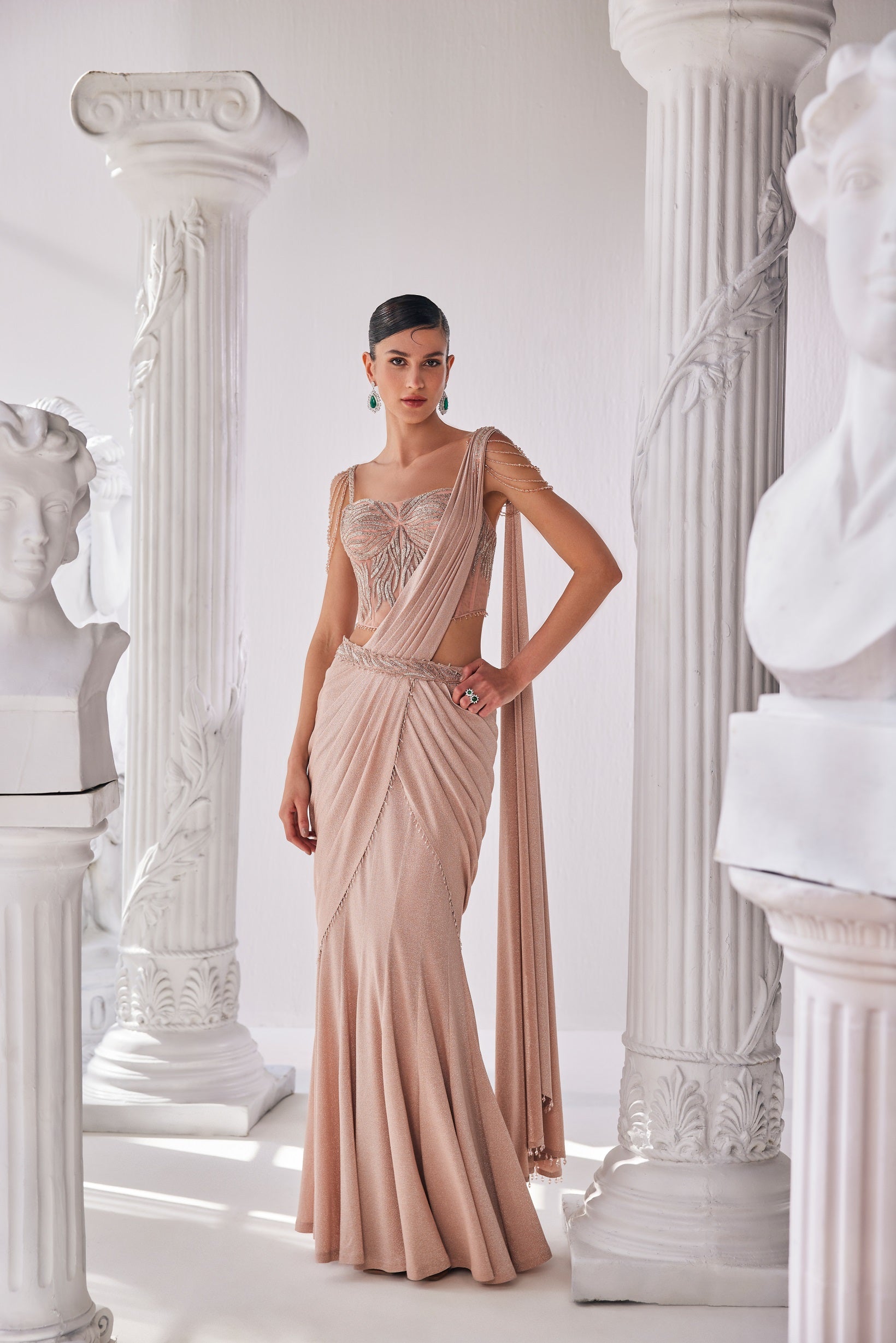 | This stunning peach draped saree crafted from luxurious shimmering lycra fabric. Paired elegantly with an embroidered corset blouse. Elevating the ensemble is a statement belt that adds a touch of glamour. |