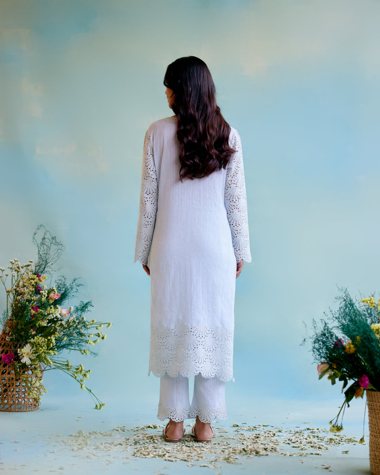 -Kurta in cotton dobby fabric with Schiffli scallop sleeves