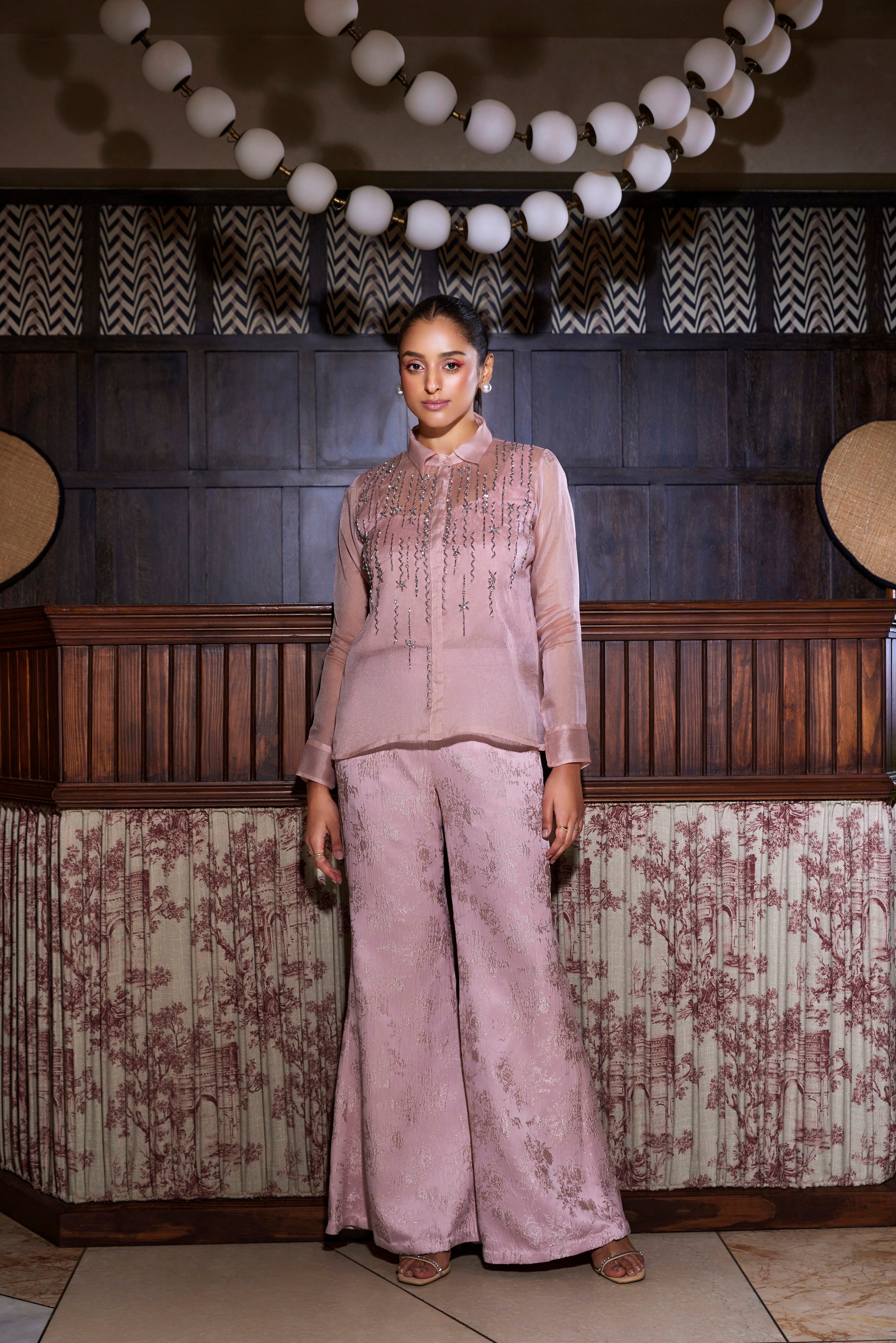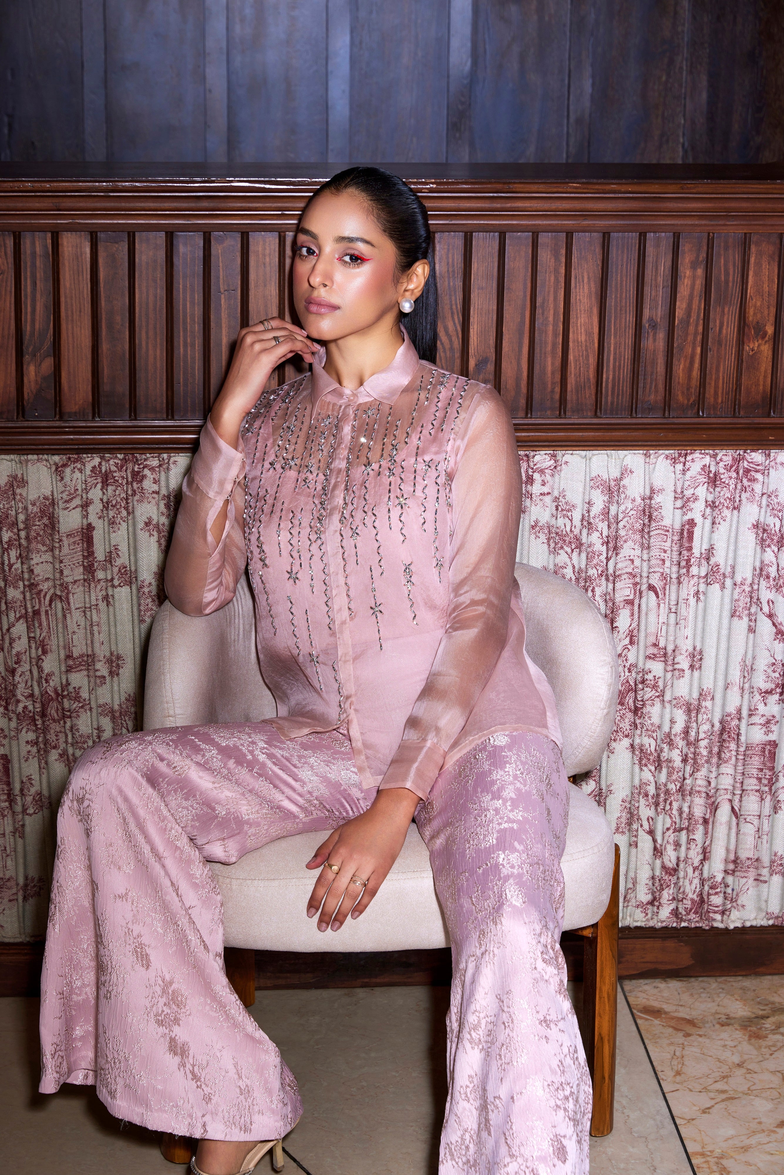 Pink jacquard pants with an organza shirt having hand embroidery at the neck and shoulders.
