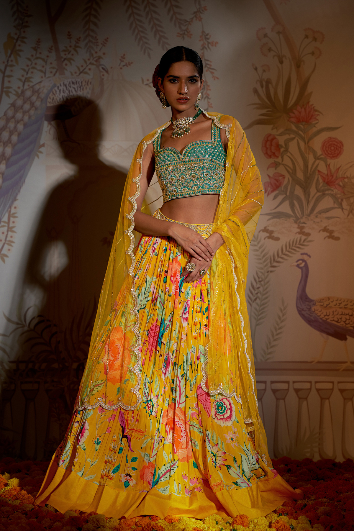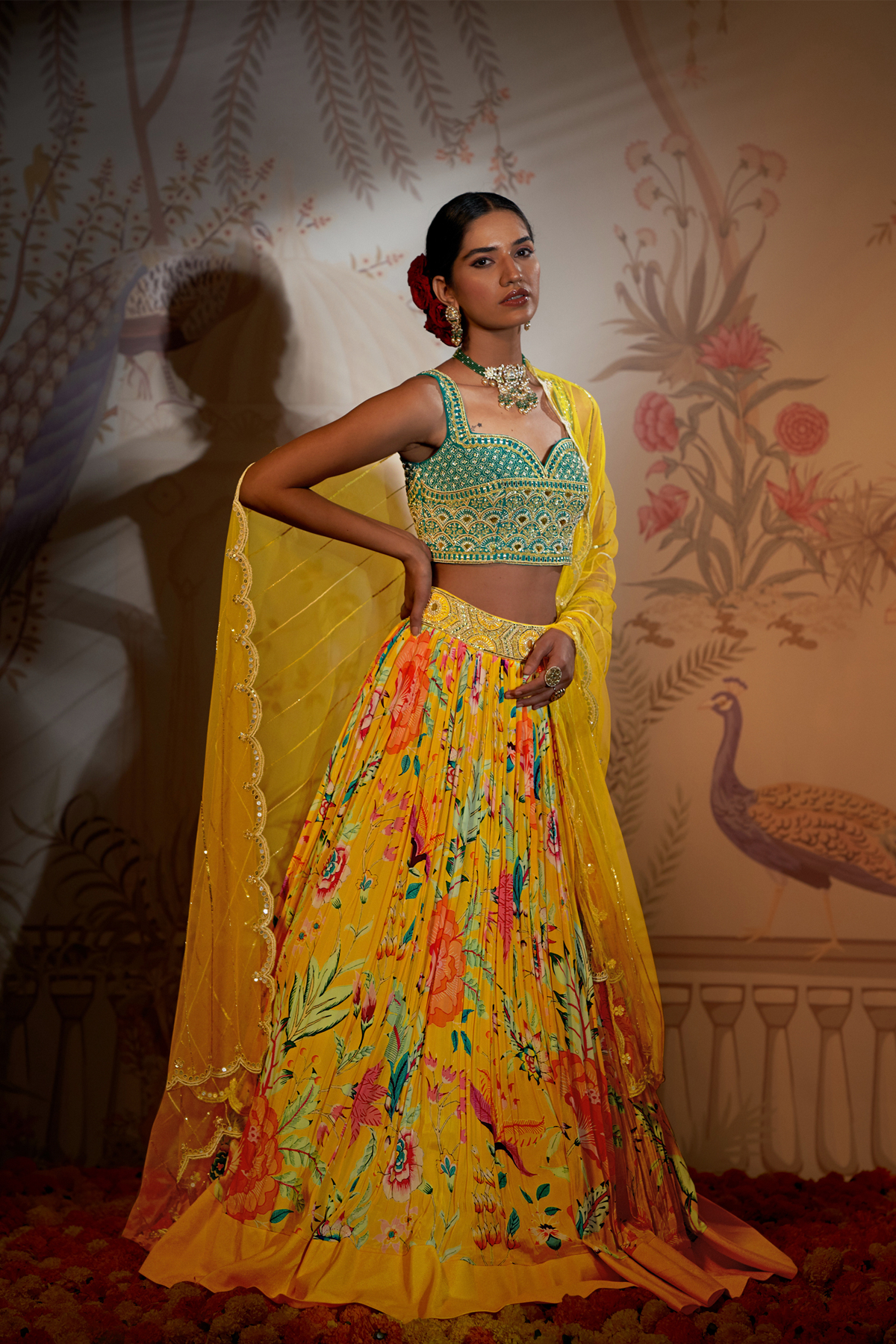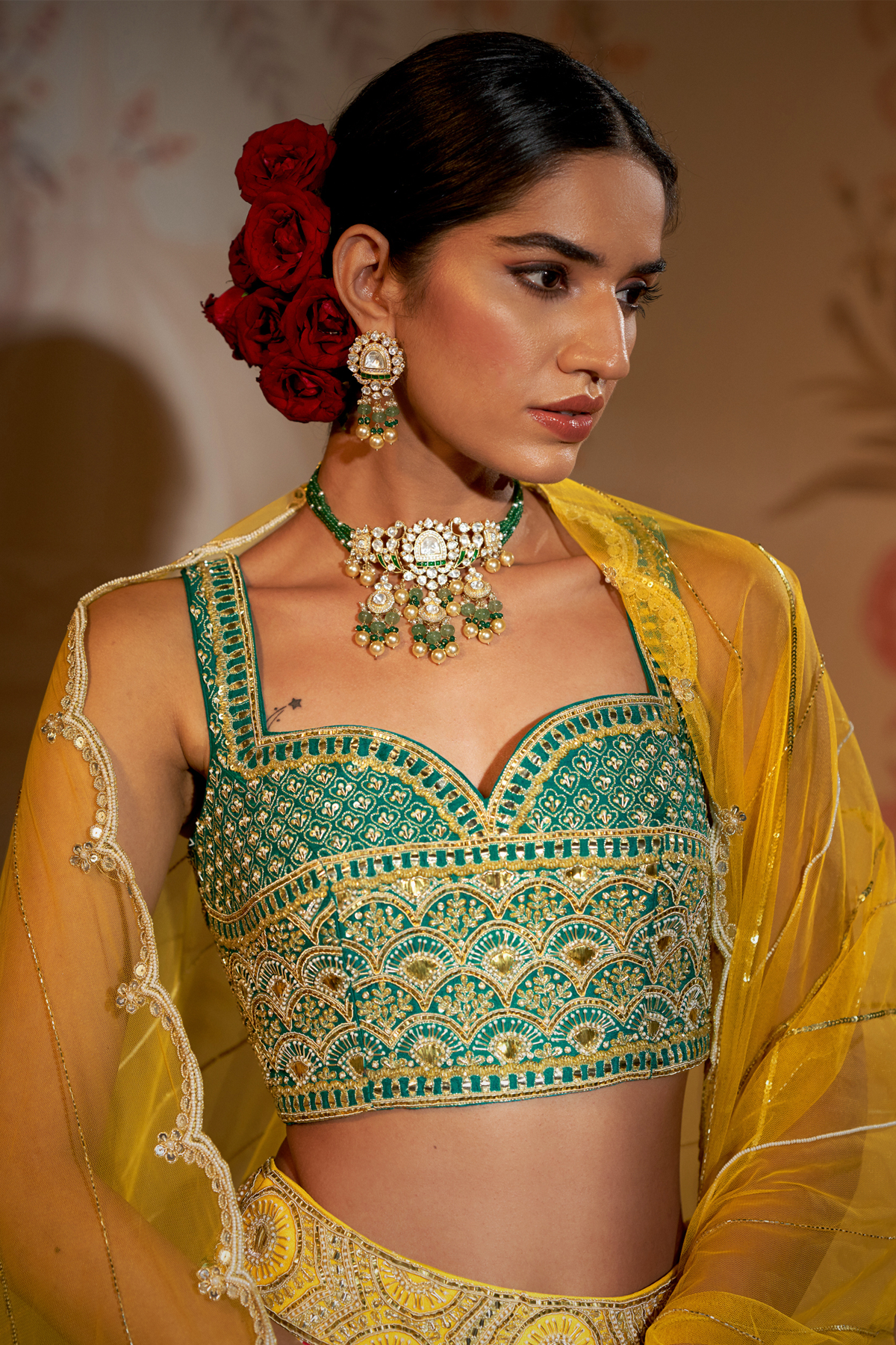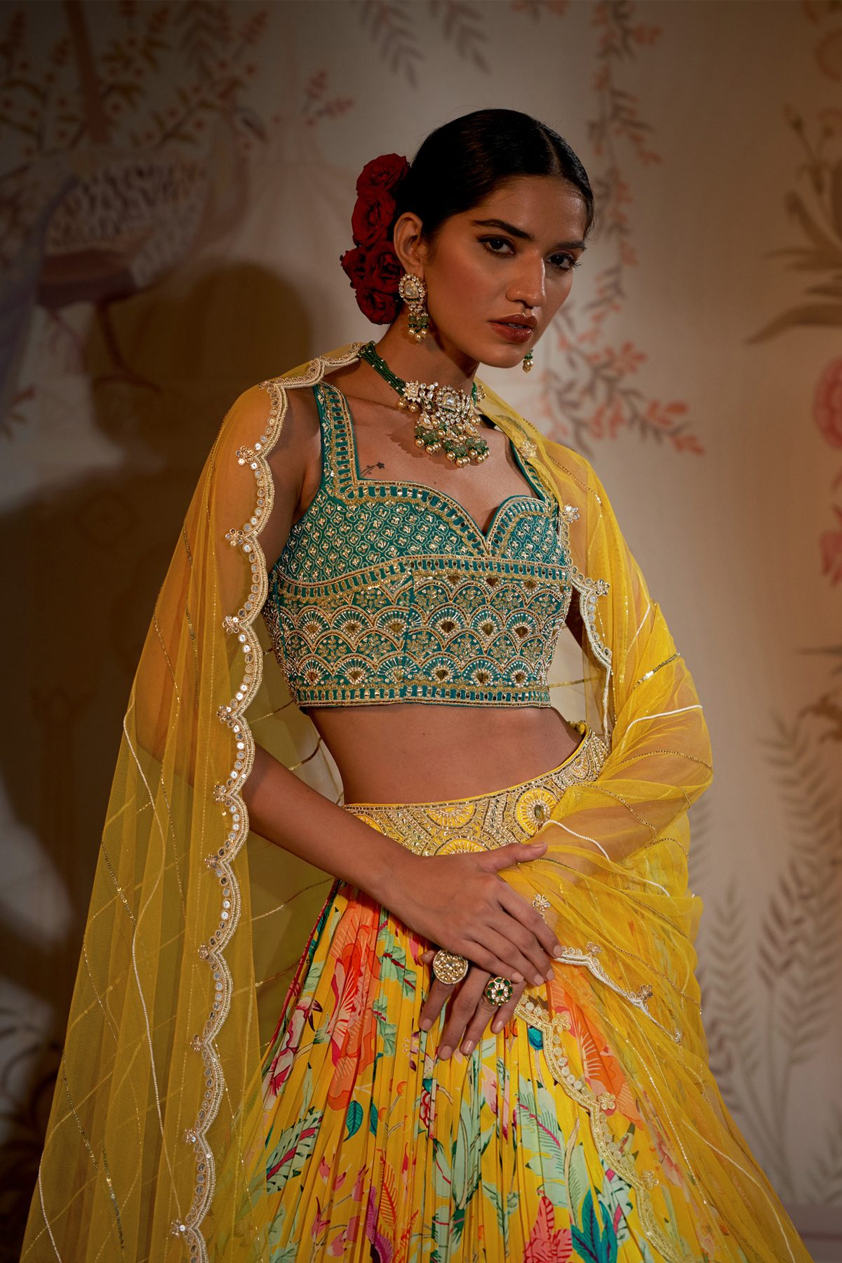 Featuring a bandhani lehenga. It is paired with a heavy embroidered corset blouse and net dupatta.