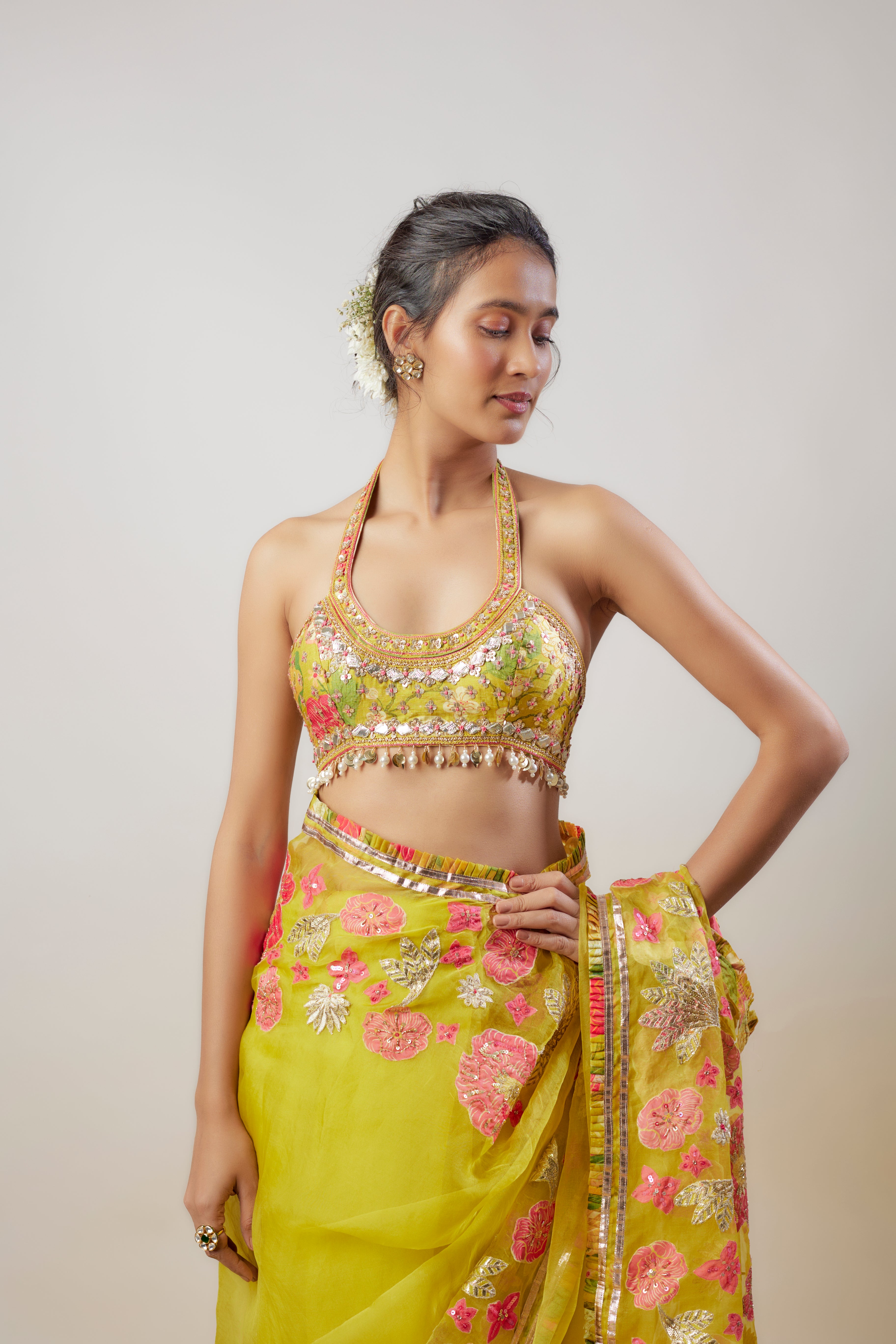 Make a bold statement in our chic saree, paired with a trendy halter neck sleeveless blouse for a modern twist on tradition. Crafted from luxurious fabric, this ensemble features intricate details and a flattering silhouette that enhances your natural grace. Perfect for evening gatherings or special occasions, it's a must-have for the contemporary woman!