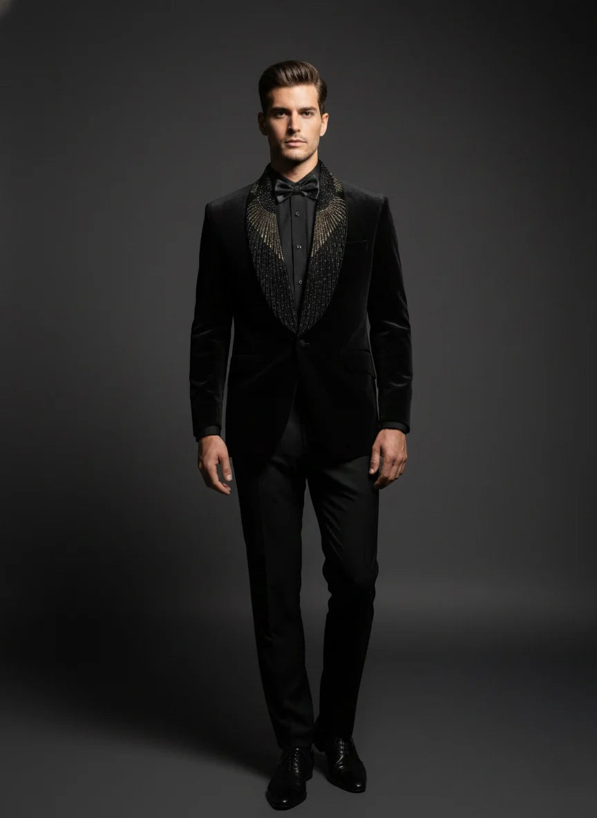 Elevate your formal wardrobe with the Midnight Elegance Velvet Tuxedo, designed for black-tie events, weddings, and luxury evening occasions. This sophisticated tuxedo features a rich black velvet jacket with a textured satin shawl lapel that adds depth and refinement. Tailored for a sharp, modern silhouette, it pairs seamlessly with matching black trousers and a classic bow tie. Perfect for men who want a bold yet timeless statement of elegance and confidence.