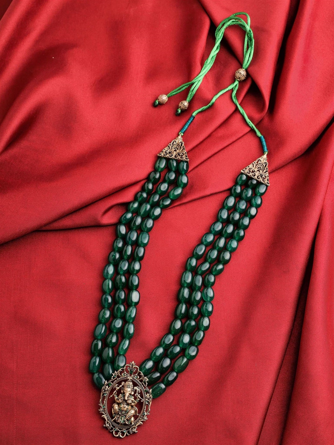 The Green Ganesha Mala is a unique and artistic string of beads made from genuine green stones. The soothing green color and intricate design of the beads make it a perfect accessory for both spiritual and fashion purposes. The mala comes with a handmade tassel made from green silk thread that adds a touch of elegance.
