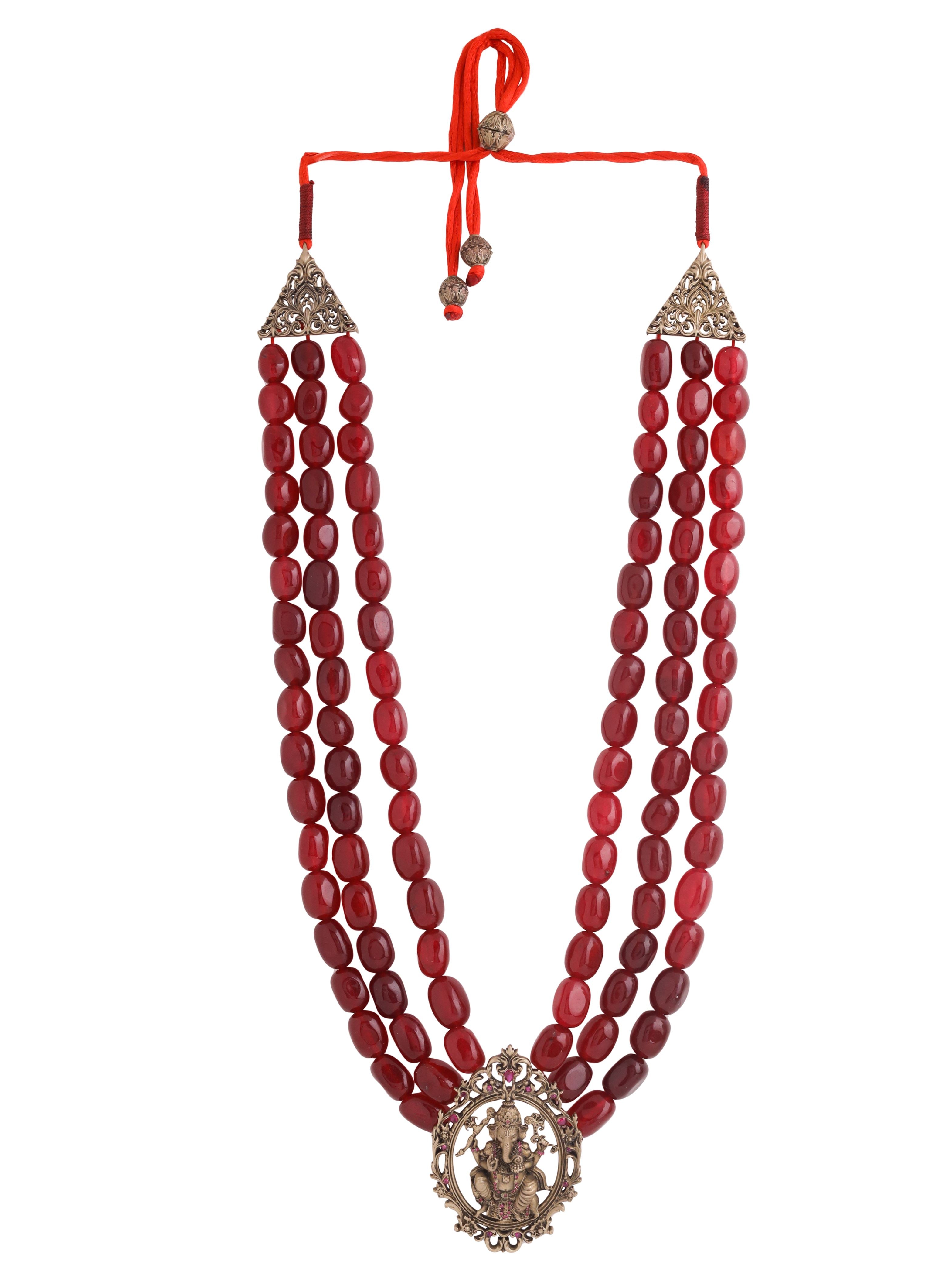 The Red Ganesha Mala is a beautiful string of beads made from genuine red beads. The mala features a hand-carved Ganesha pendant made from brass, adding a touch of spirituality and elegance. The mala comes with a handmade red tassel made from cotton thread that adds a touch of vibrancy.