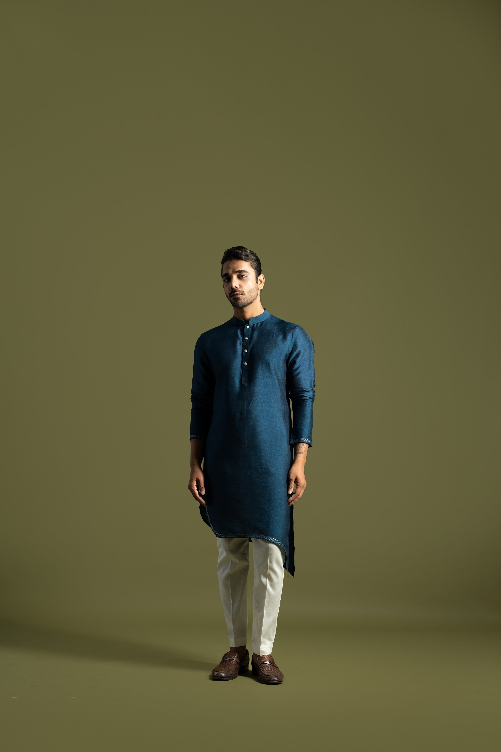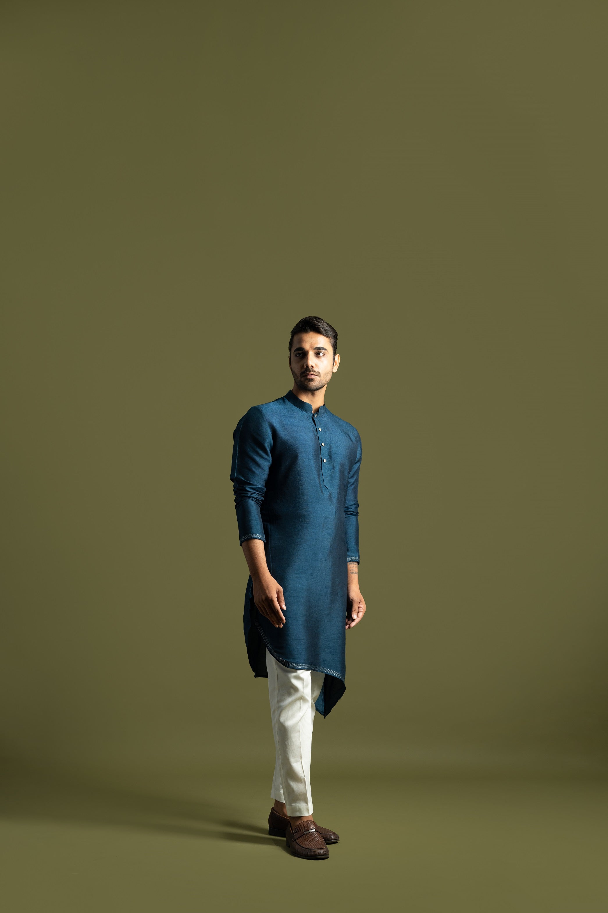 | TEAL BLUE BAMBERG SILK DIAGONAL CUT KURTA WITH STITCH LINE DETAILS ON THE HEMLINE |