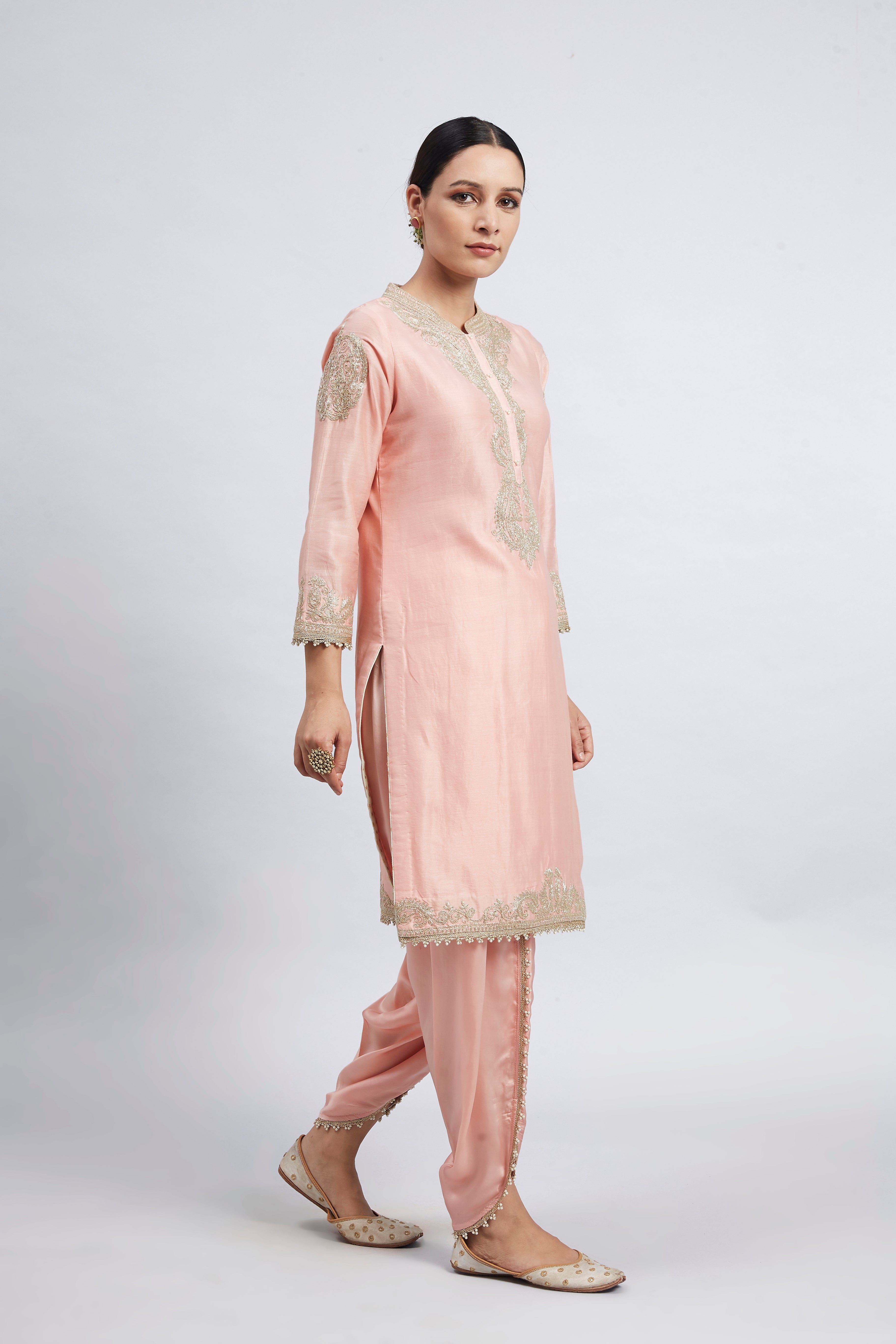 The Aabish Ensemble From Our Firozah Collection Is Made With A Luxe Chanderi Silk Fabric, And Adorned With Heritage Kashmiri Tilla Embroidery. It Features A Mandarin Collar With A Placket And Three-Quarter Sleeves. The Look Comes With A Dhoti. The Outfit Is Finished Is Using A Chanderi Silk Banarsi Fabric And Pearls.