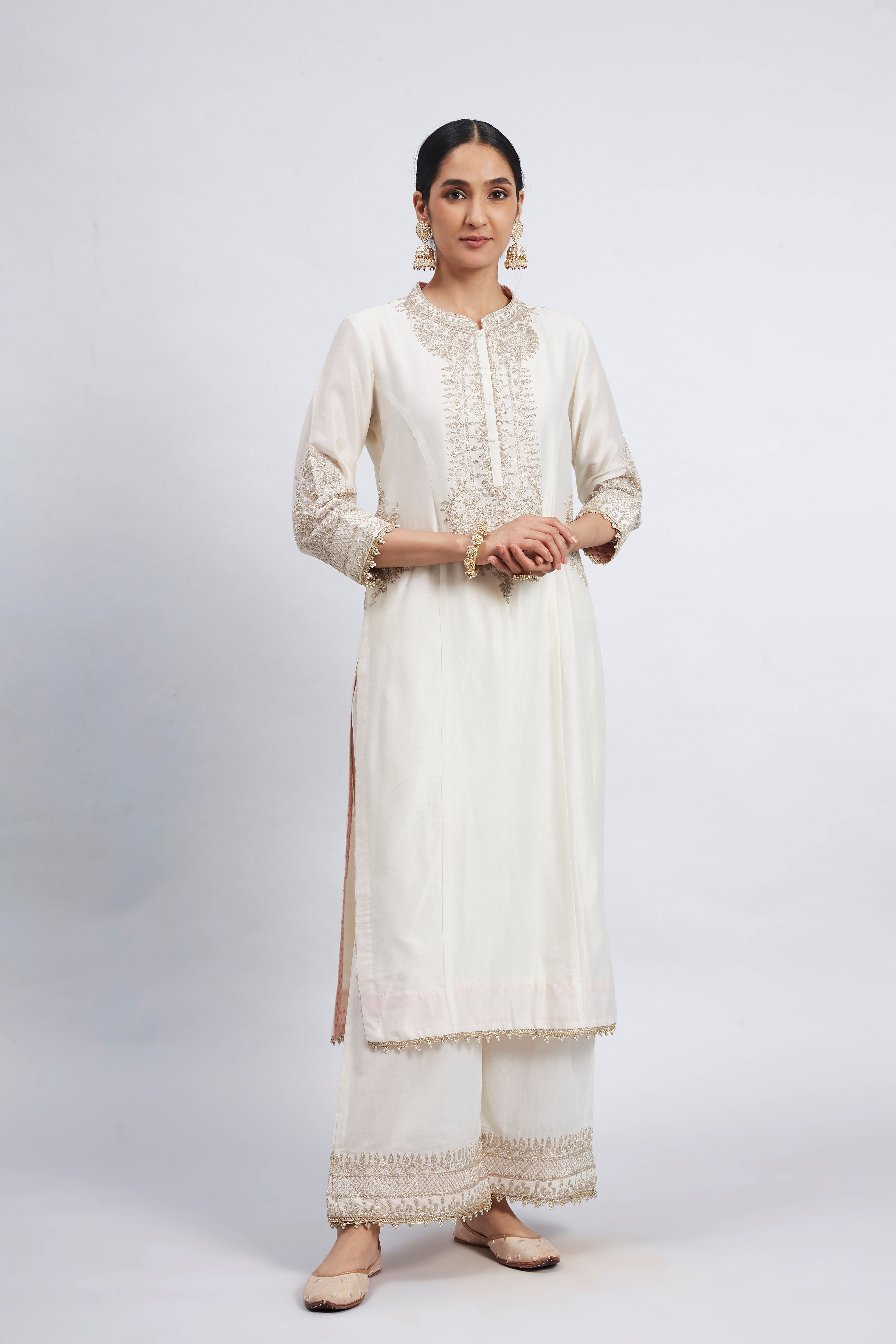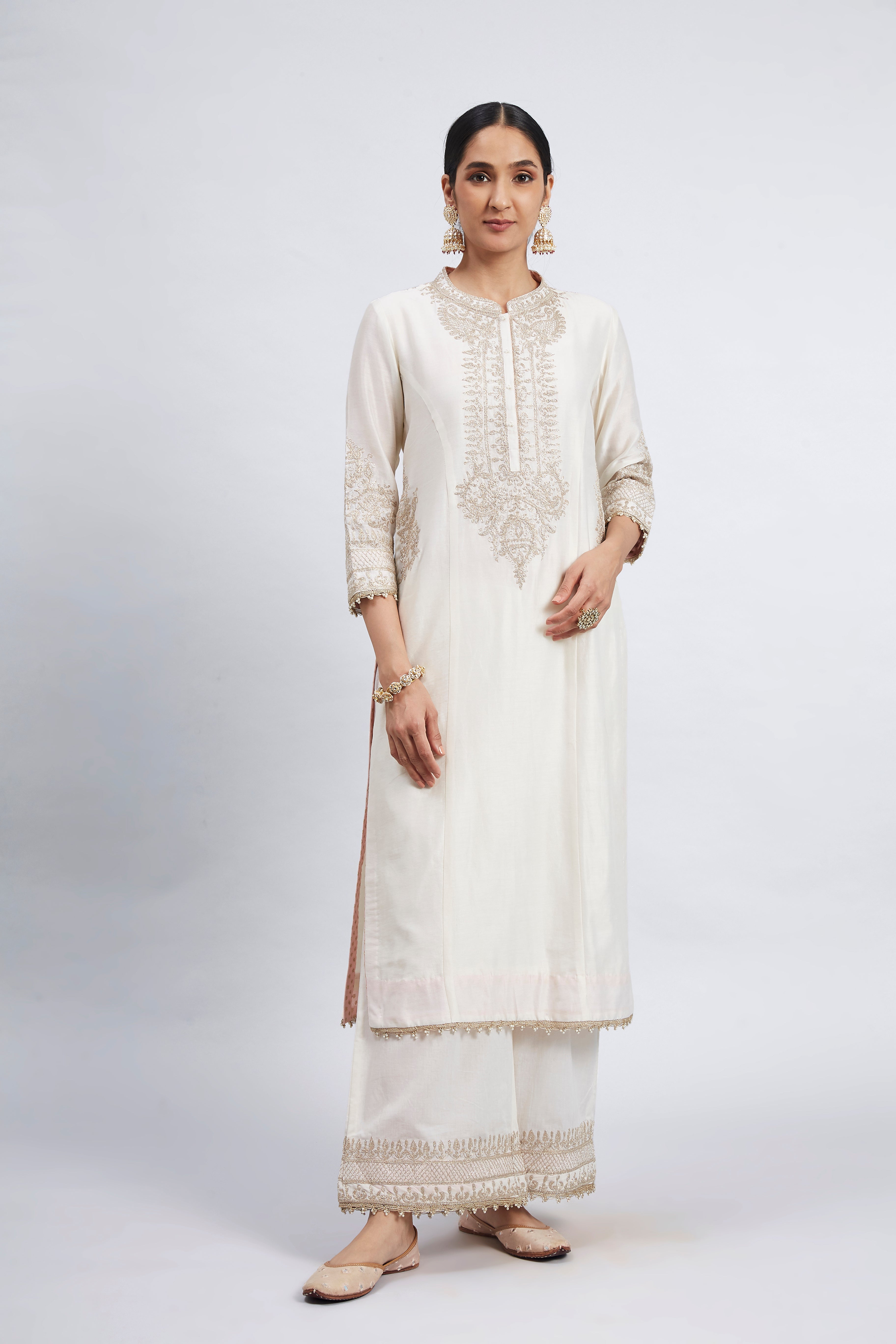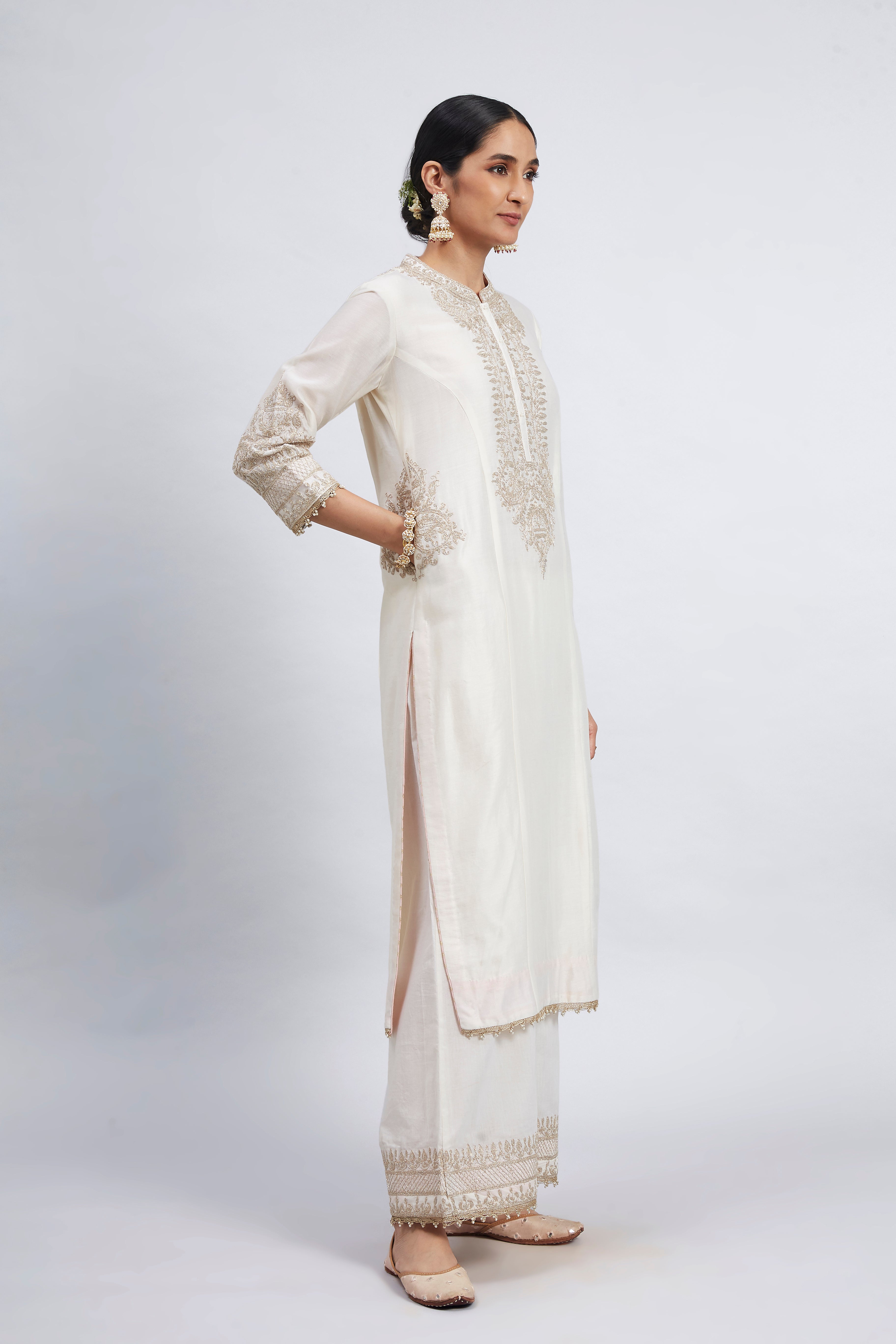 The Aadah Ensemble From Our Firozah Collection Is Made Using A Pure Chanderi Silk Fabric And Is Adorned With Heritage Kashmiri Tilla Embroidery. It Features A Mandarin Collar With A Placket, Three-Quarter Sleeves And Side Pockets. The Look Comes Together With A Straight Palazzo. The Outfit Is Finished Using An Exclusive Chanderi Silk Banarsi Fabric And Pearls.