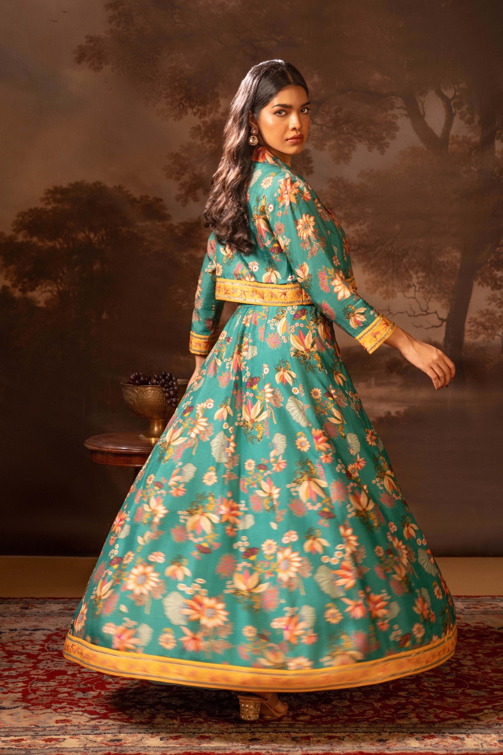 "Green Arani Printed Lehenga Set With An Embroidered Short Jacket In Silk.