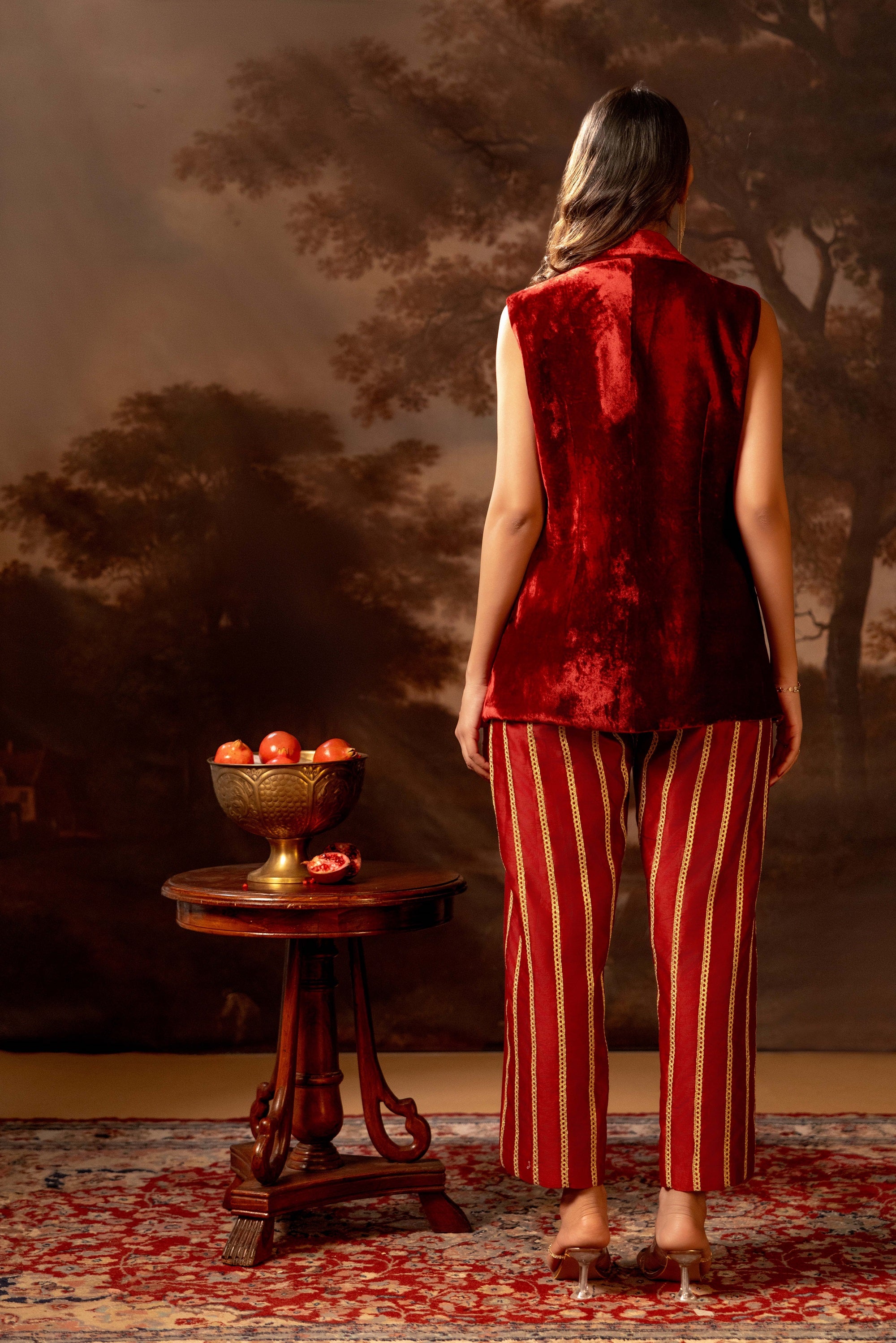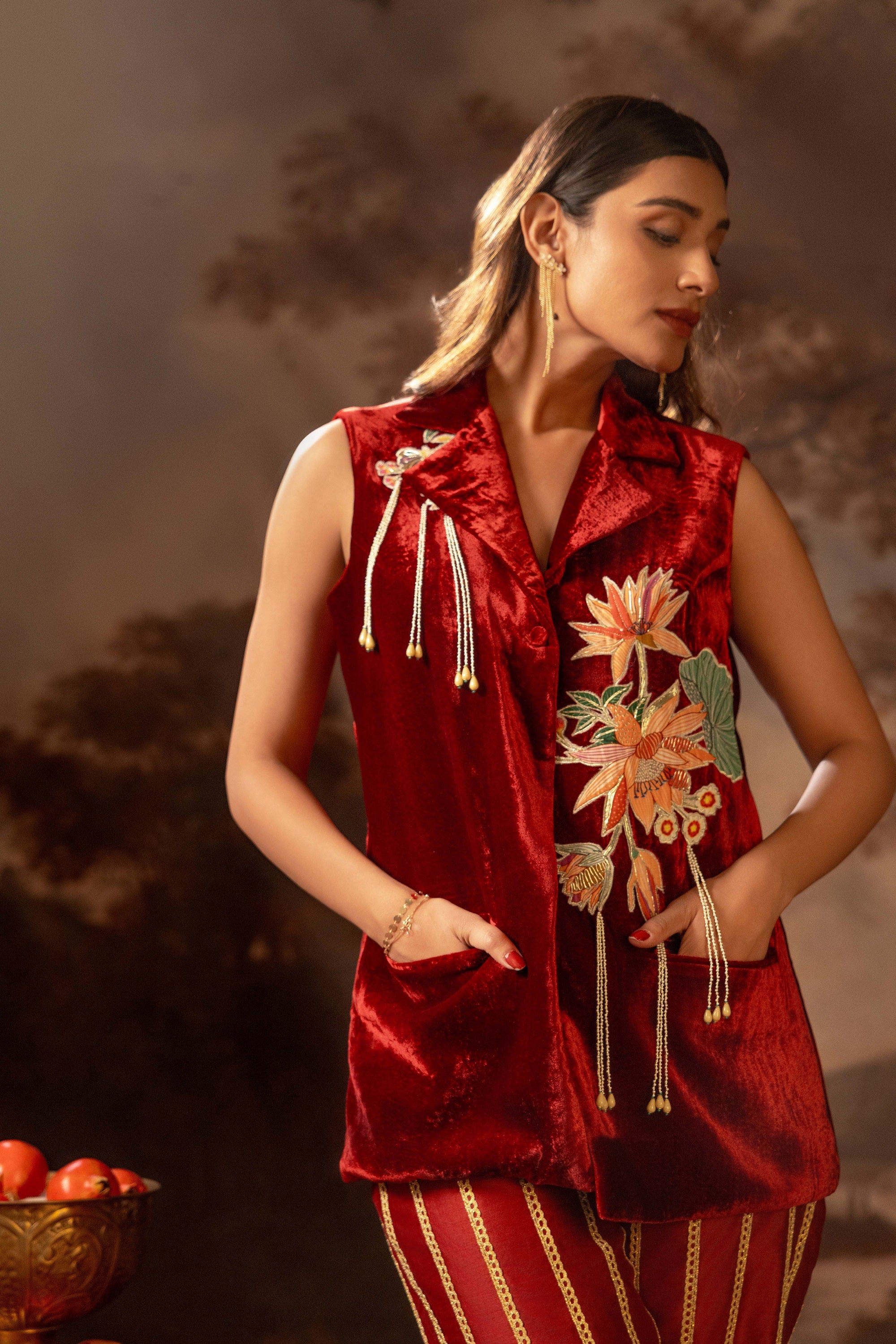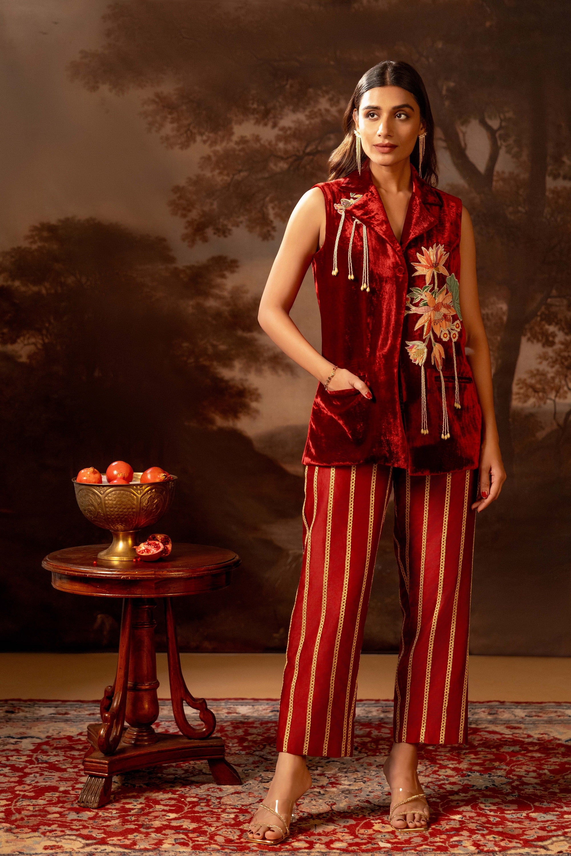 "Red Aarani Appliqué Blazer In Velvet, Paired With Embellished Striped Pants In Chanderi.