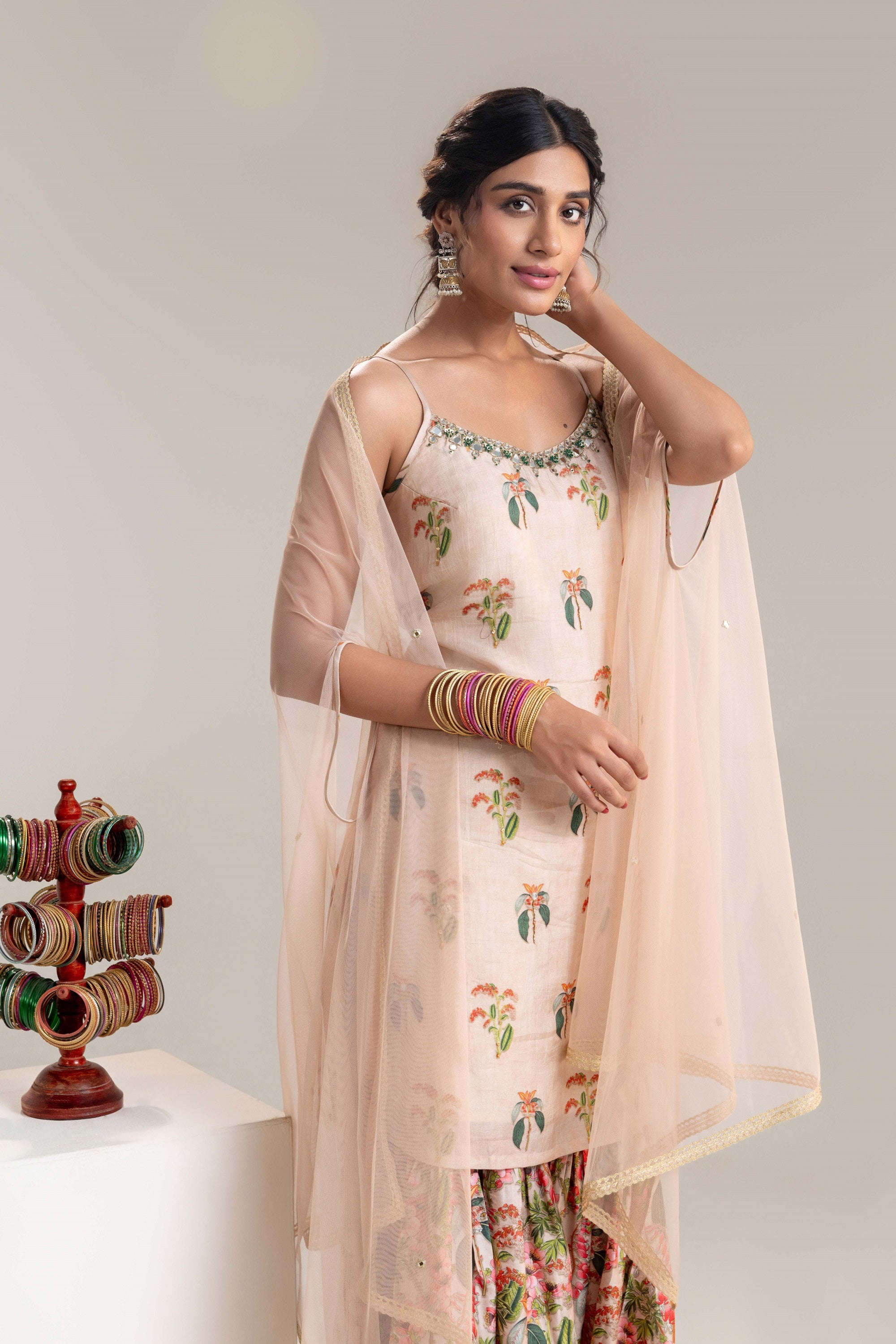 "Beige Aarani Embellished Sleeveless Kurta With Printed Sharara Pants, Paired With An Embroidered Cape In Net