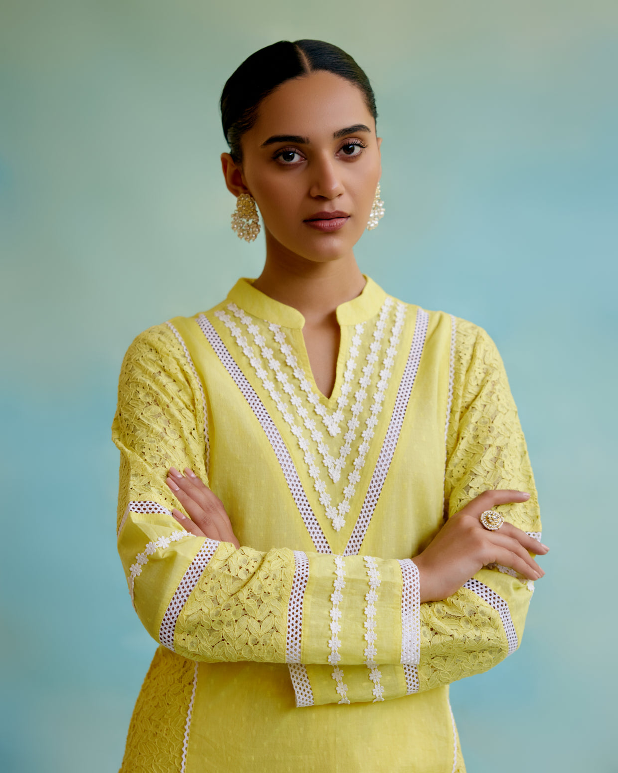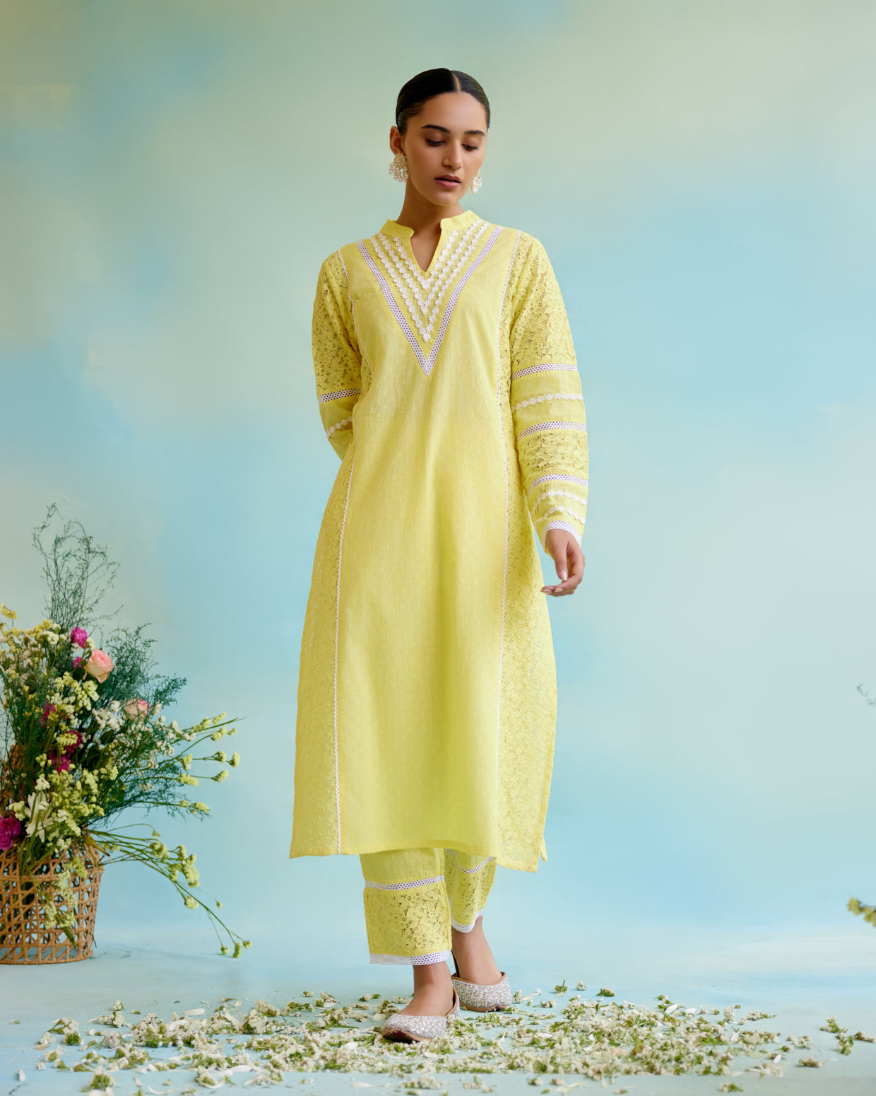 -Kurta in pure cotton dobby fabric with Schiffli Panel.