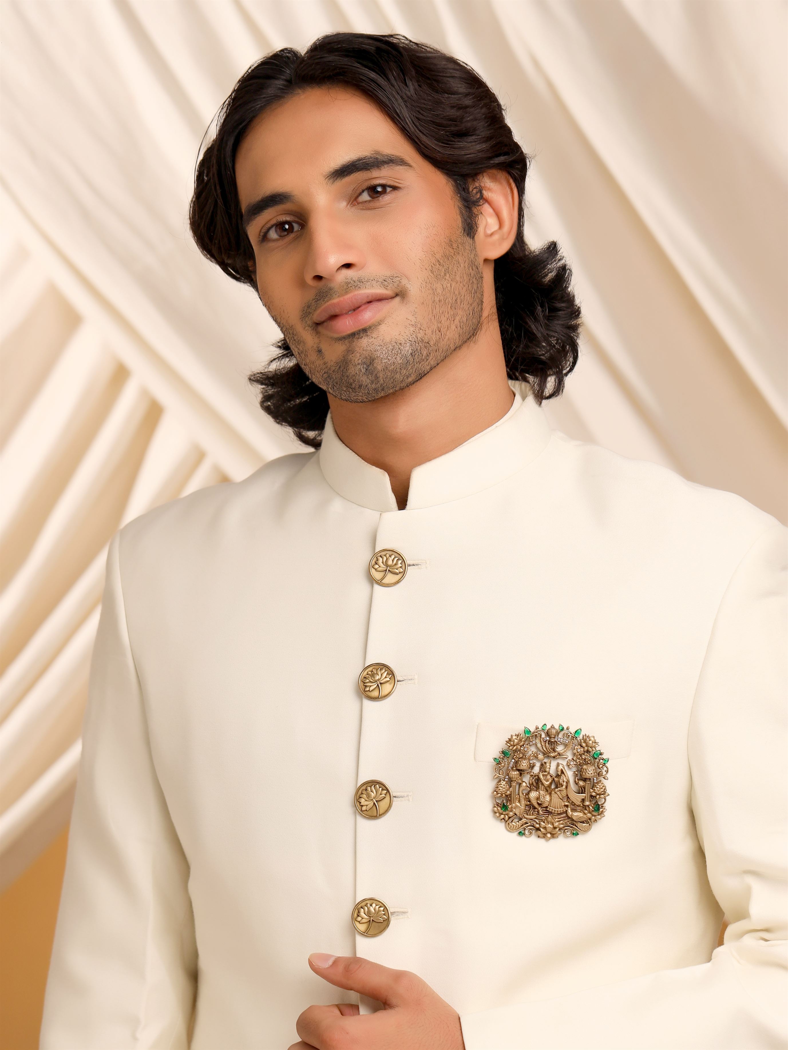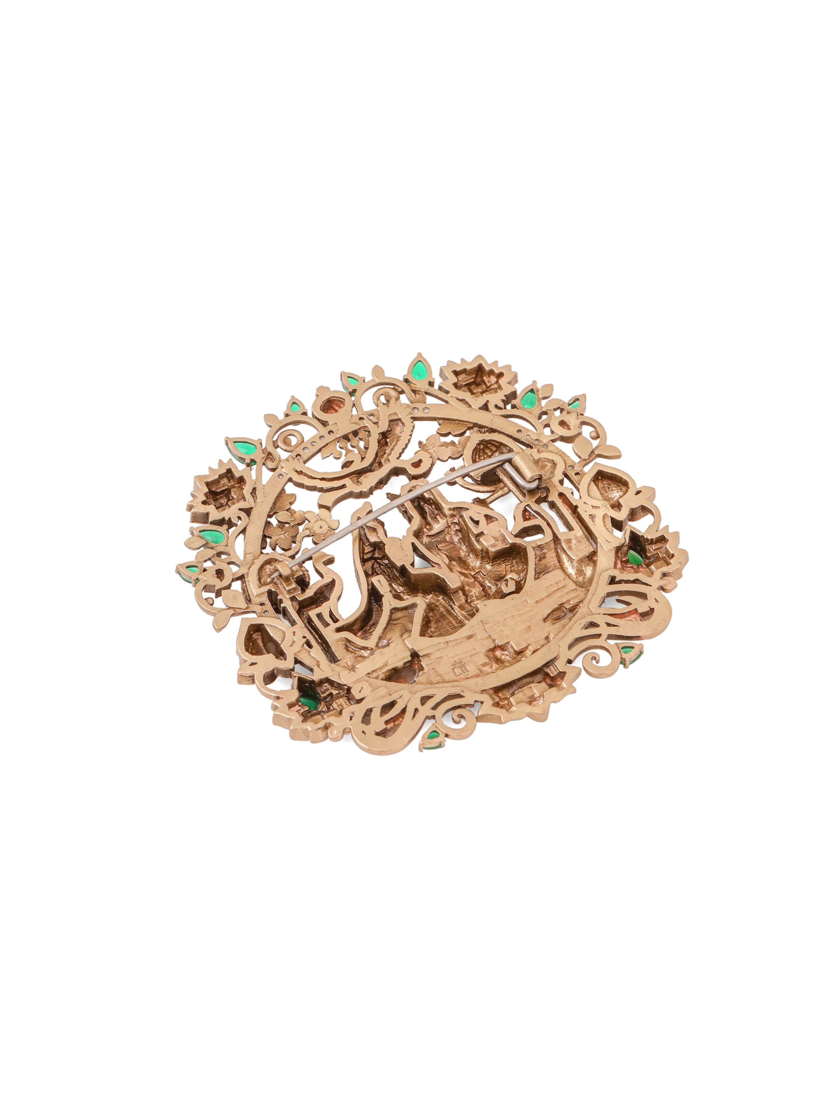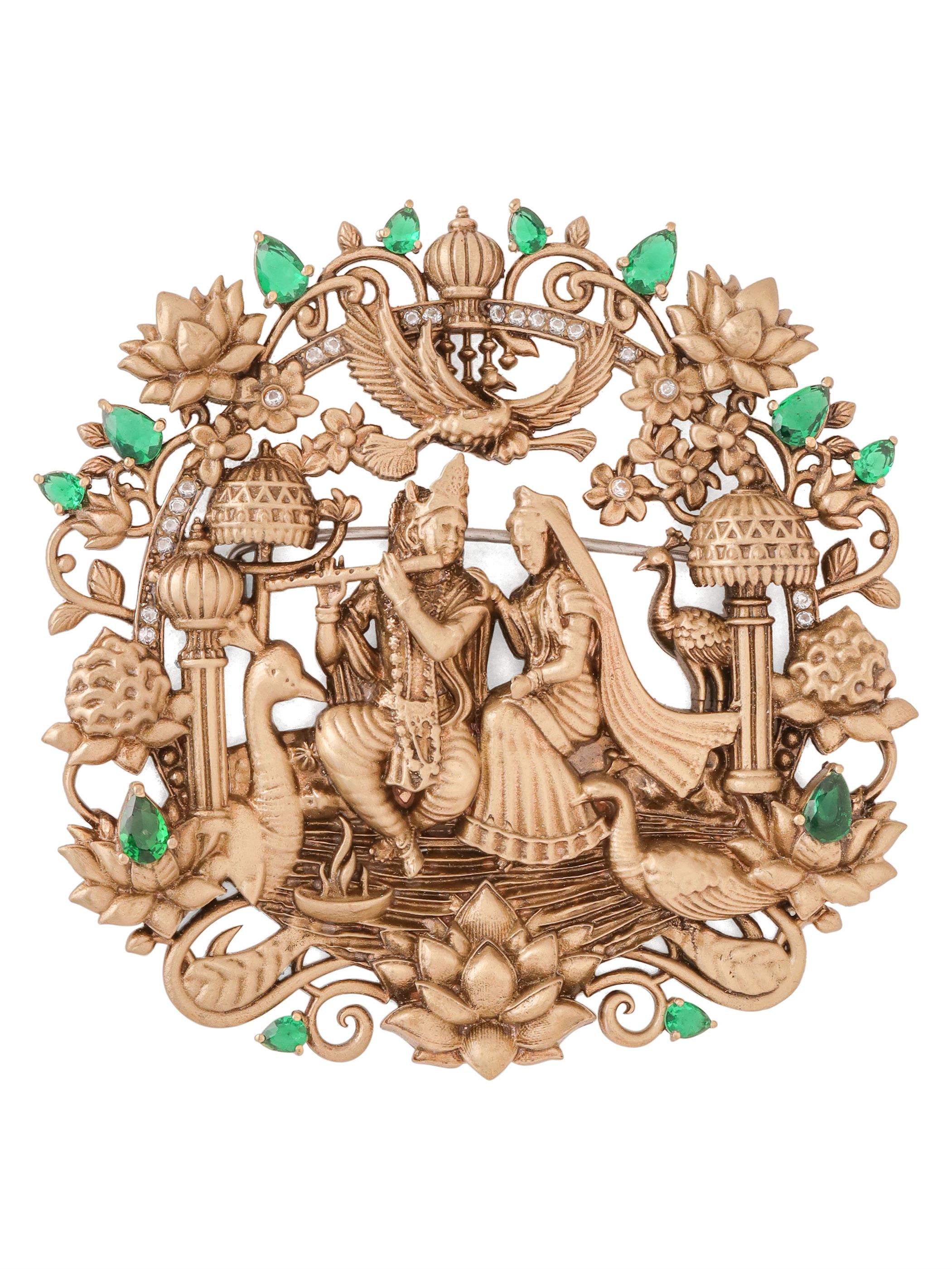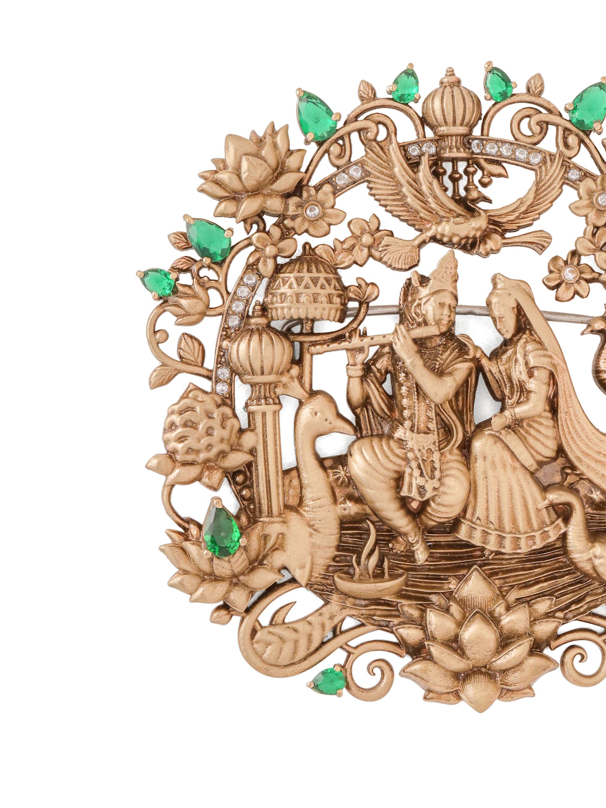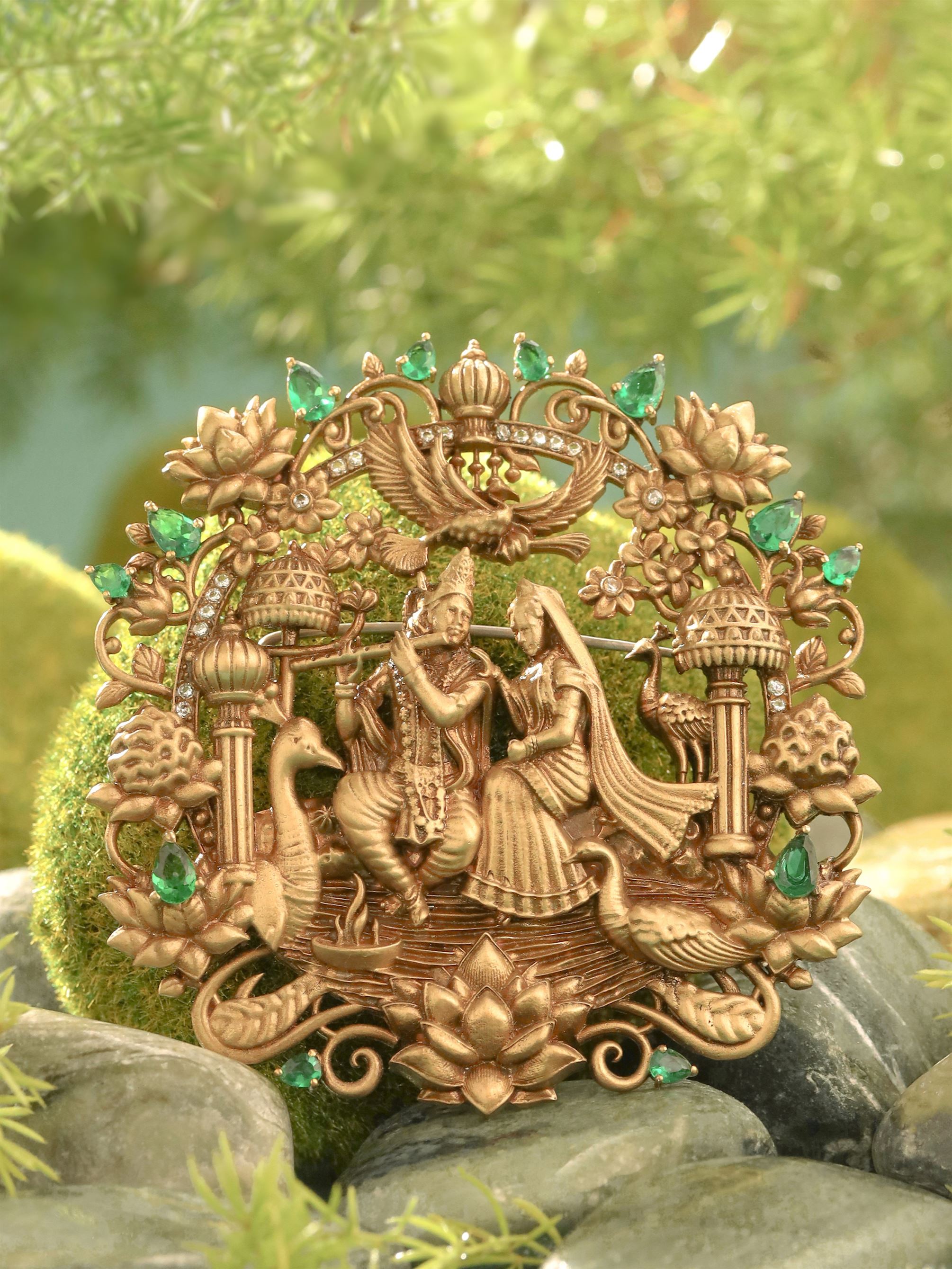 | Celebrate the eternal love of Radha and Krishna with the Divine Harmony Radha-Krishna Brooch. This exquisitely crafted accessory is a masterpiece of intricate design, featuring the divine couple surrounded by lush foliage, swans, and a majestic peacock. Studded with vibrant green gemstones, the brooch adds a touch of color and elegance to the golden backdrop. The detailing on the lotus flowers and the arched canopy above creates a serene and harmonious scene, perfect for those who appreciate spiritual symbolism and artistic craftsmanship. Ideal for festive occasions or as a statement piece, this brooch is a tribute to timeless love and beauty. |