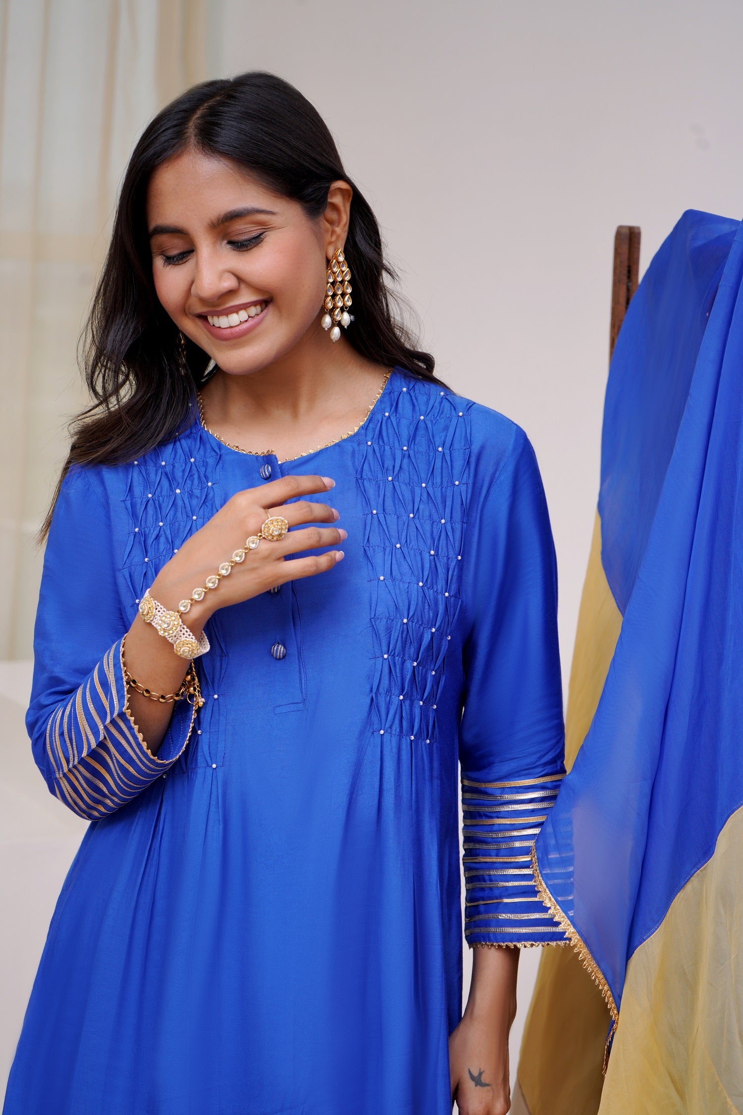 -Pair it with Electric Blue Silky Modal Wide Leg Chanderi Pants embellished with Gold Gota Laces.