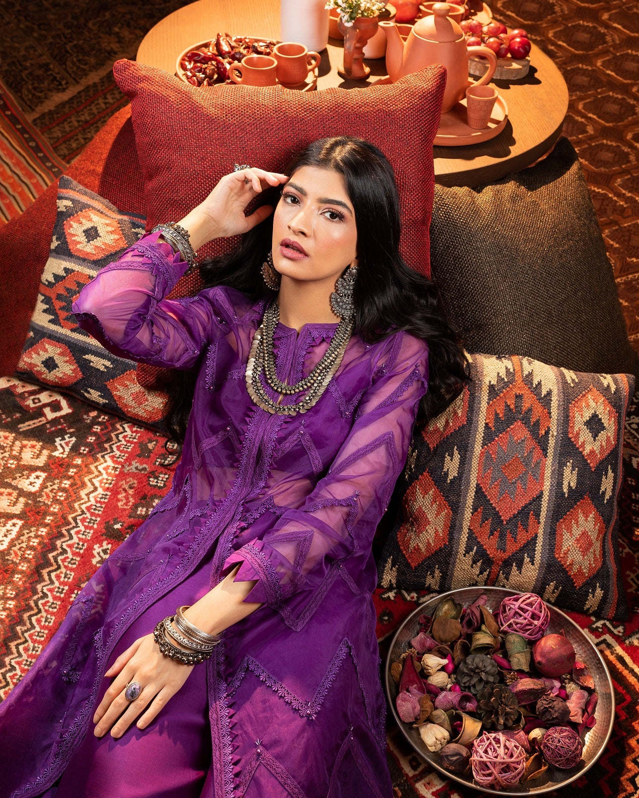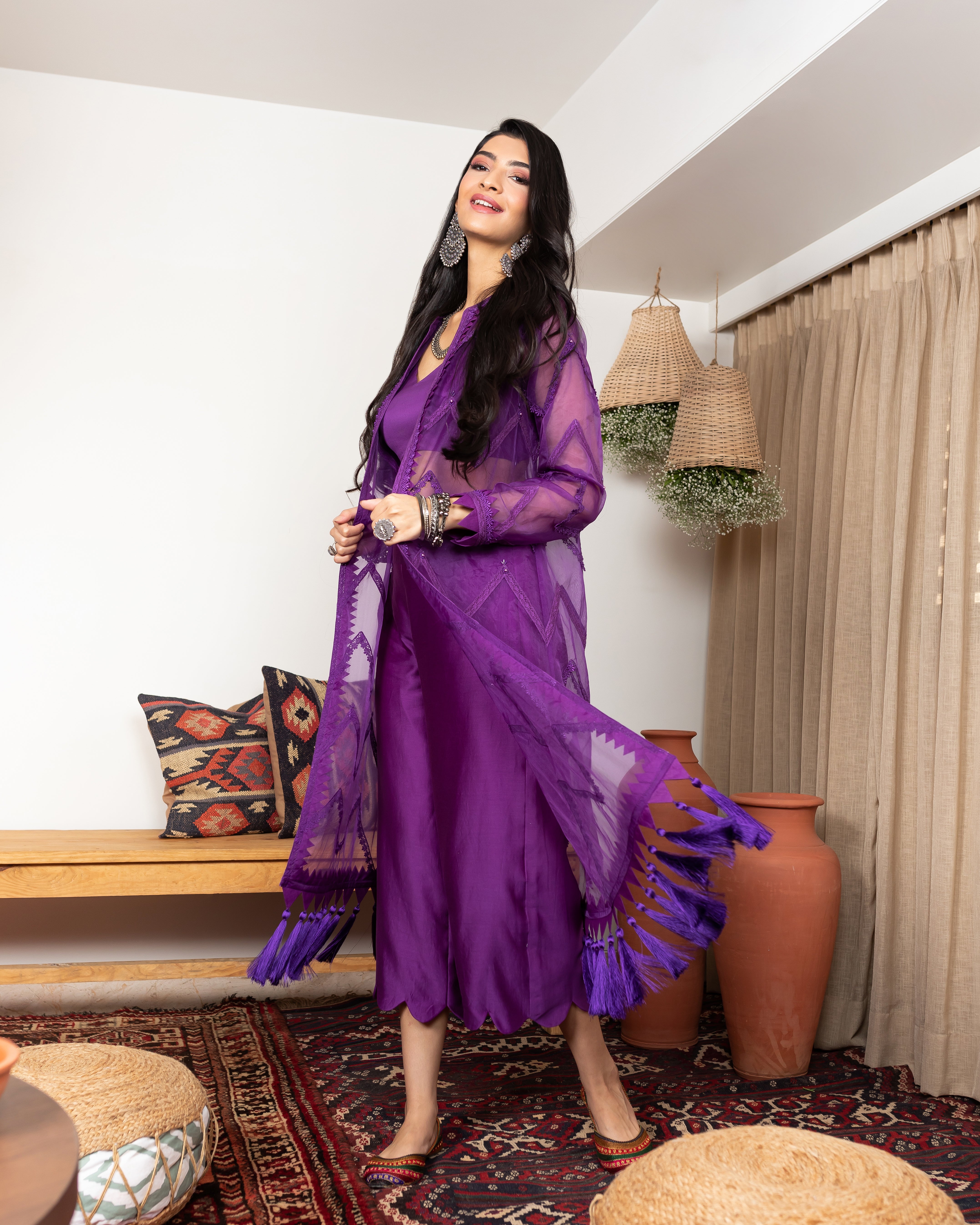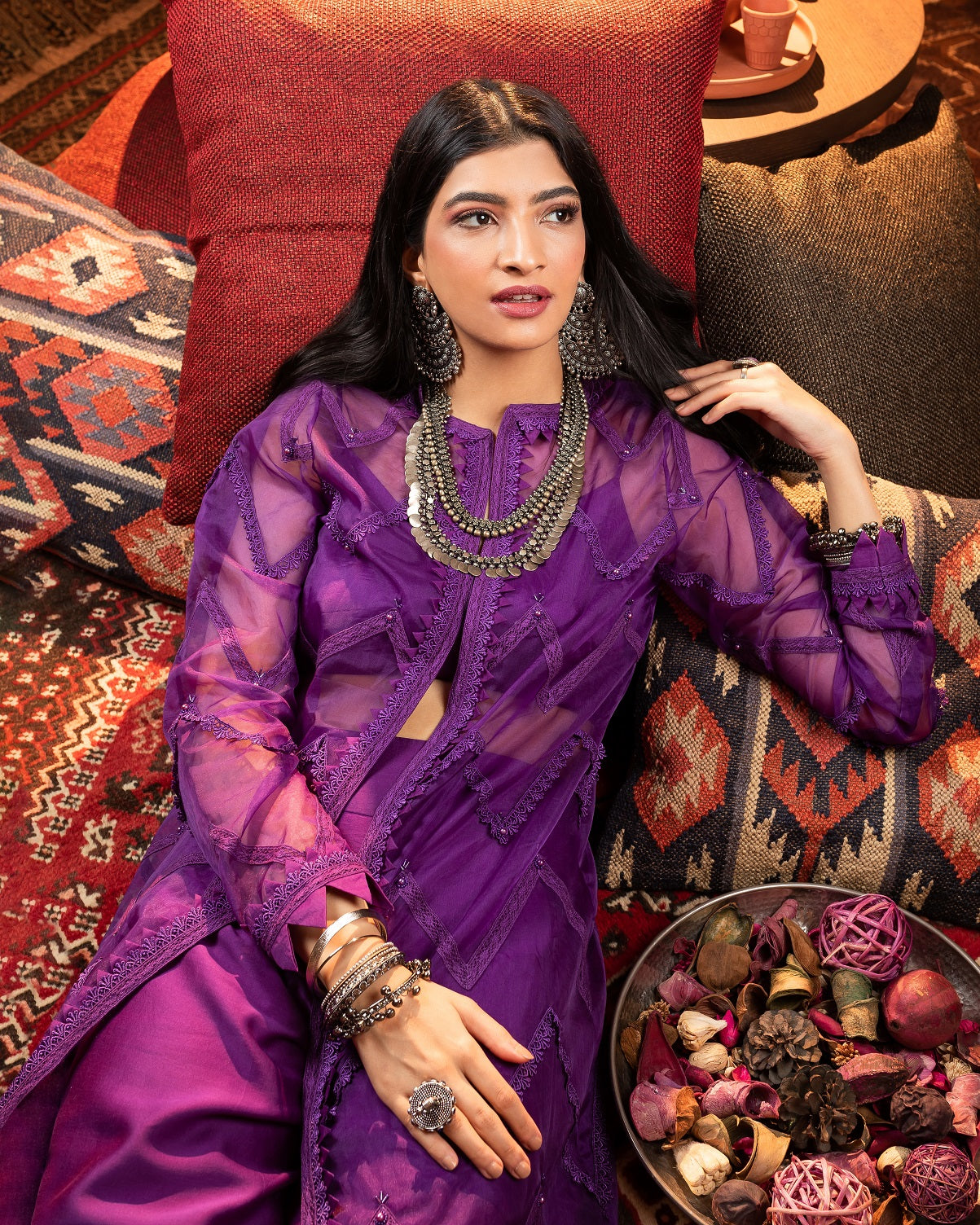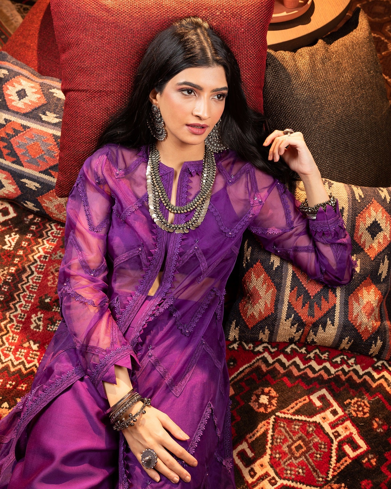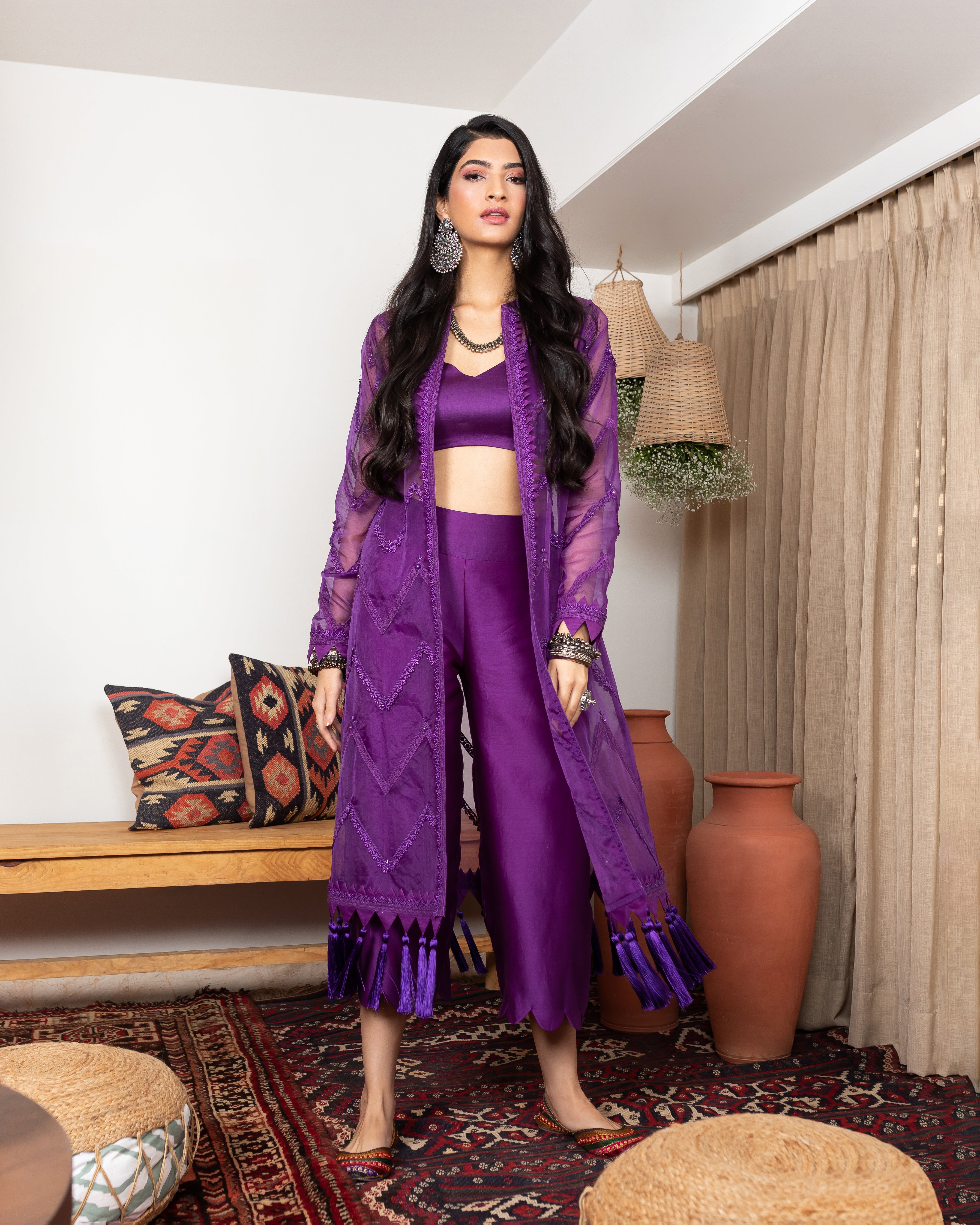 Featuring a purple jacket in a crepe, organza, and chanderi base with fringes. It is paired with matching pants and a blouse.