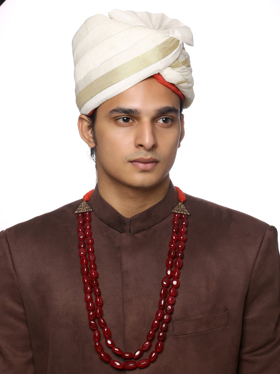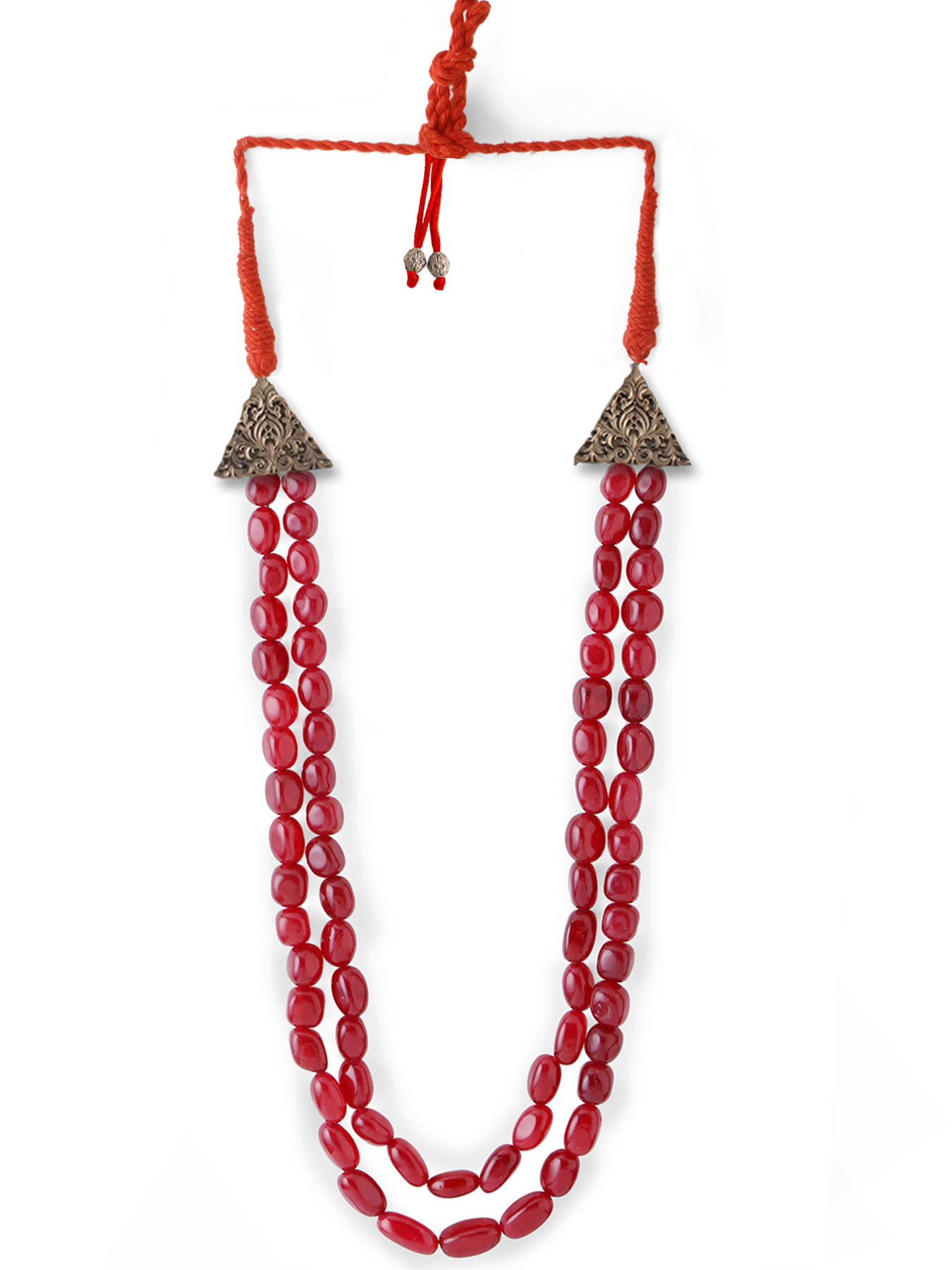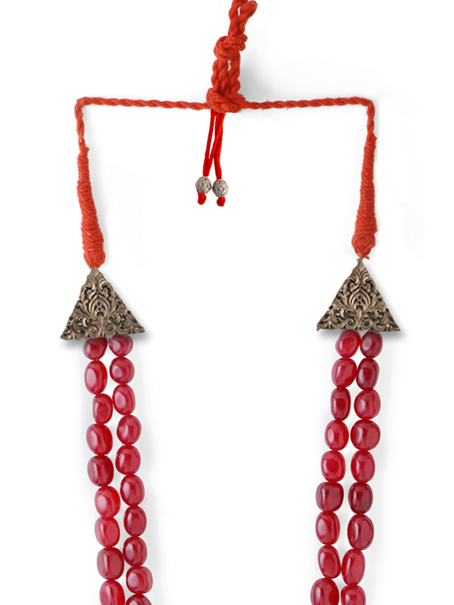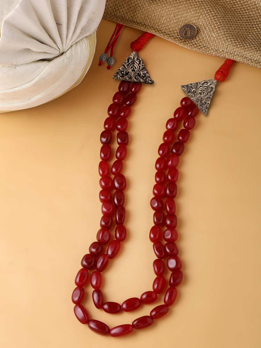 A stylish piece with red coloured double chains that beautifully cross and interlink, producing a traditional knot detail. This look is ideal for dressing up a conventional outfit since it strikes a balance between elegance and beauty. The stunning red stones increase its charm making it perfect for any special occasion.