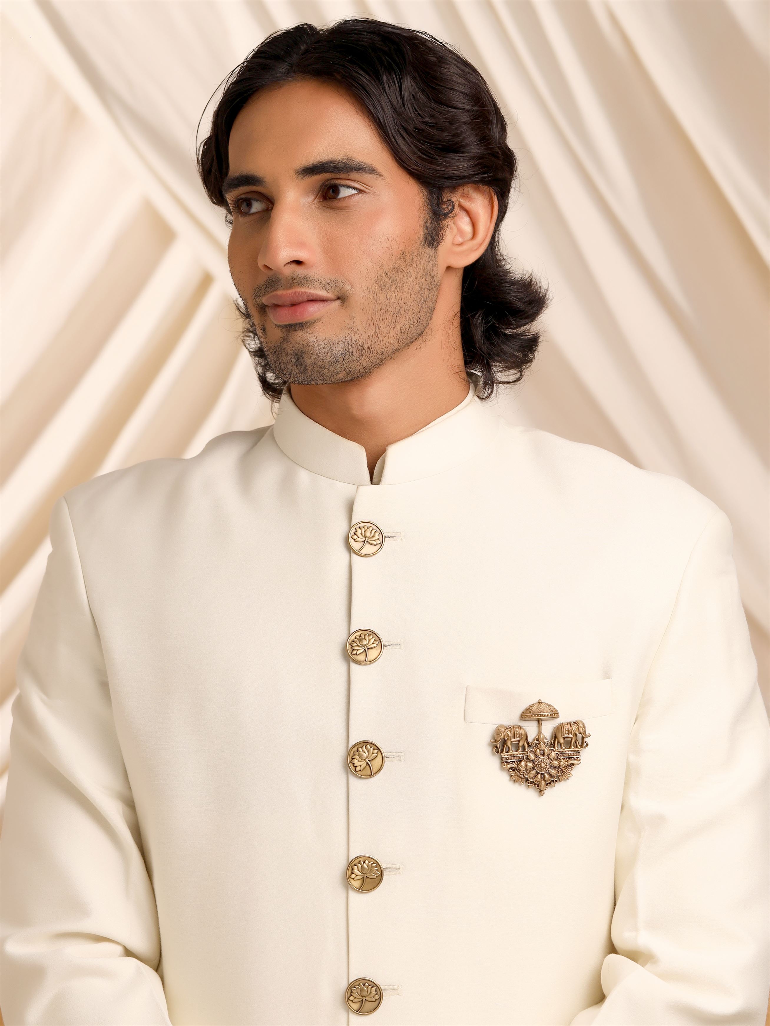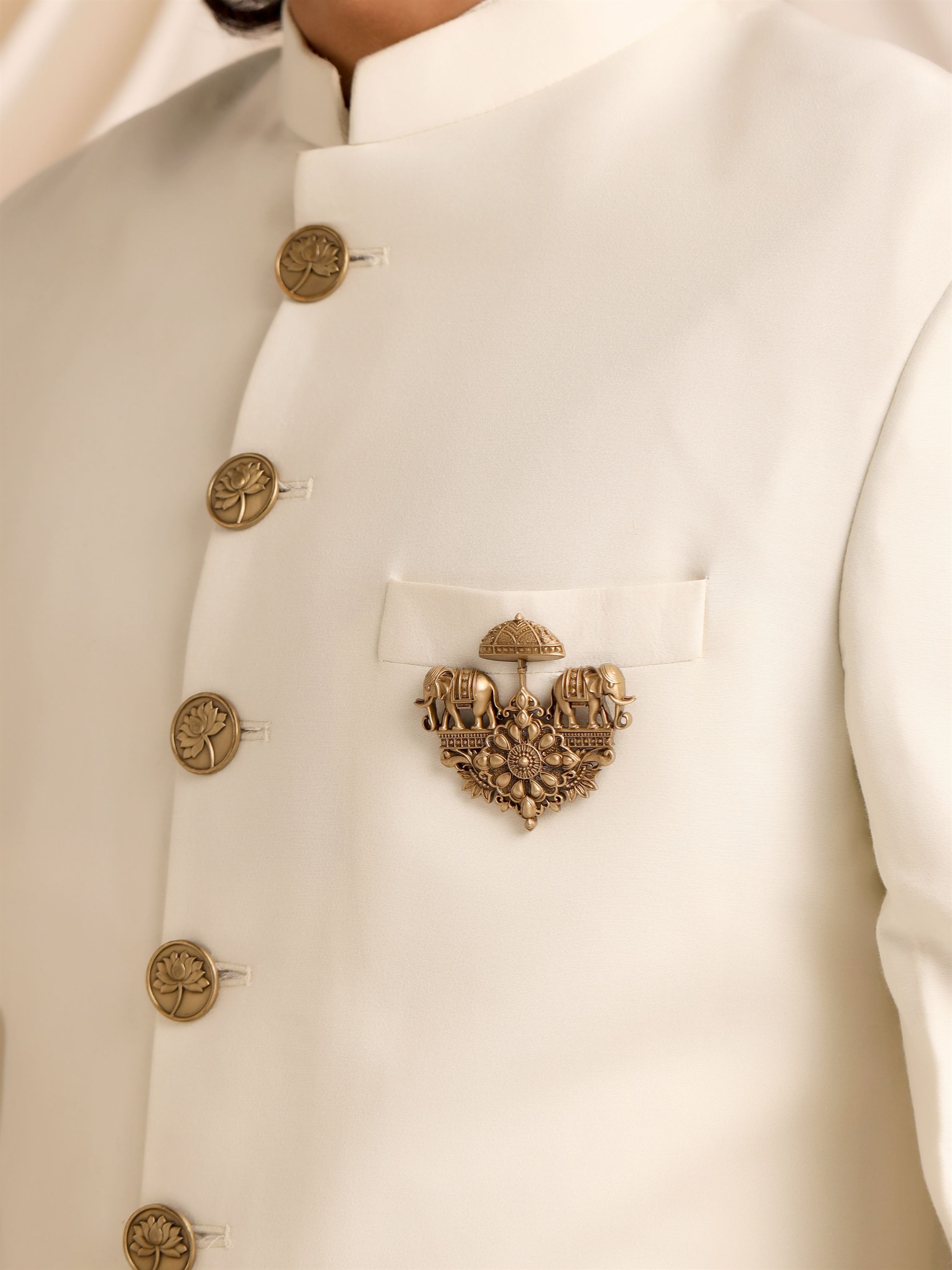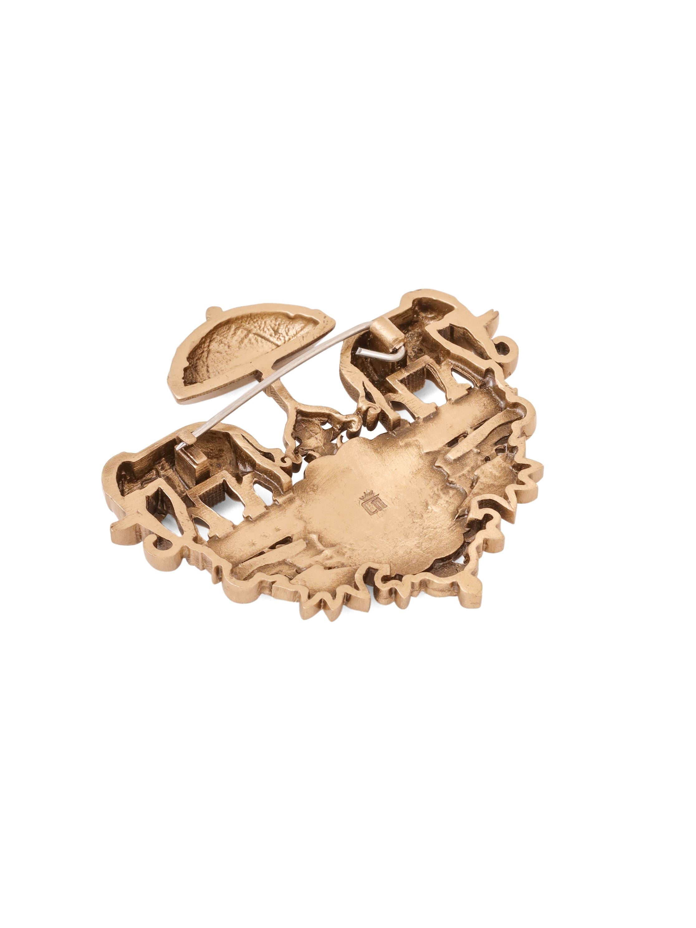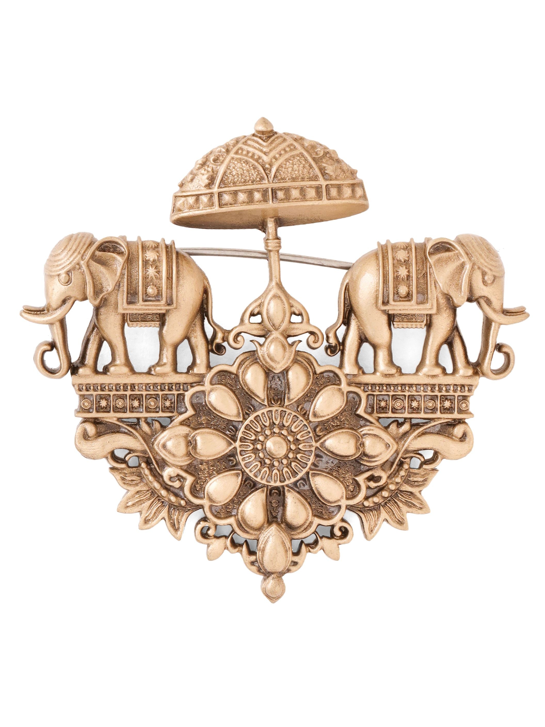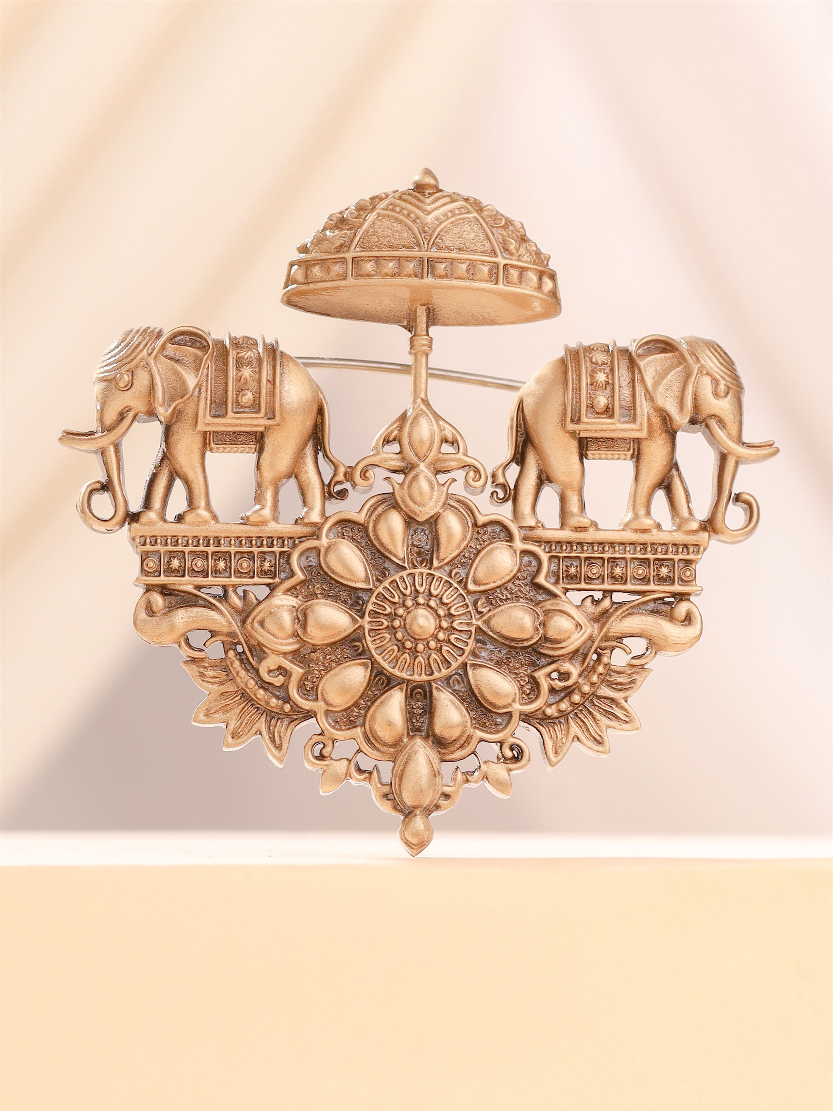 | Embrace the grandeur of ancient royalty with the Regal Elephant Chariot Brooch, a stunning piece that combines traditional artistry with timeless elegance. Handcrafted from premium brass, this brooch features two intricately detailed elephants, symbols of strength, wisdom, and prosperity, carrying a royal chariot under an ornate canopy. The centerpiece is adorned with a floral motif, adding a touch of delicate beauty to the majestic design. Perfect for those who appreciate heritage and luxury, this stone-studded brooch is a versatile accessory that can be worn on sarees, shawls, or even contemporary attire. The Regal Elephant Chariot Brooch not only enhances your outfit but also serves as a conversation piece, reflecting your refined taste and love for cultural artistry. Add this exquisite piece to your collection and let it be a symbol of your regal charm and timeless elegance |