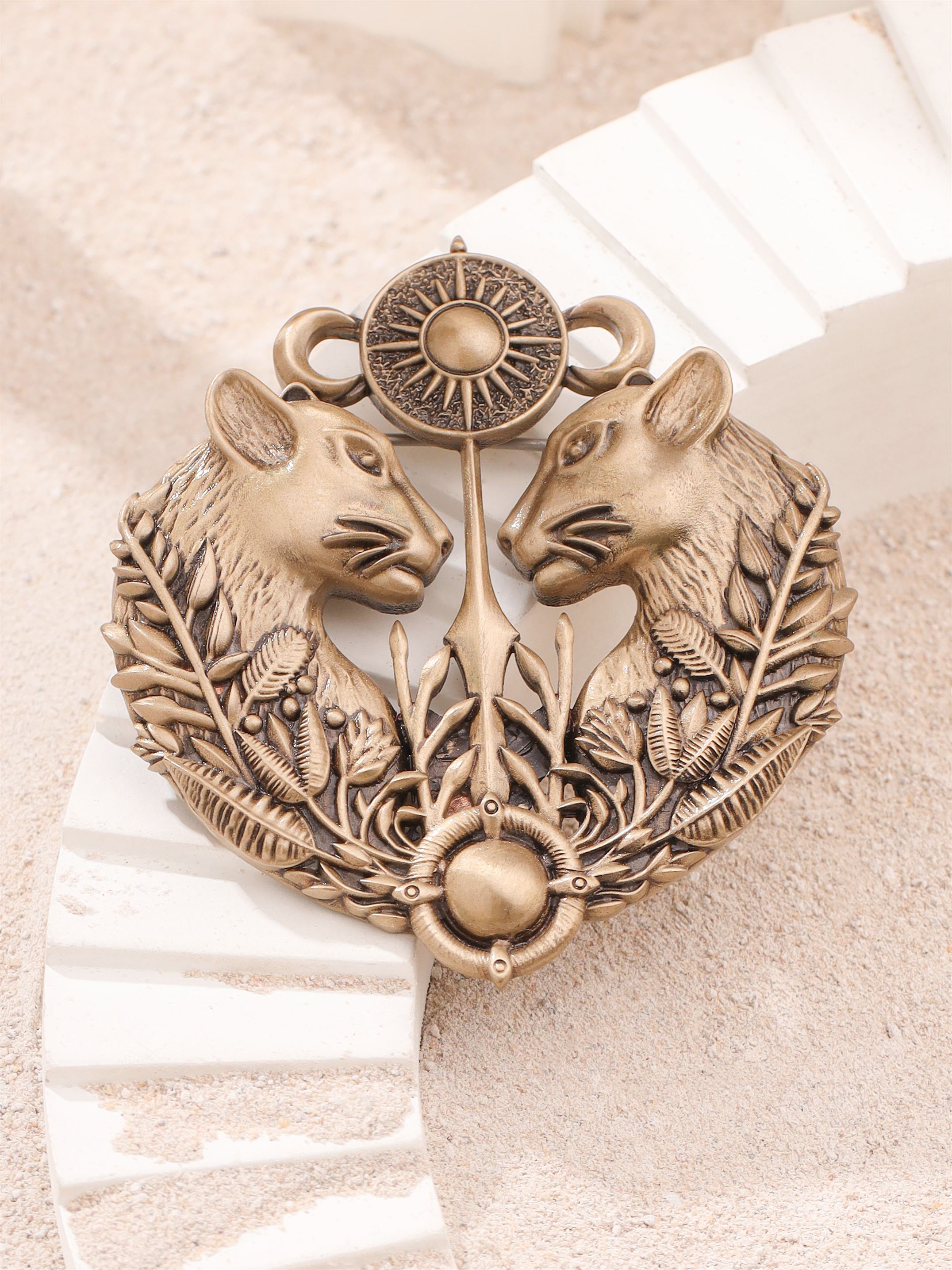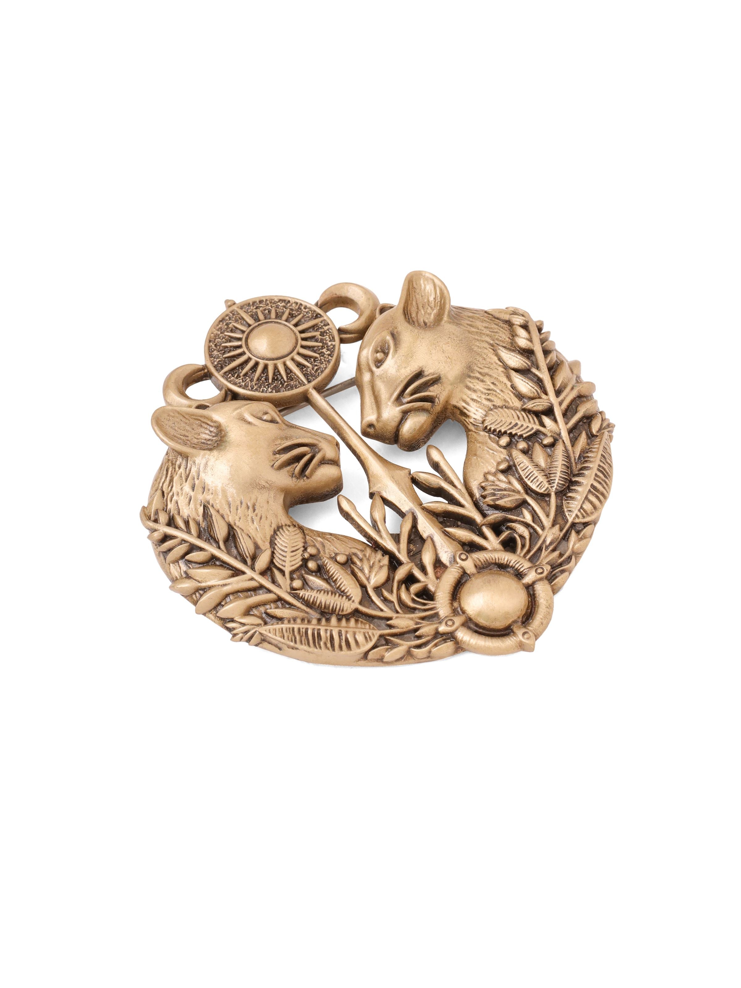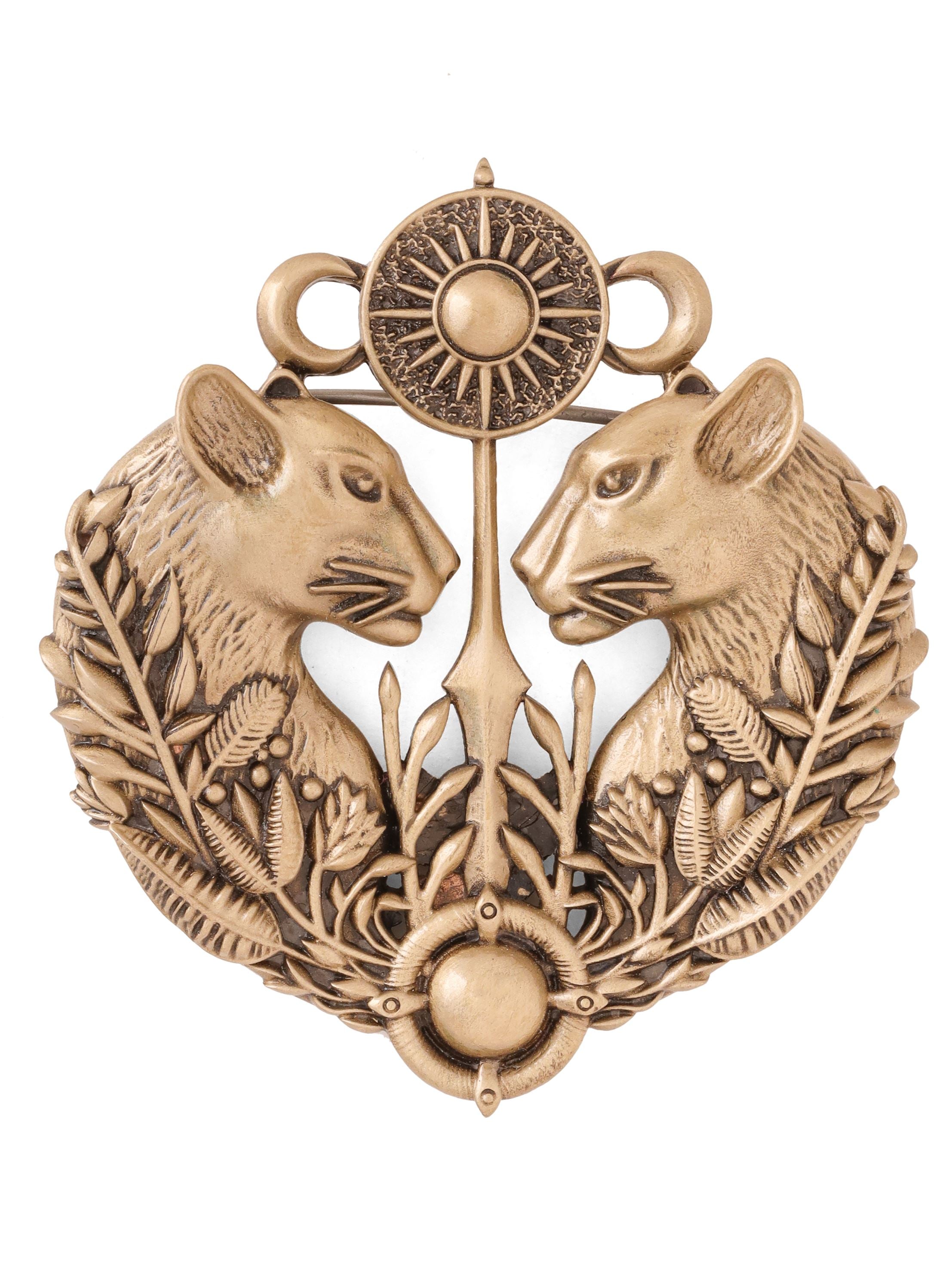 | This stately brass brooch, designed for jackets and bandhgalas, features two powerful panthers facing each other, symbolizing strength and nobility. Adorned with intricate foliage and crowned with a radiant sun motif, it reflects the grandeur of ancient royalty, making it a statement piece of timeless elegance. |