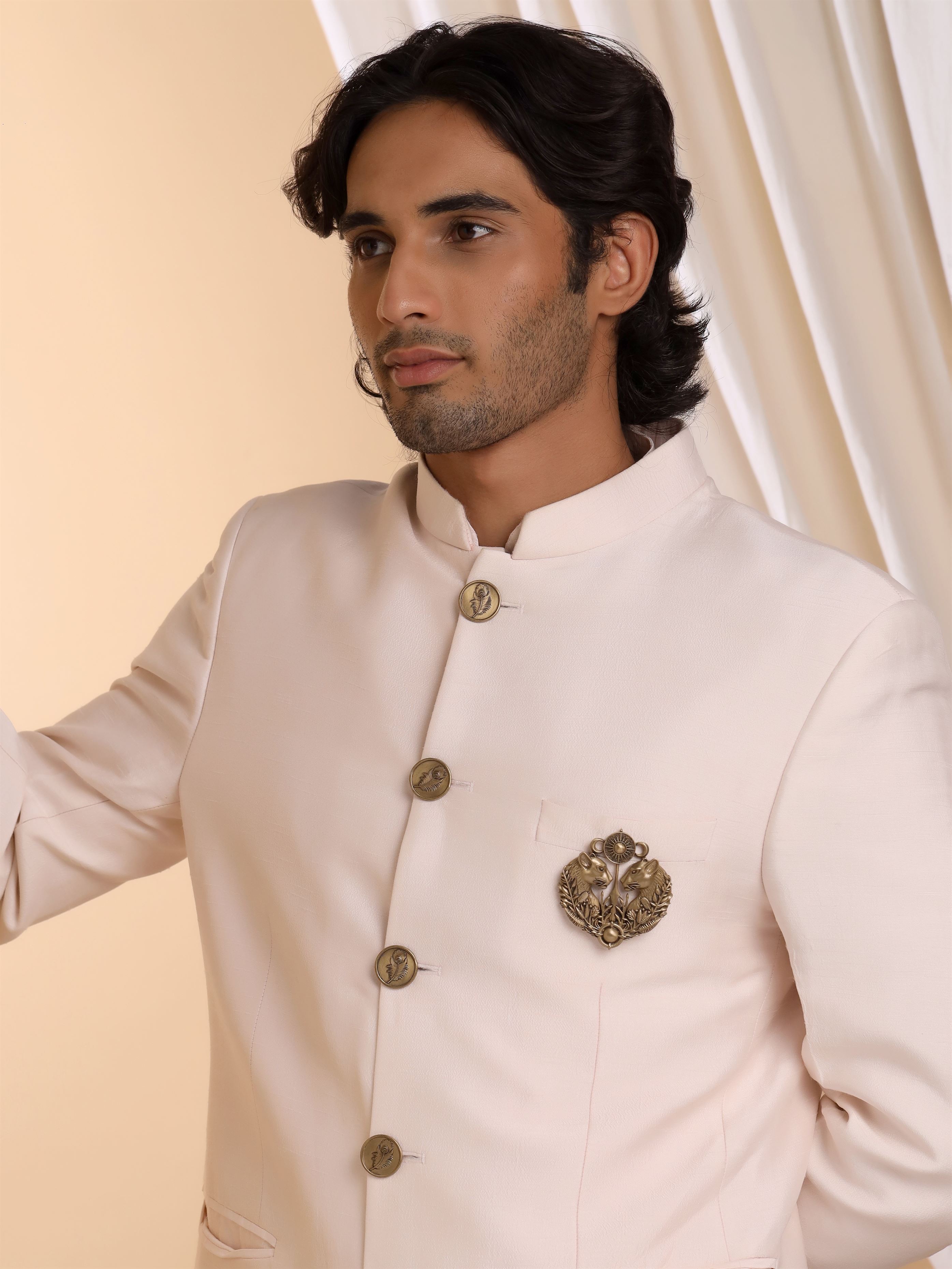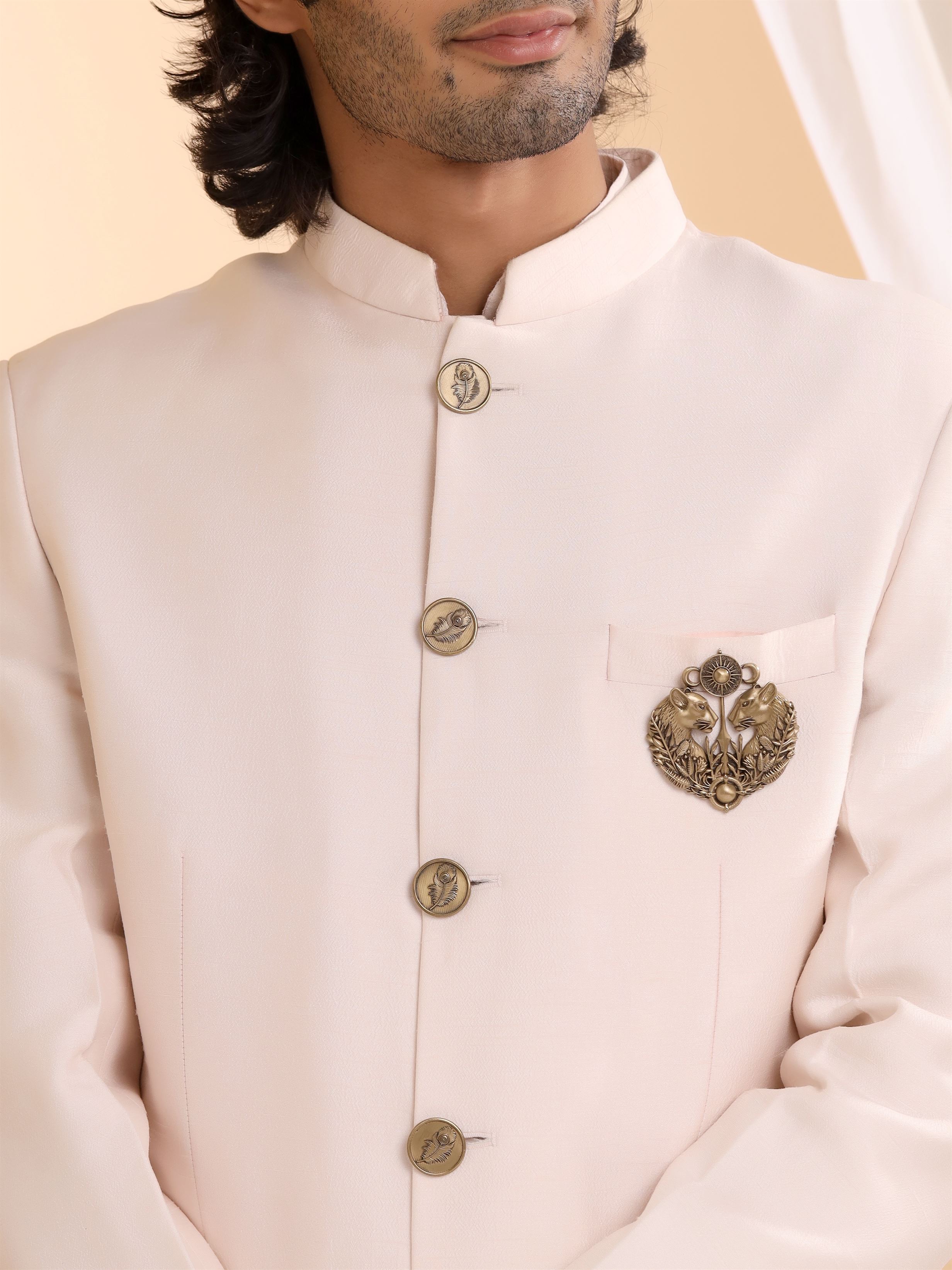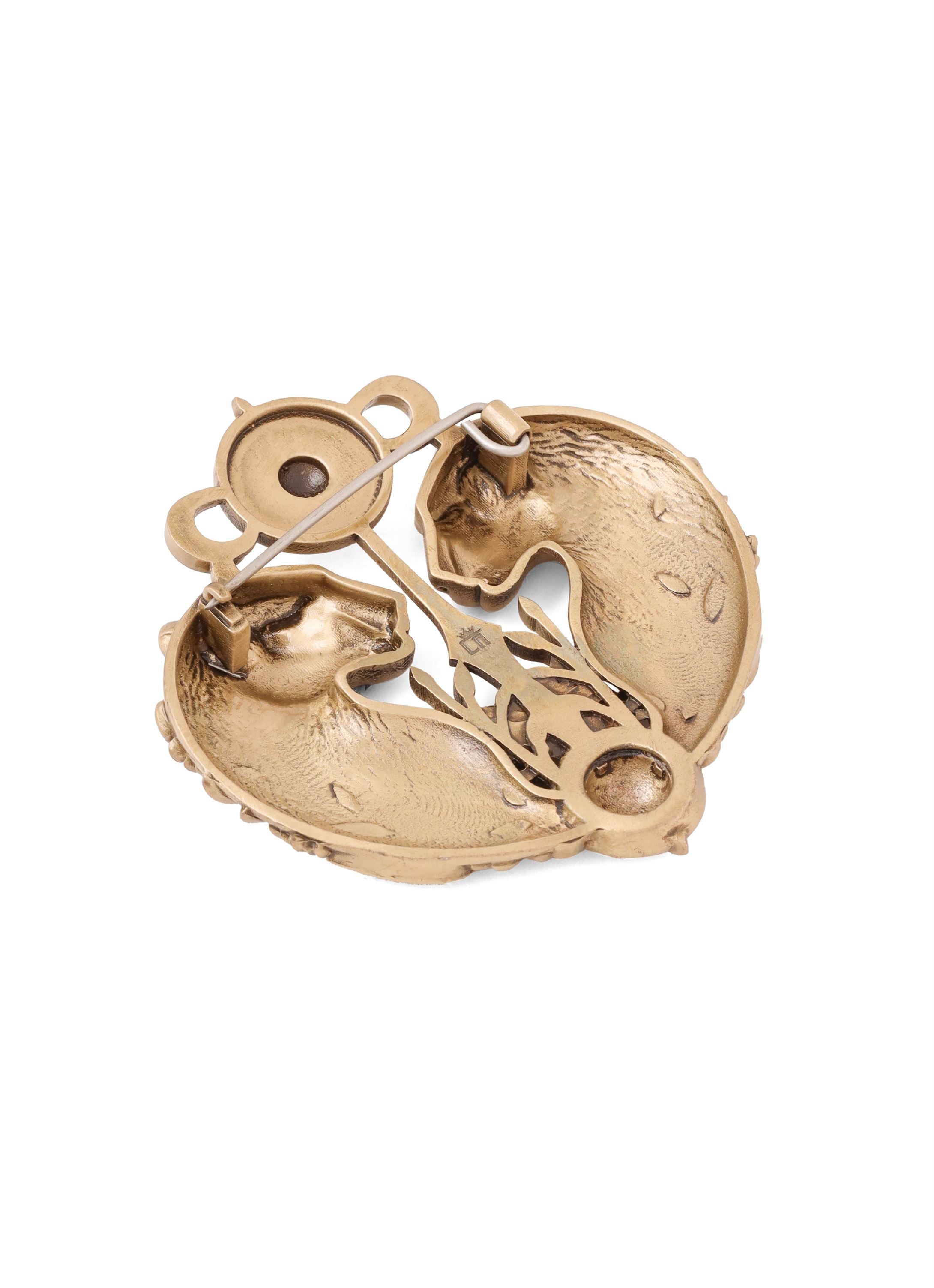 | This stately brass brooch, designed for jackets and bandhgalas, features two powerful panthers facing each other, symbolizing strength and nobility. Adorned with intricate foliage and crowned with a radiant sun motif, it reflects the grandeur of ancient royalty, making it a statement piece of timeless elegance. |