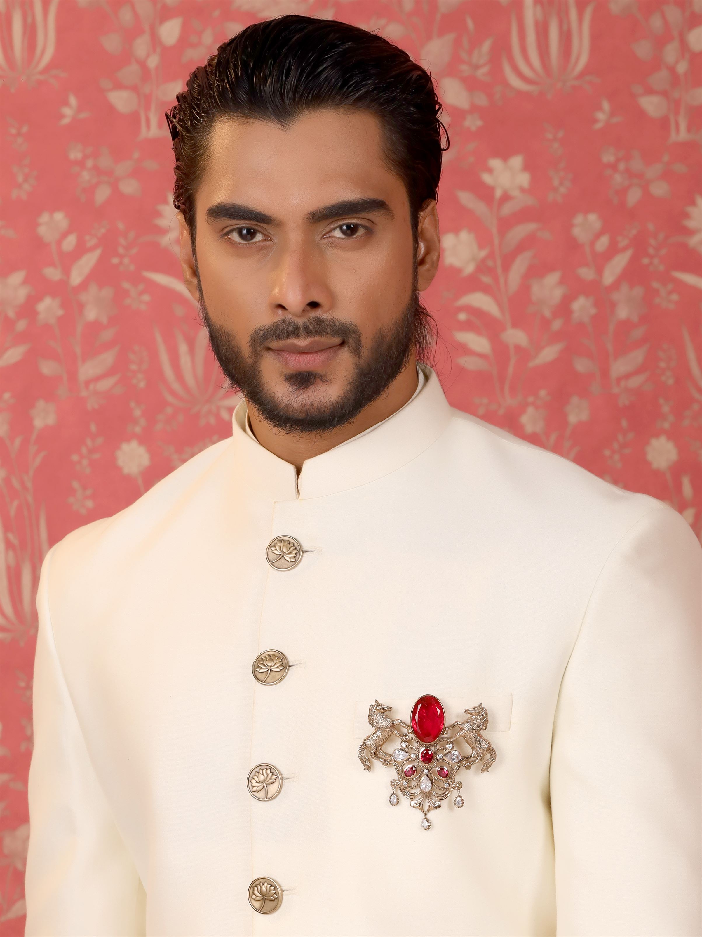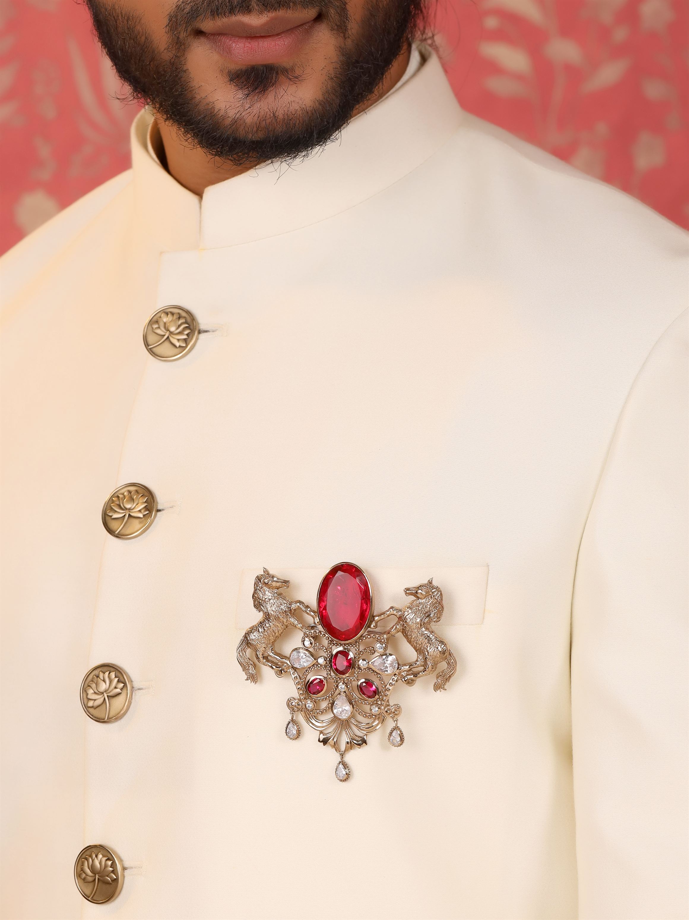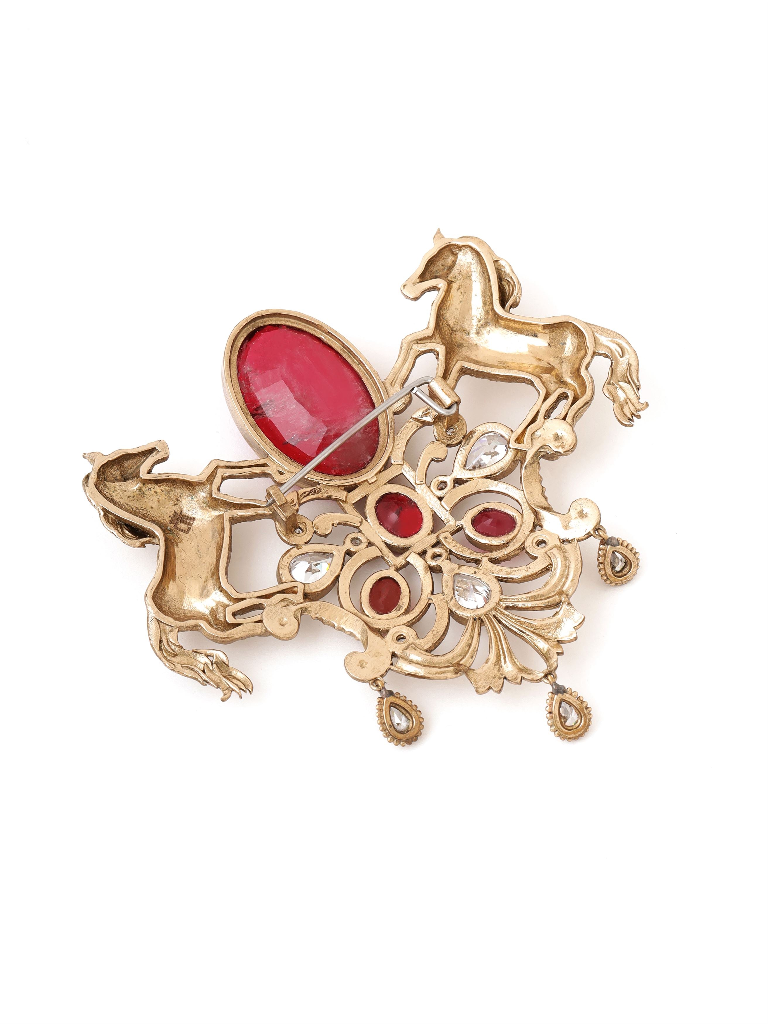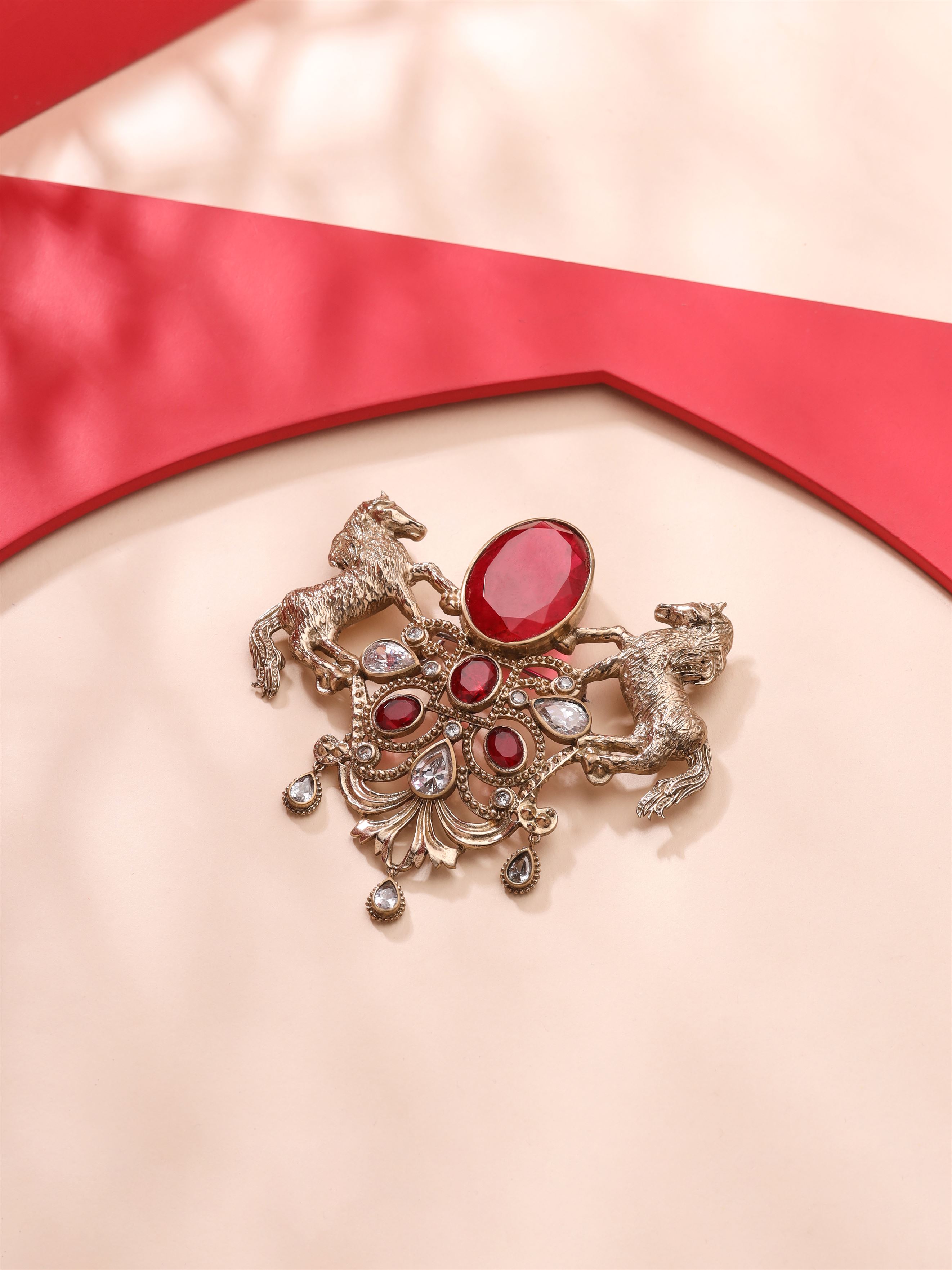 The "Roshan-e-Sawaar Brooch" is an enchanting ode to untamed beauty. This captivating accessory showcases two intricately designed galloping horses, adorned with four stunning green gemstones that exude elegance and vitality. The Glitter Horse Brooch captures the untamed grace and boundless energy of these majestic creatures, empowering every modern individual to embrace their inner strength and free spirit. With its dazzling beauty and symbolic significance, this brooch is the perfect statement piece to add glamour to any outfit..