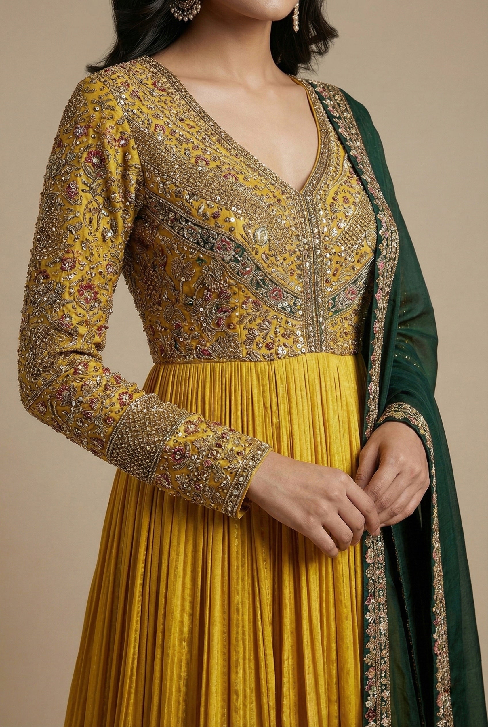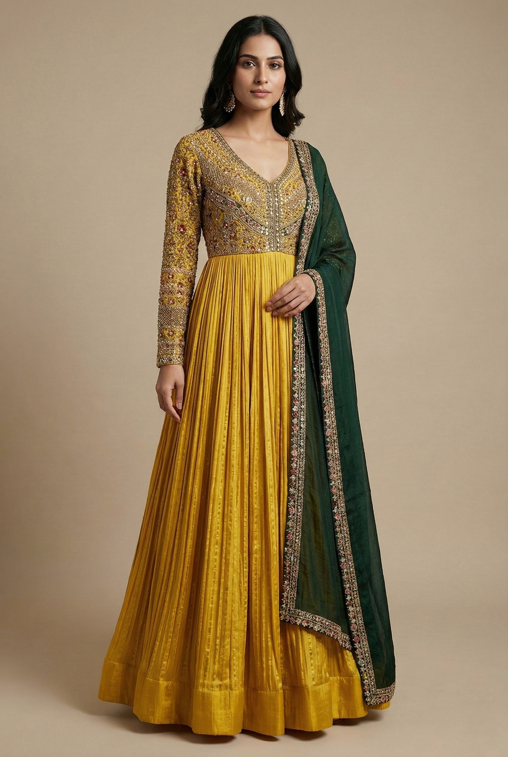 Elevate Your Ethnic Wardrobe With This Stunning Yellow Anarkali Set. Crafted From Luxurious Crush Shimmer Fabric, The Anarkali Flows Gracefully, Offering A Flattering Silhouette That Blends Elegance With Comfort. The Soft Chinon Dupatta Adds A Delicate, Airy Touch, Perfectly Complementing The Shimmer Of The Dress. Ideal For Festive Occasions, Weddings, Or Celebrations, This Anarkali Set Exudes Charm And Sophistication. Pair It With Statement Jewelry And Heels For A Complete, Radiant Look.