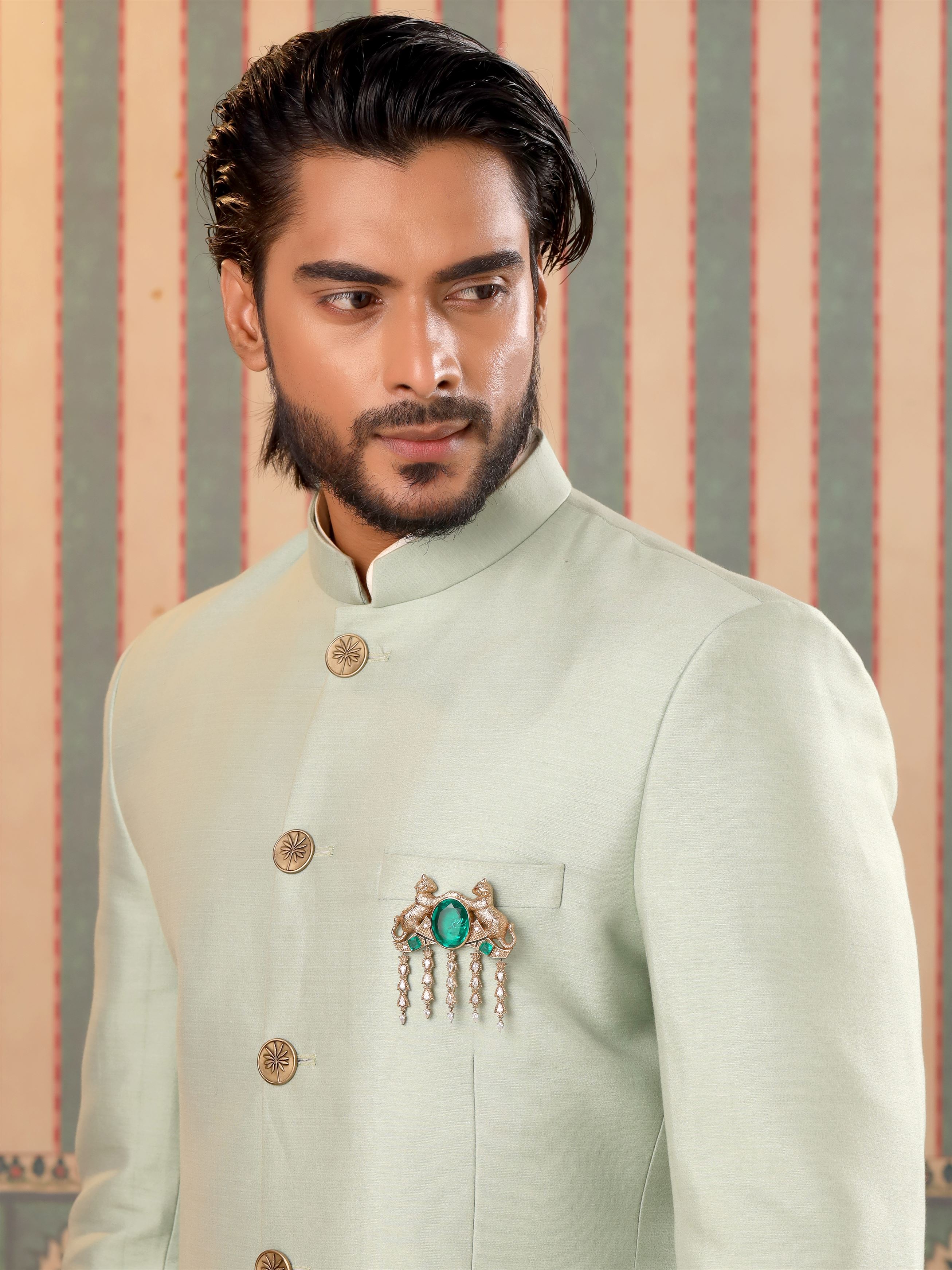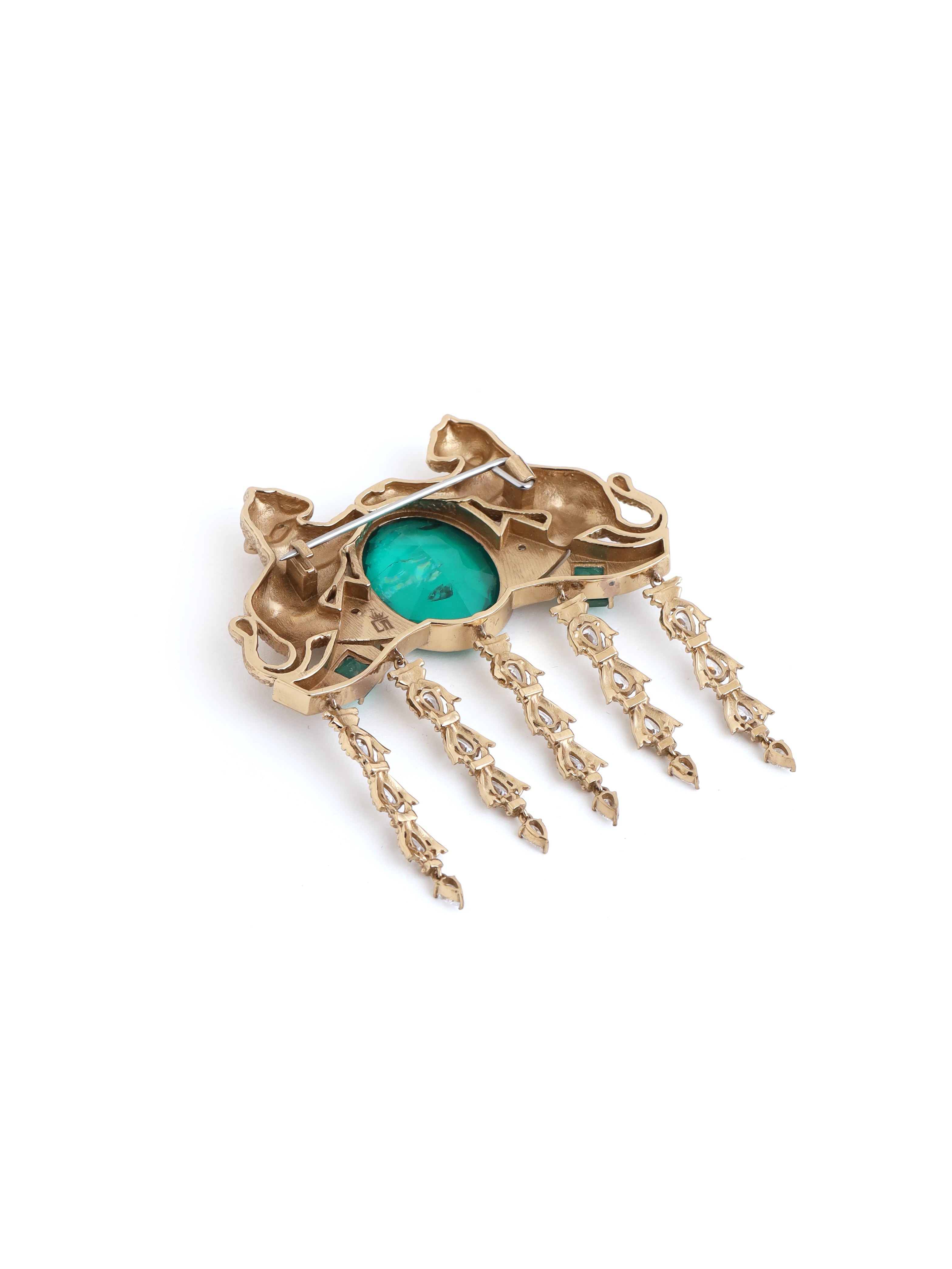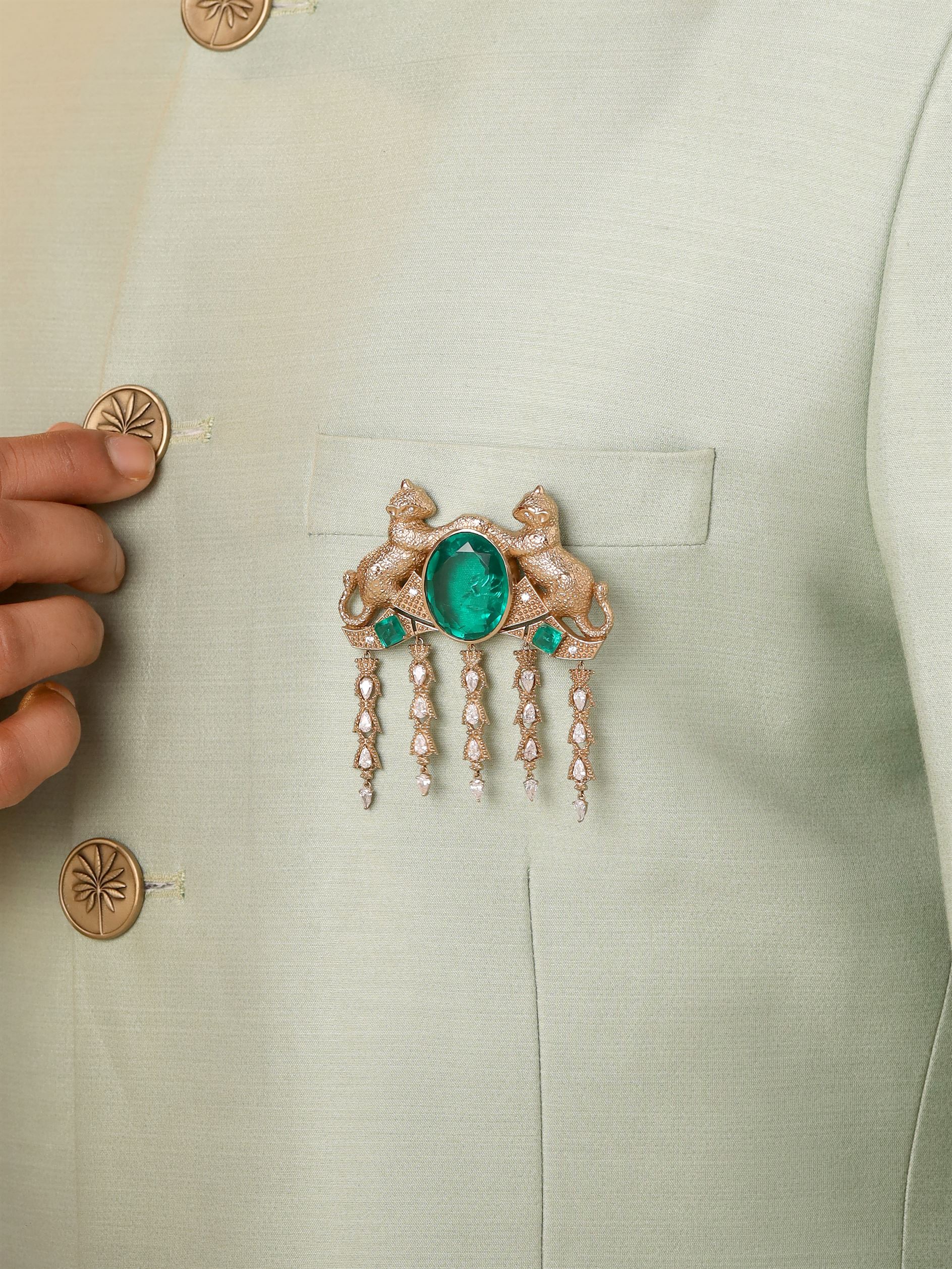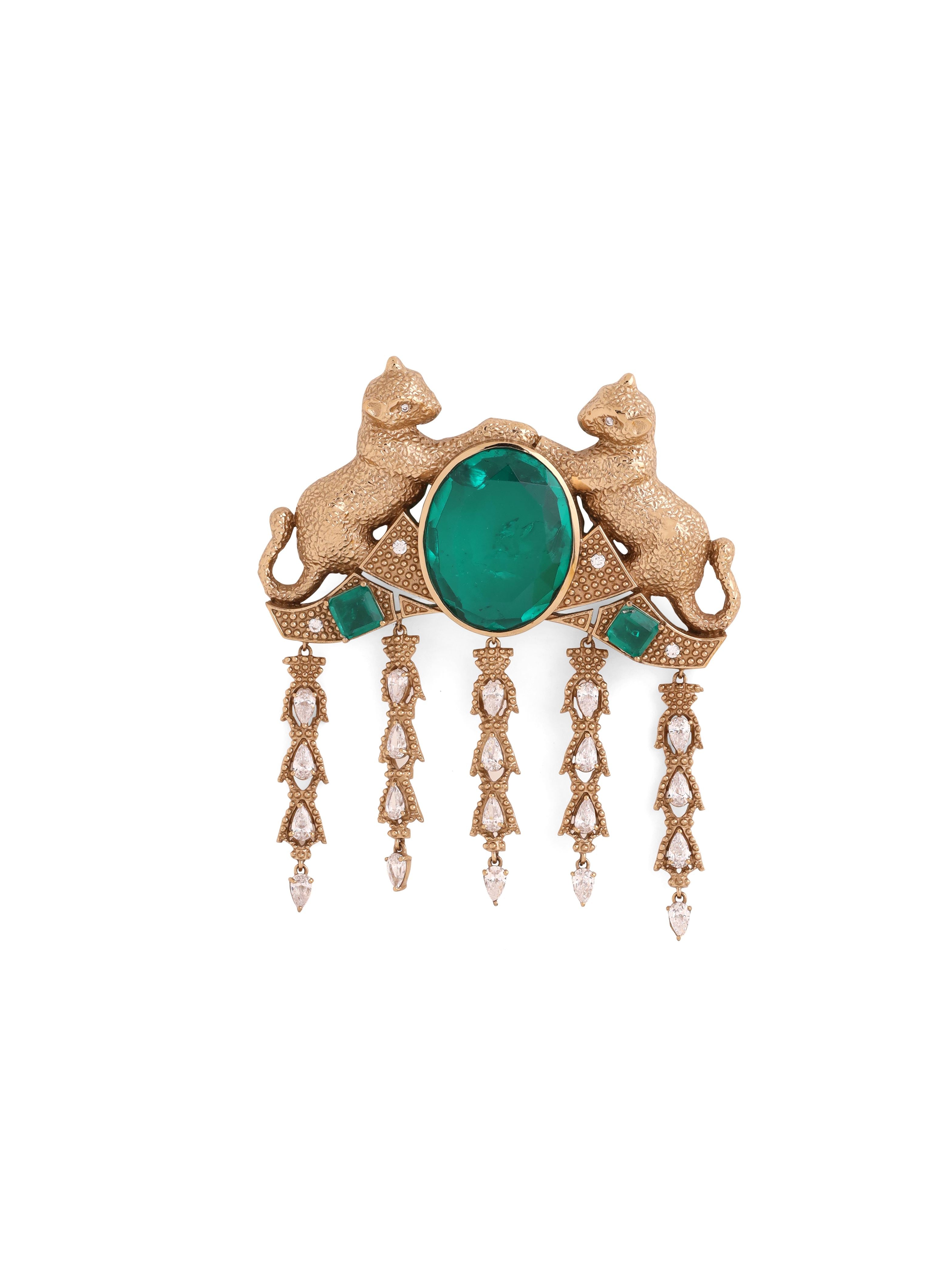 Embrace the sleek and sophisticated charm of the "Tez Cheetah Brooch," a captivating tribute to the grace and elegance of the fastest feline. This alluring accessory features two intricately designed cheetahs in a dynamic pose, exuding a sense of power and allure. Crafted with finesse, the brooch captures the cheetahs' lithe forms and distinctive spots. Adorned with two small green gemstones below them and a magnificent green gemstone in the middle, it adds a touch of wild sophistication to your style.