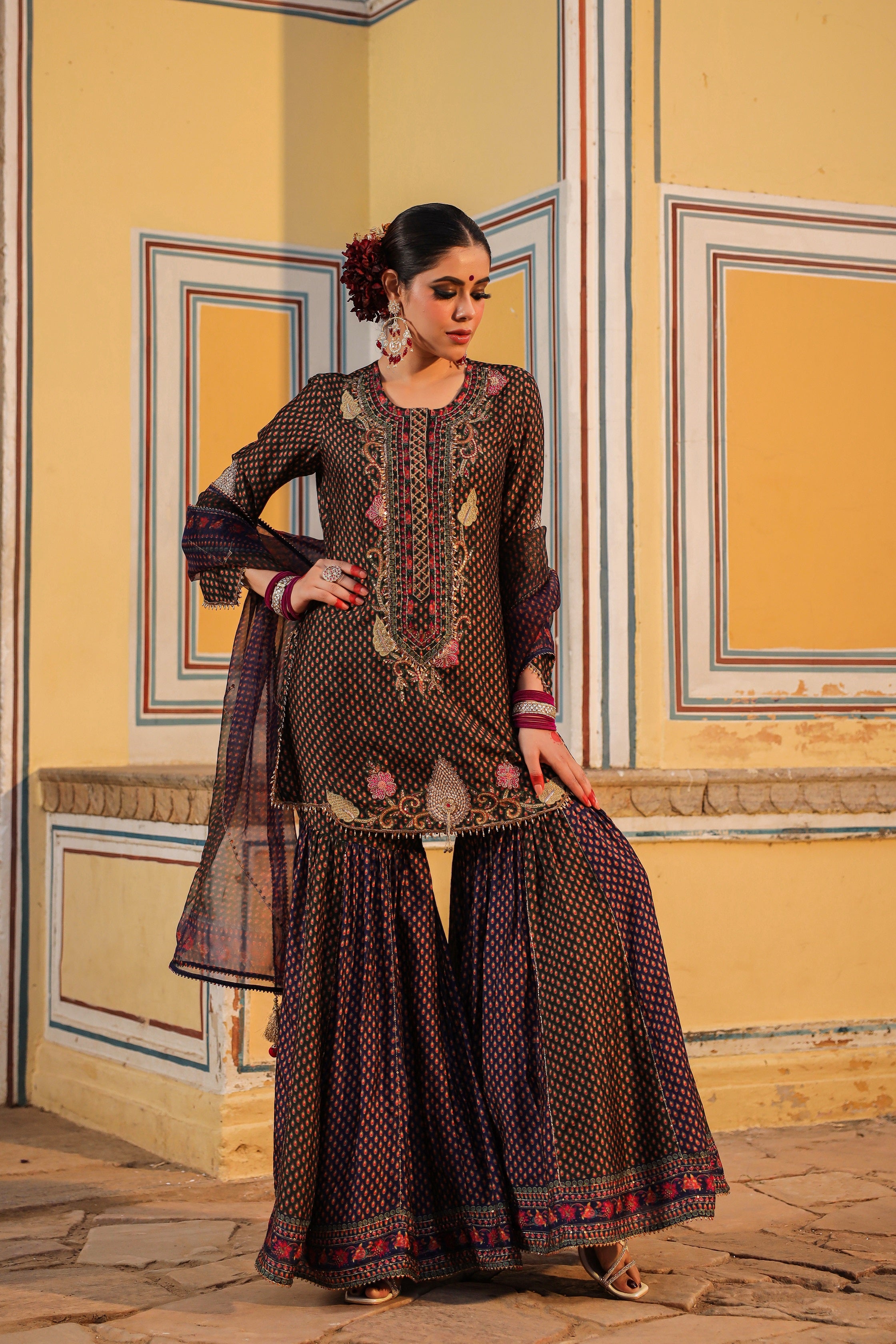 "short shirt and check garara in tissue with garden theme embroidery and a striped banarsi dupatta "