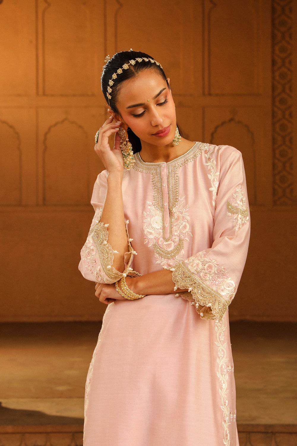 The long A-line ensemble is made in pure silk chanderi fabric teamed up with a palazzo and a silk organza dupatta. The outfit is having a zero neck with placket and three-quarter sleeves. The outfit is adorned with Kashmiri tilla and parsi gara embroidery highlighted with basra moti. The whole outfit is finished with scallop detailing.