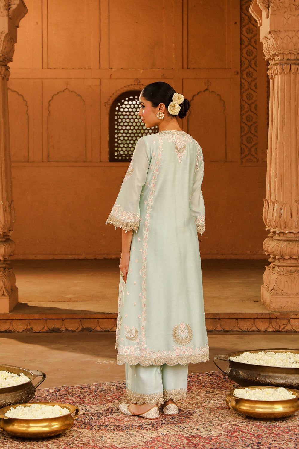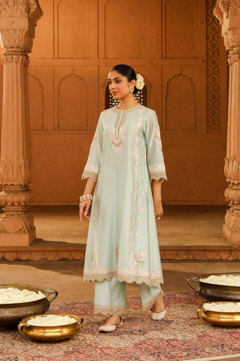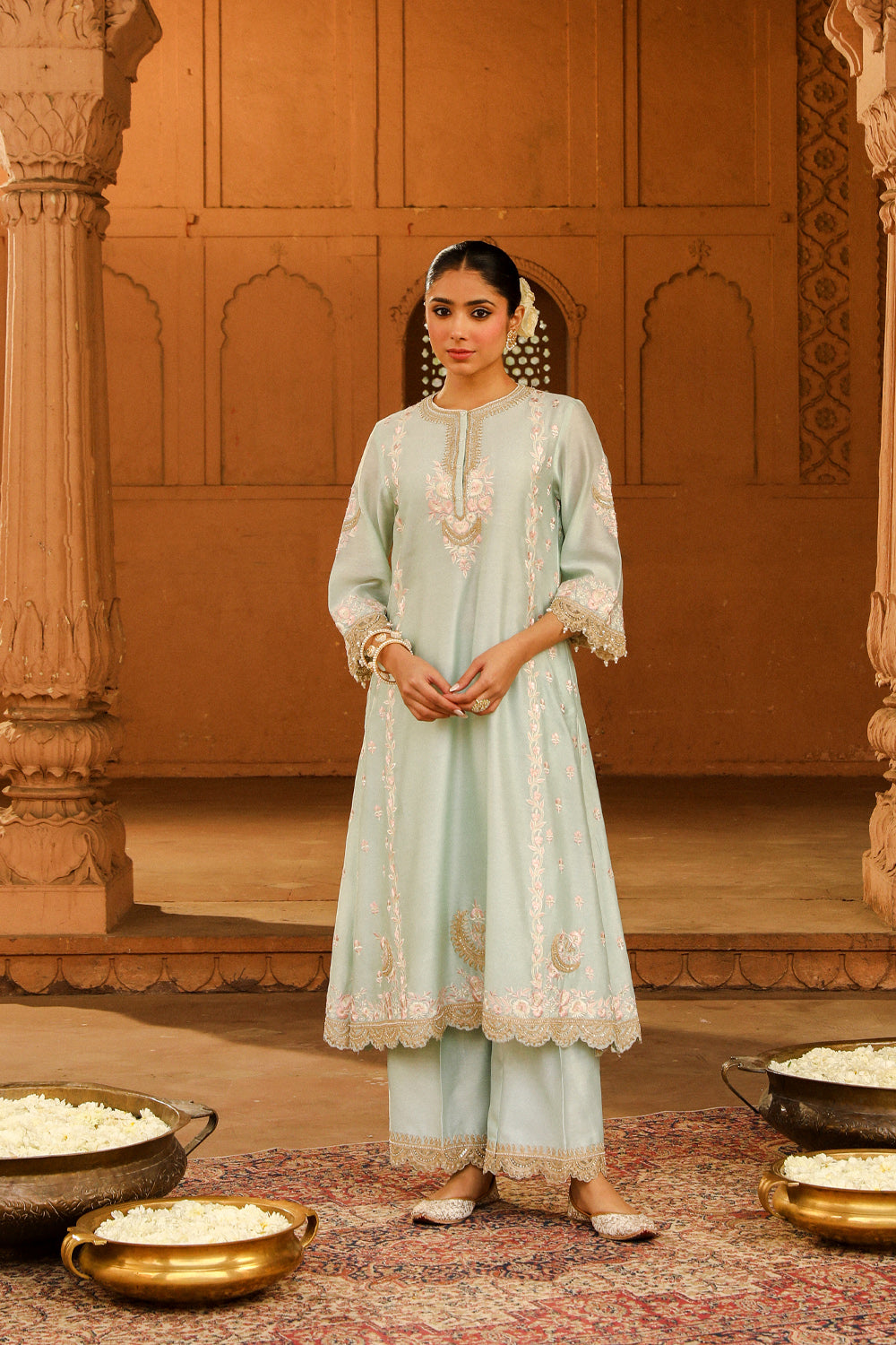 The long A-line ensemble is made in pure silk chanderi fabric teamed up with a palazzo and a silk organza dupatta. The outfit is having a zero neck with placket and three-quarter sleeves. The outfit is adorned with Kashmiri tilla and parsi gara embroidery highlighted with basra moti. The whole outfit is finished with scallop detailing.