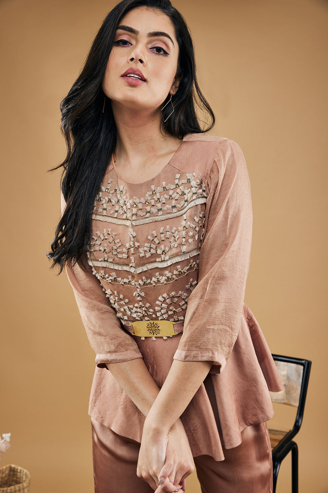 Mauve Azra Zip Embroidered Peplum Top And Pants Paired With A Belt.