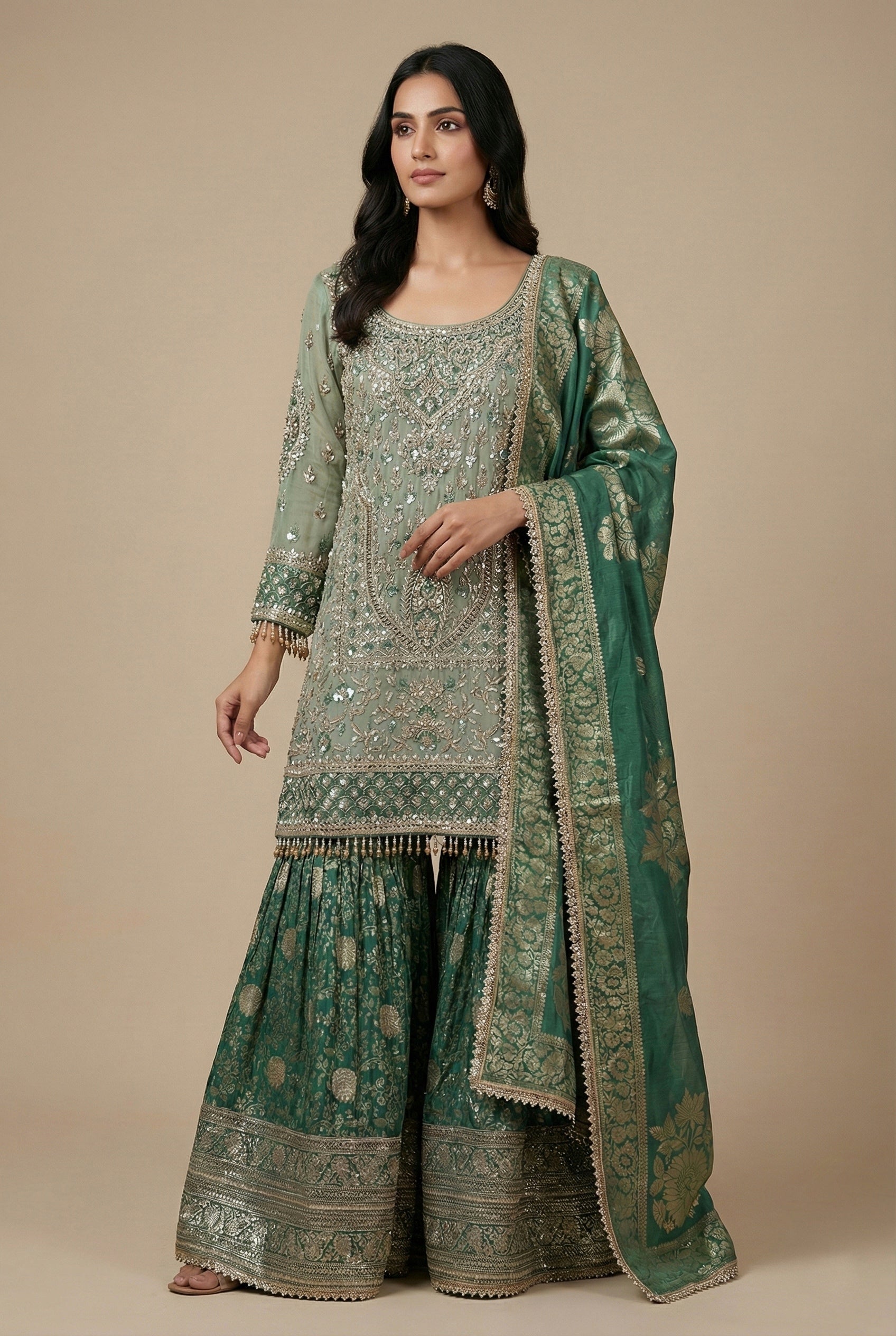 This Is A Traditional Designer Gharara Set In Elegant Shades Of Mint Green And Emerald Green, Showcasing A Luxurious And Regal Aesthetic Perfect For Festive Or Wedding Occasion. Crafted In A Mint Green Silk Base Richly Adorned With Intricate Hand Embroidery. Features Zari, Sequins, Beads, And Mirror Work Throughout The Front Panel. The Neckline Is A Deep Round Style Beautifully Highlighted With Heavy Embellishments. Sleeves Are Elbow-Length With Detailed Embroidery And A Delicately Designed Border At The Cuffs. The Hemline Is Finished With A Beaded Fringe Border, Adding A Touch Of Sophistication And Charm.