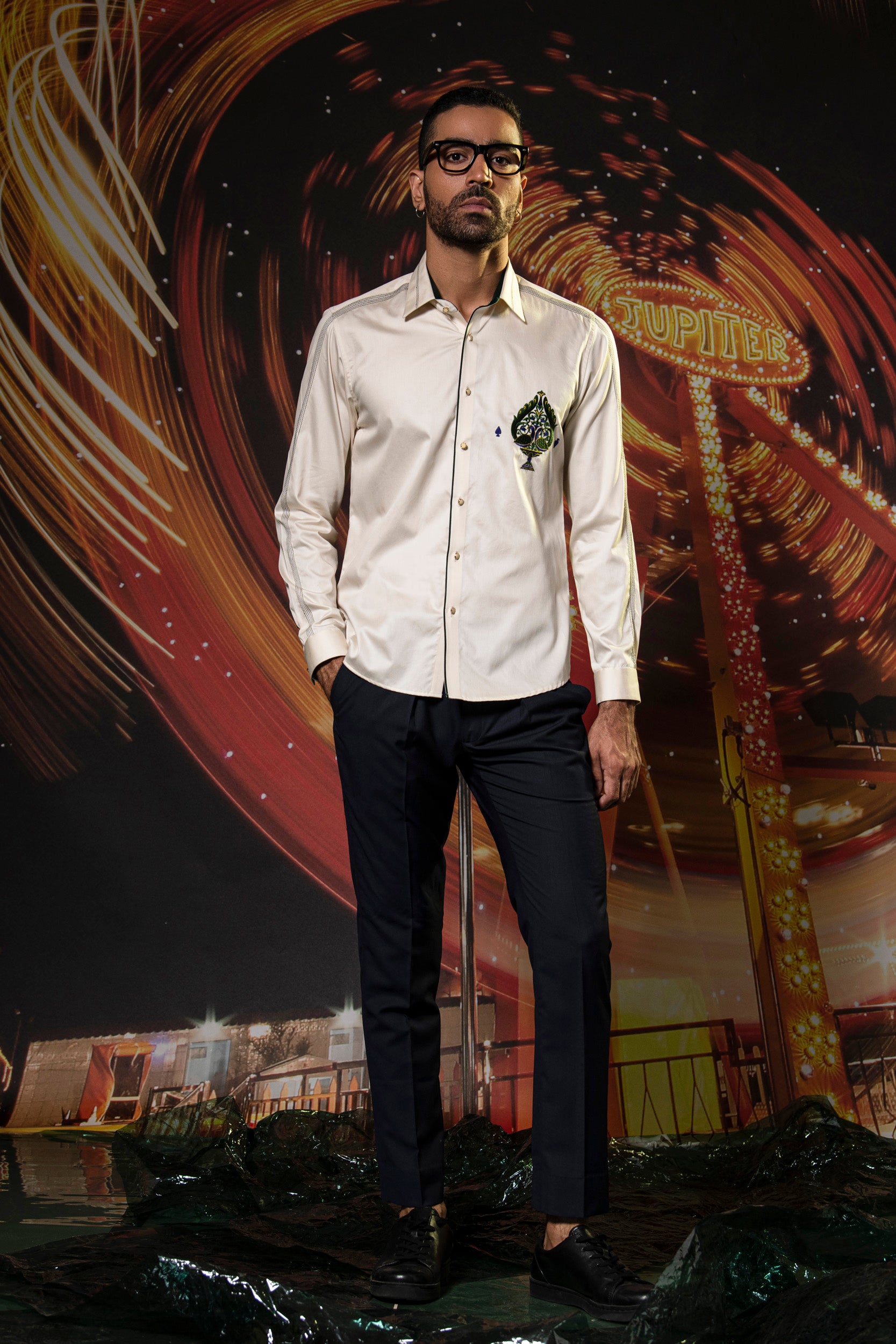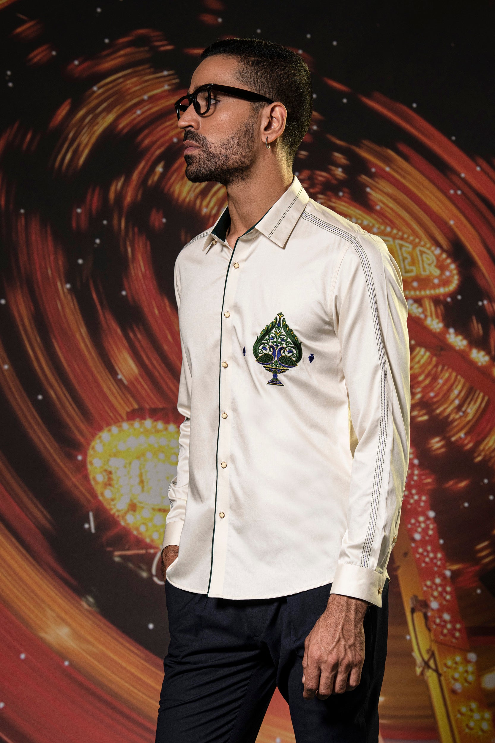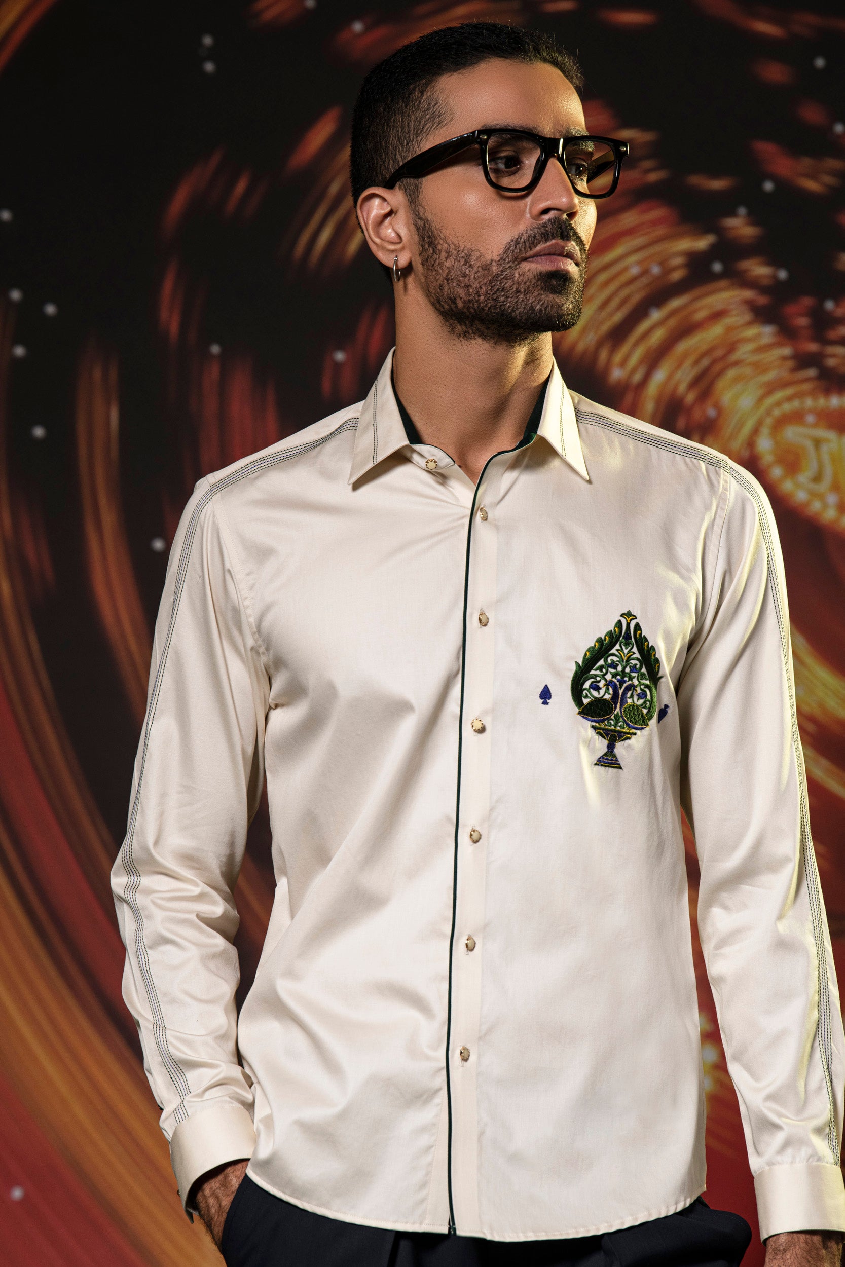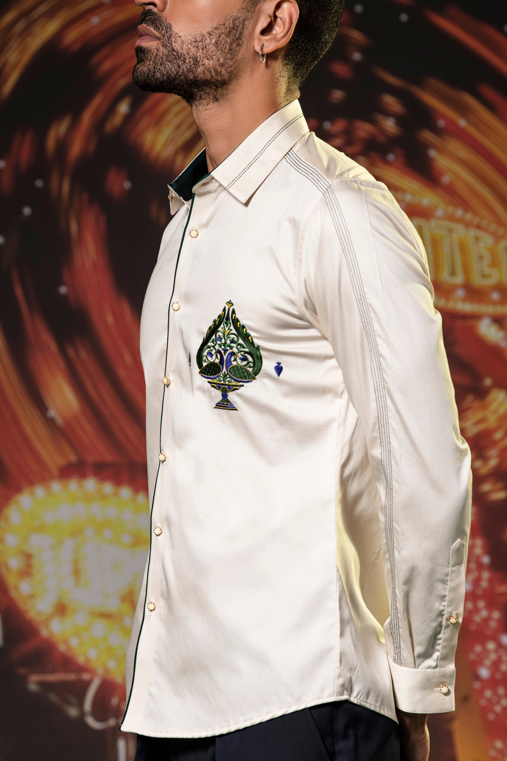 Featuring a beige shirt in cotton base with contrasting green piping detail and peacock embroidery. Perfect wear for parties and cocktail ceremonies.