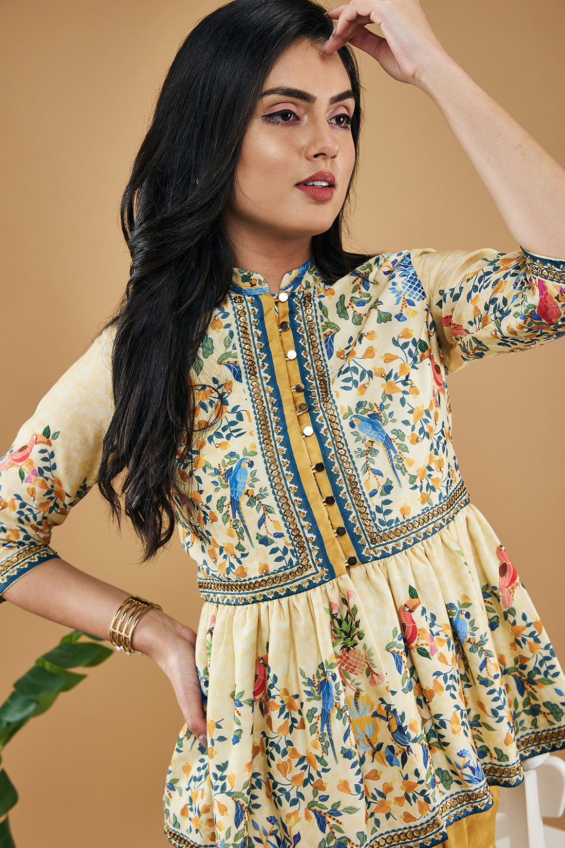 Yellow Bird And Tile Embellished Peplum Top And Drape Skirt In Cotton Silk