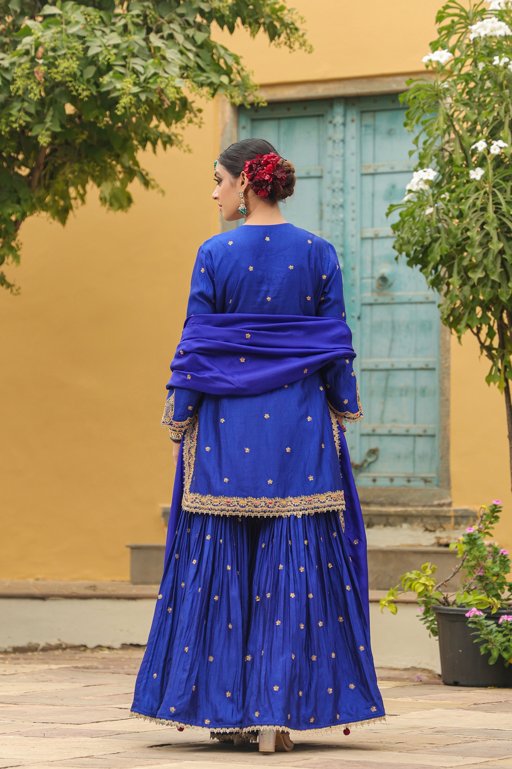 | This 3pc Sharara Set comes with Zari dori embroidery on the neck and hem line of the kurta and enhanced with colourful resham thread work Sharara comes Tikkis &sprinkle of buttis Paired with a beautiful embroidered dupatta with lace and latkans |